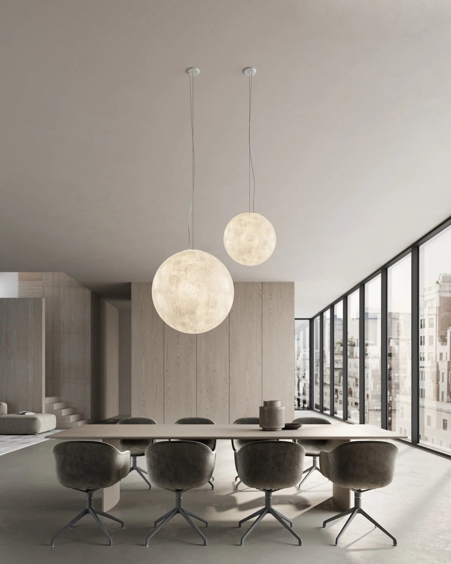 Crafted from white-painted fibreglass, this pendant fixture beautifully transforms the captivating influence of the moon into a warm and inviting glow. Diffusing a glare-free light, it adds a soothing ambiance to any living space and creates a visually appealing focal point over a dining table, in a bedroom or living room. Its rounded shape adds a sense of volume, while its warm white tones bring a touch of serenity to any interior. Available in small or large.