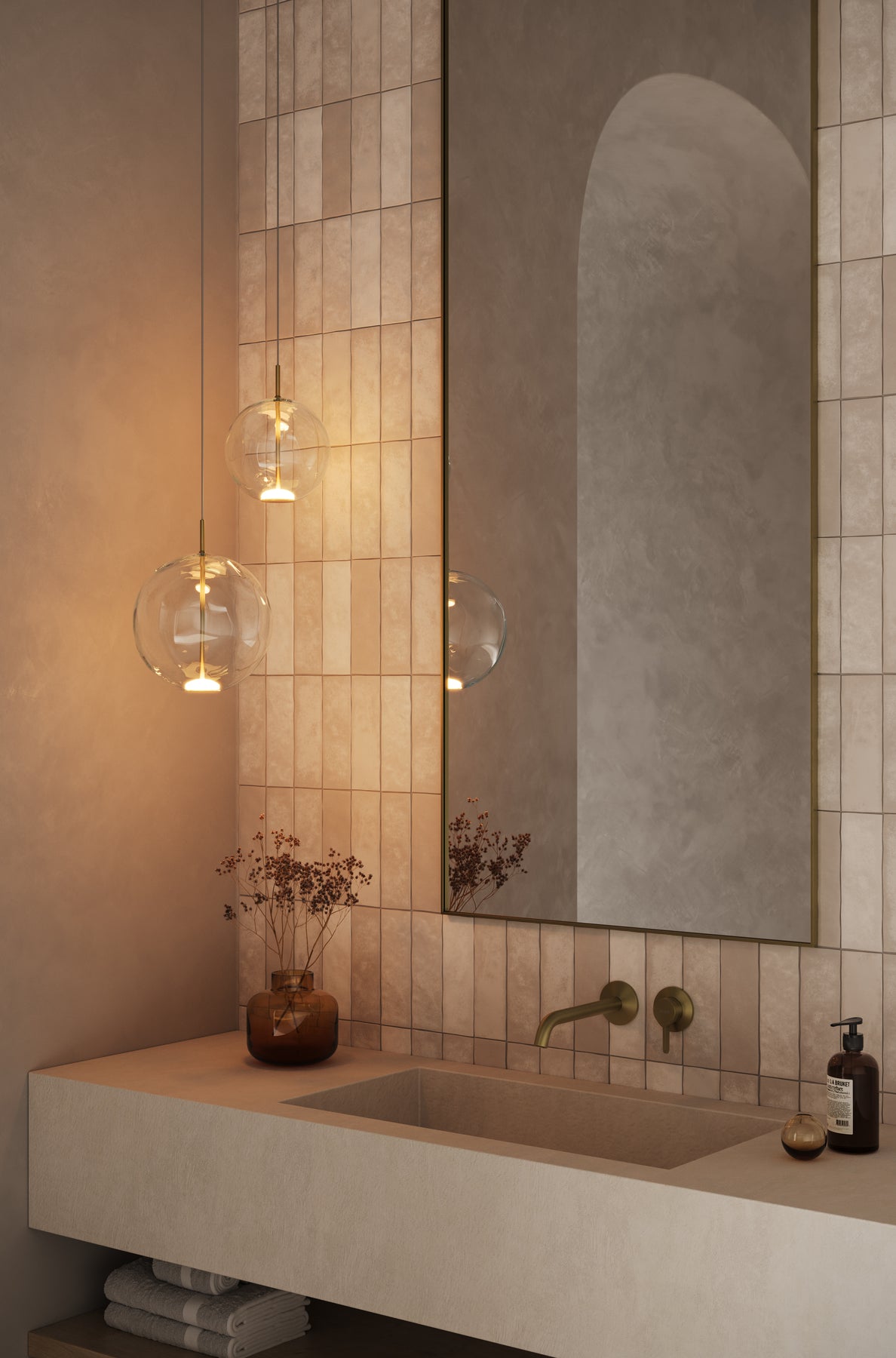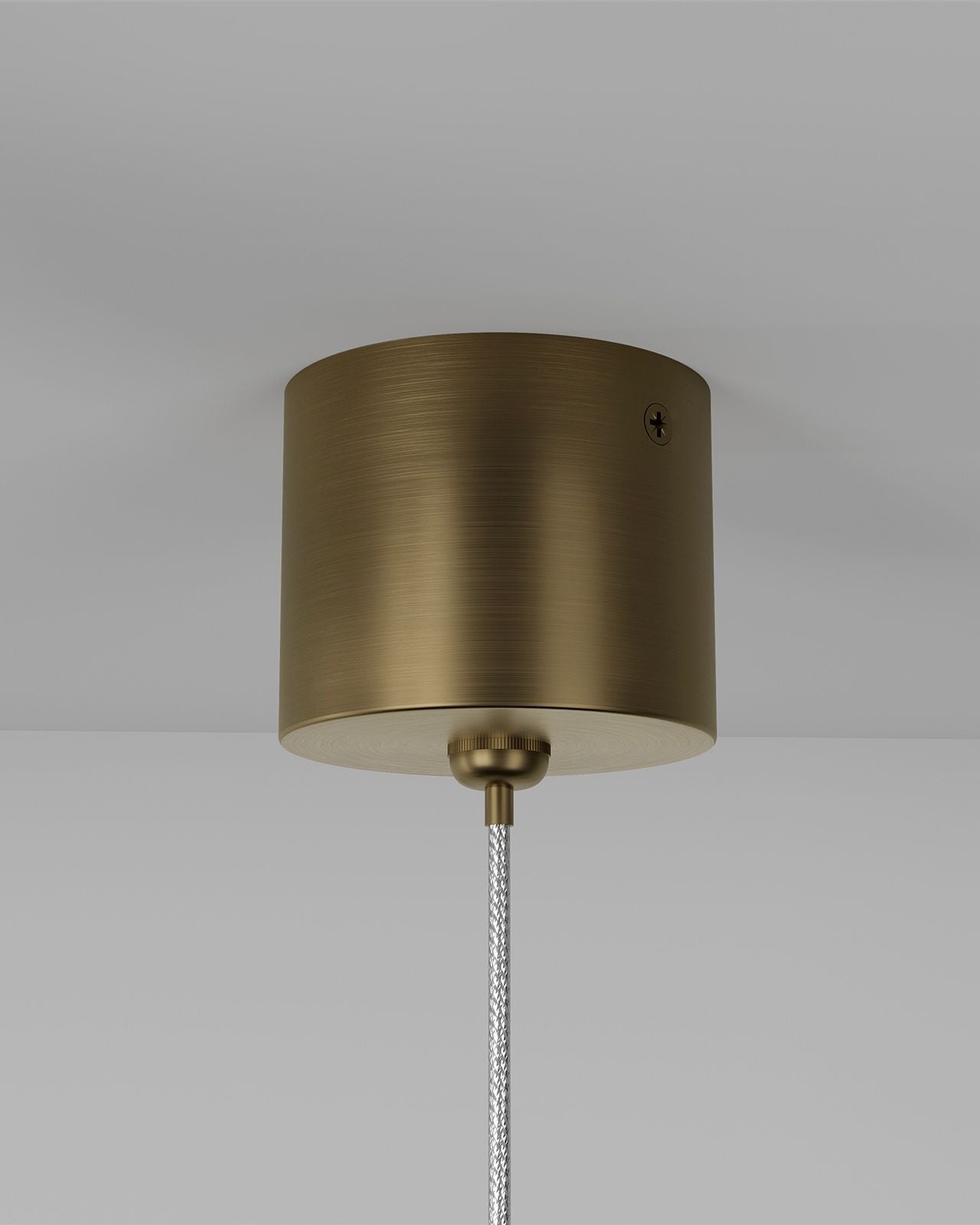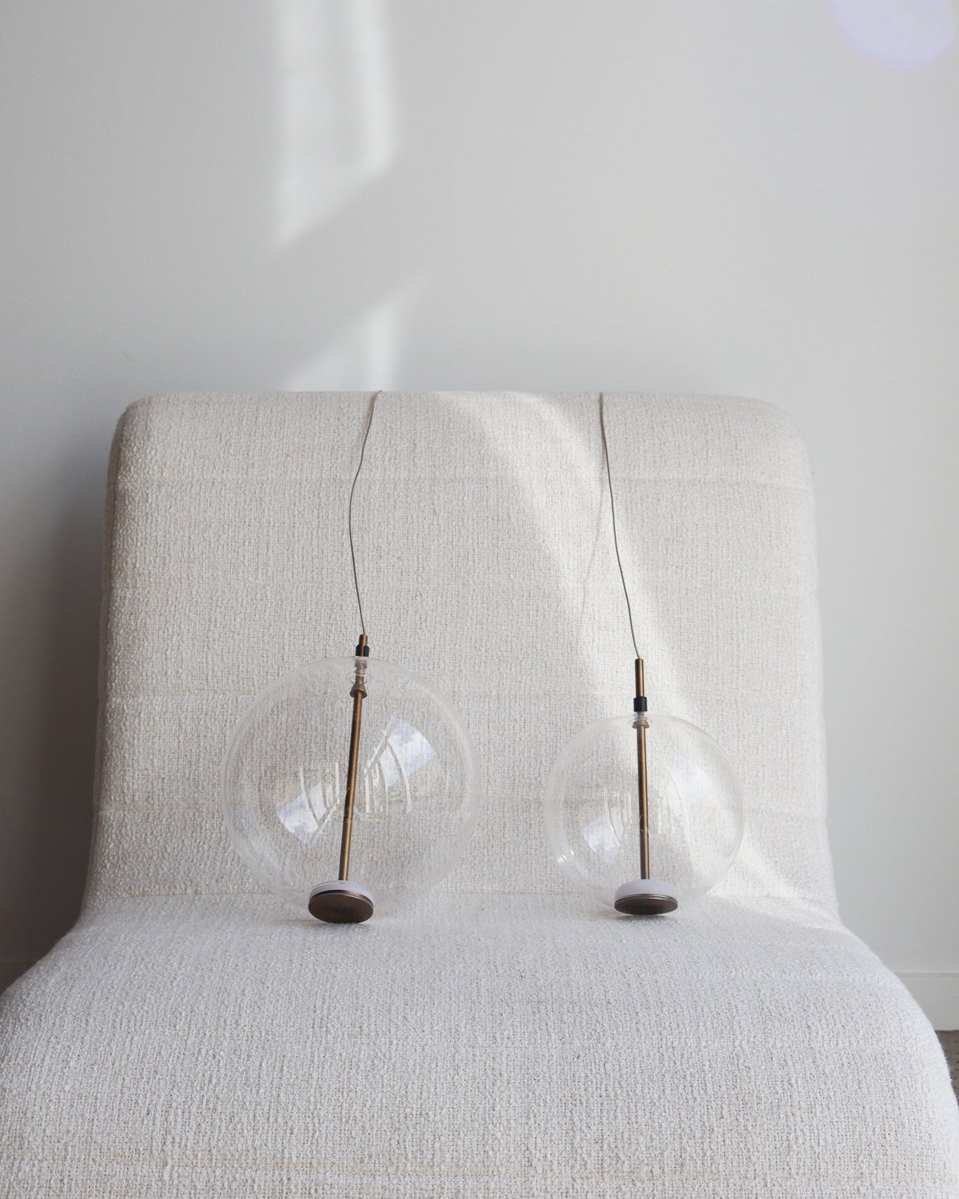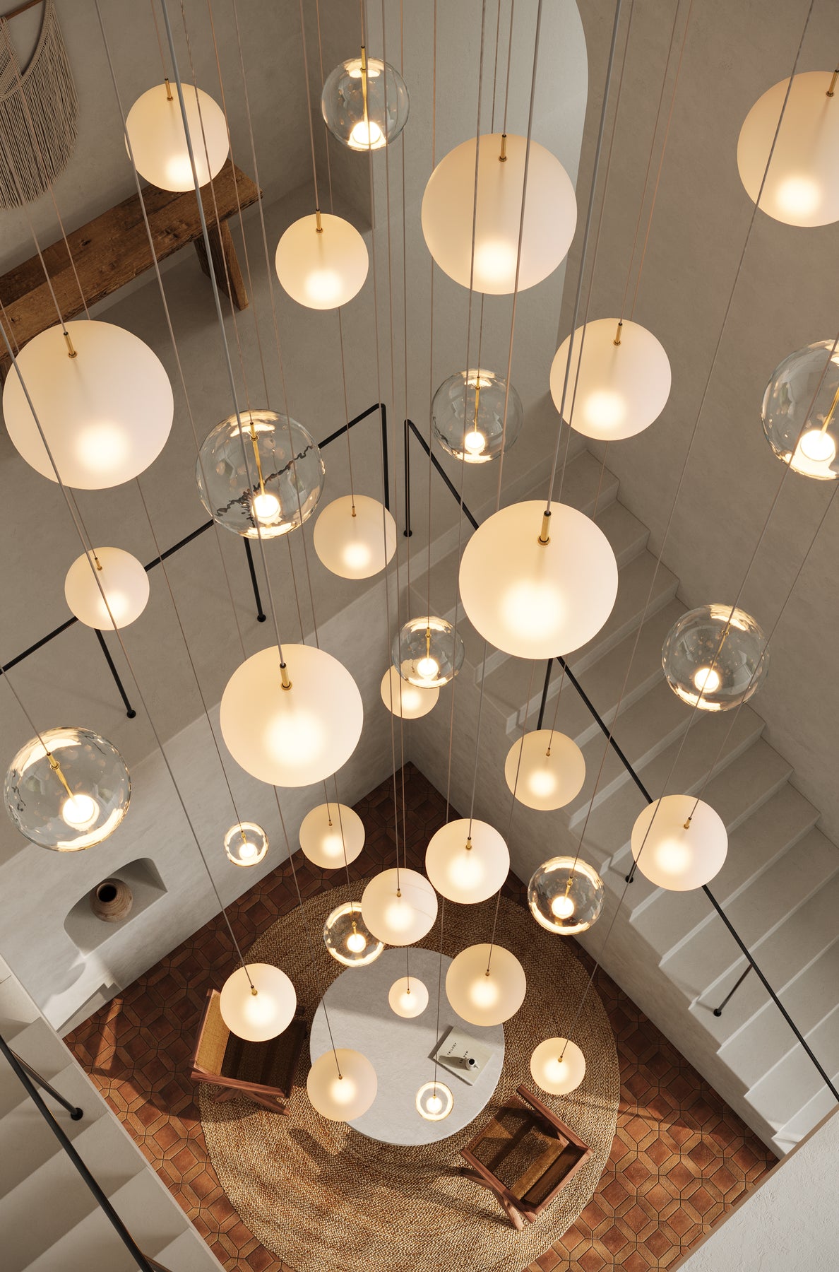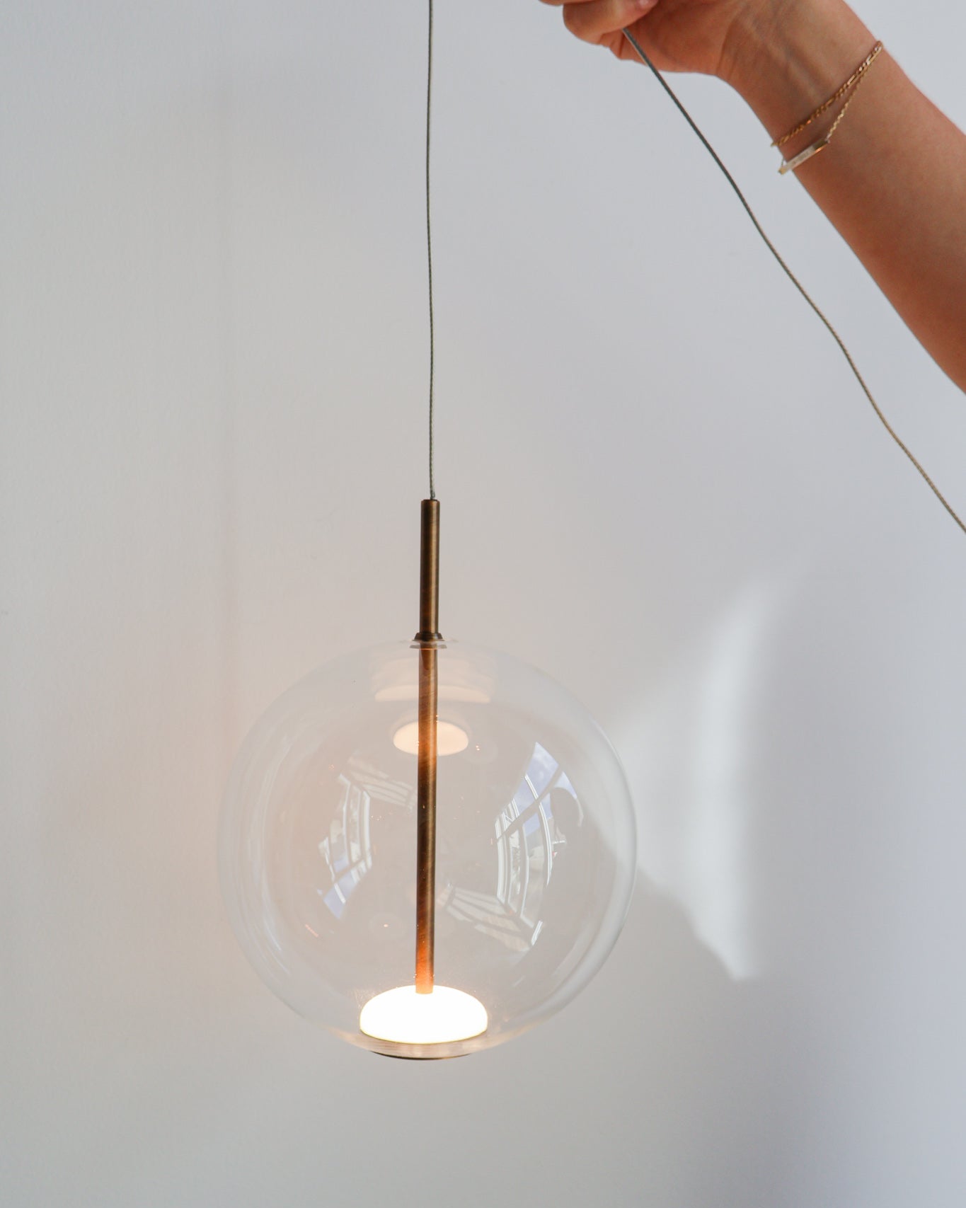 This Floating Orb Pendant is expertly crafted from borosilicate glass to create a sense of delicate weightlessness. Its elegant design features a brass rod intersecting the sphere, holding a radiant dimmable LED light. With a celestial ambience and a fusion of contemporary aesthetics and timeless elegance, this pendant is available in three sizes and two finishes, providing flexibility for individual suspensions or cluster arrangements.