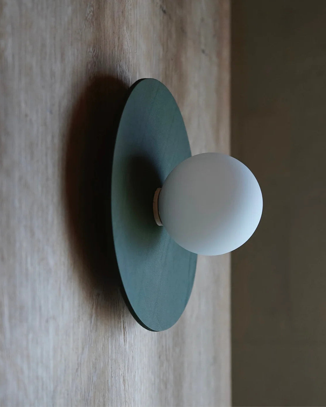 Wall-mounted light fixture with a green base and white bulb on a wooden surface.