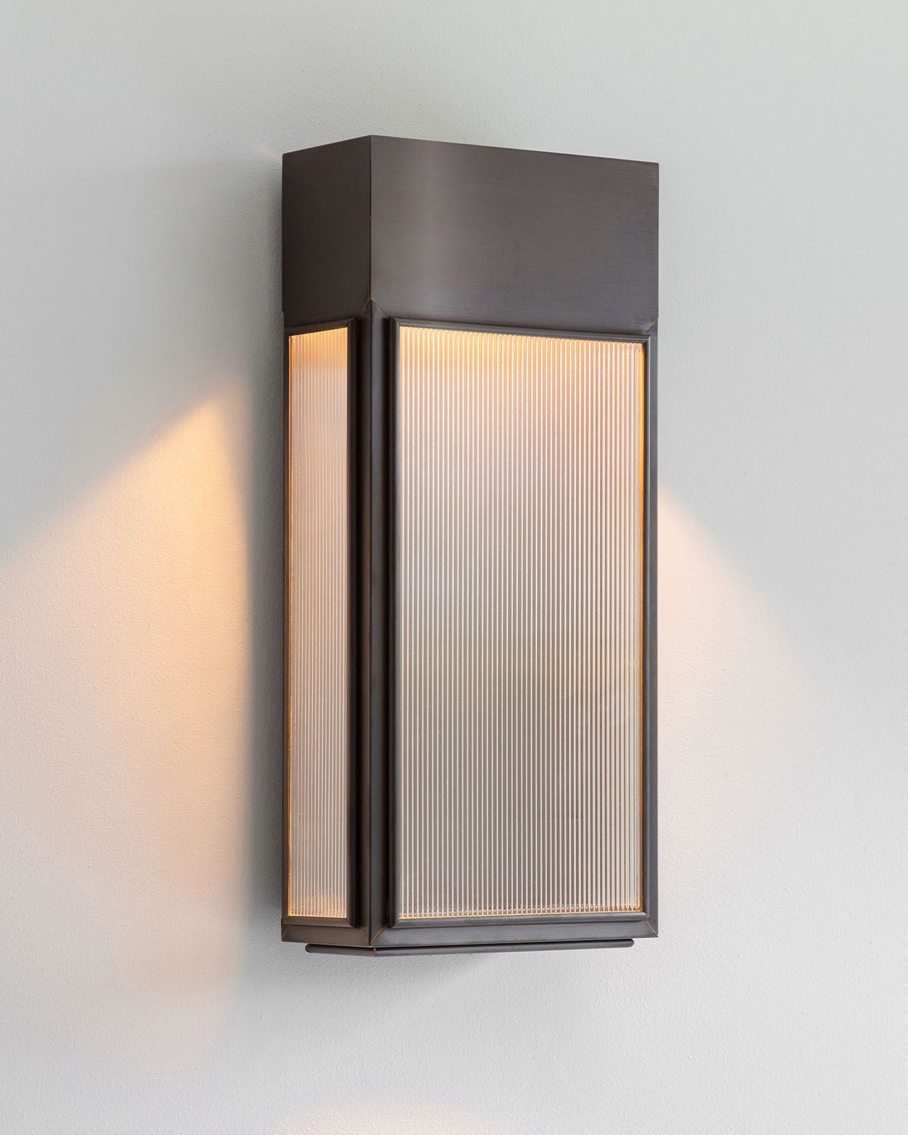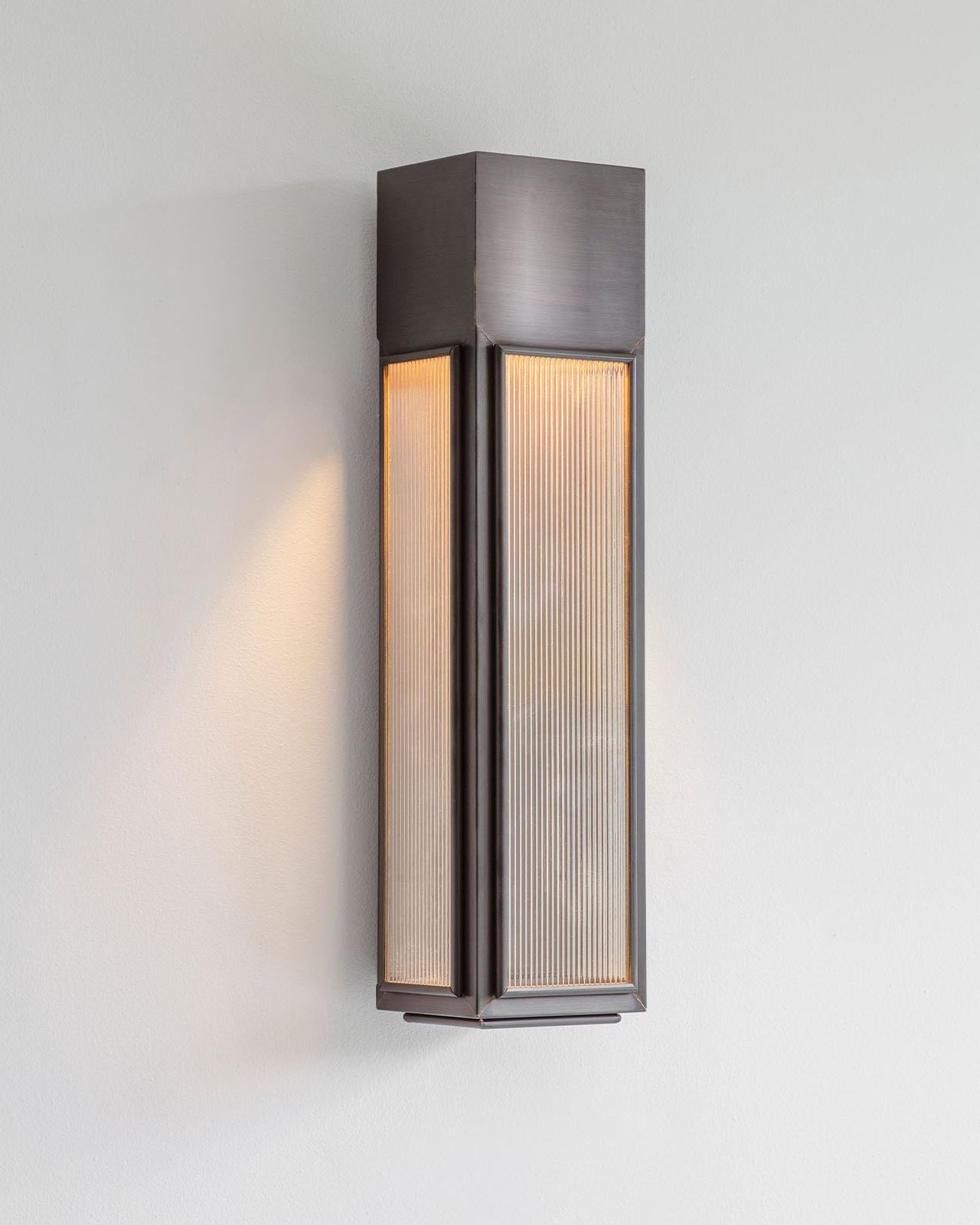 Its form is slender and linear, emanating a classic box lantern style, yet it adds a layer of quiet texture with the glass feature. Available in Antique Brass or Bronze, this discreet yet characterful design creates visual balance: sculptural when unlit, atmospheric when aglow.