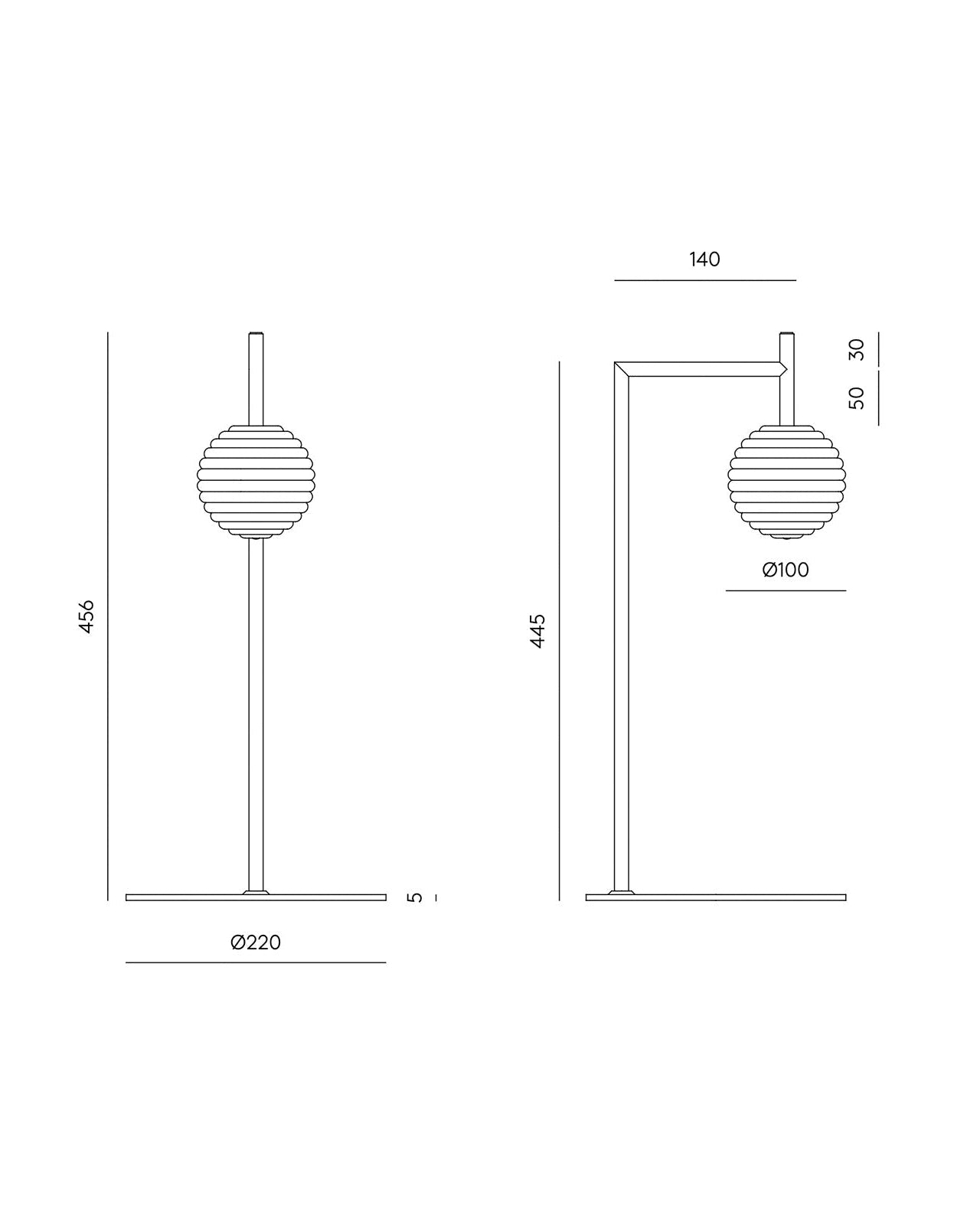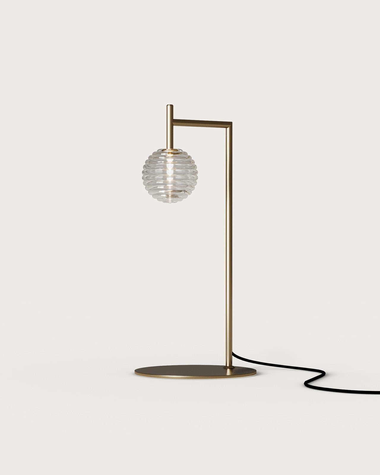 Available in matte black or aged gold finish, the refined sleek metal table lamp is composed of a short angled arm holding an elegant ridged glass sphere. Reminiscent of jewels, the shade will provide a soft warm light creating a cosy ambience. This timeless design will perfectly suit a contemporary living room displayed on a side table or a modern bedroom as a bedside lamp.