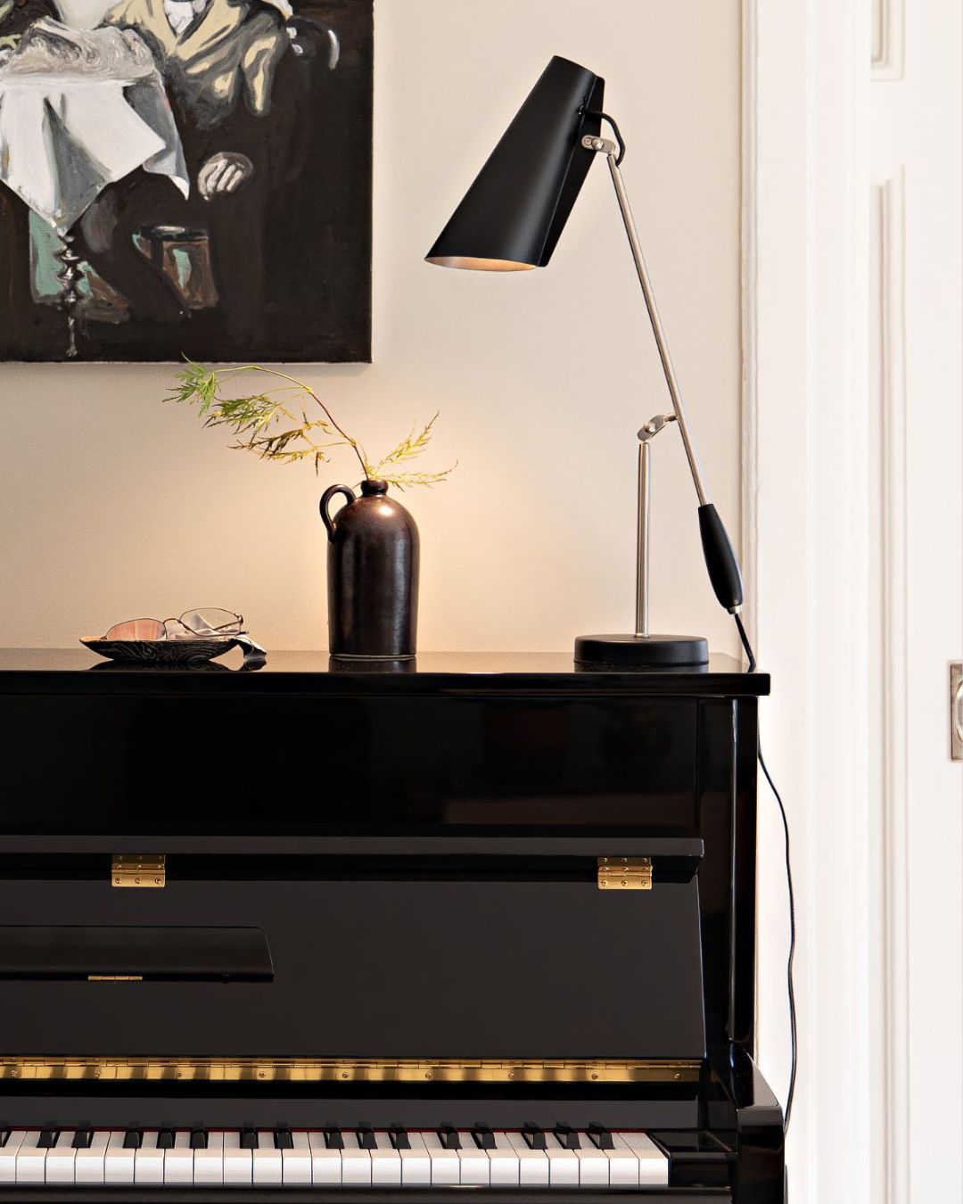 Black piano with Mid-Century Adjustable Table Lamp and decorative items on a white wall background
