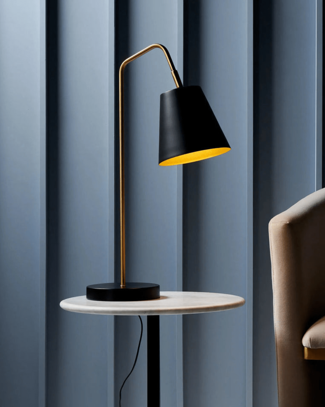 The lamp features a sophisticated Matte Black exterior that offers a velvety, low-sheen finish, ensuring it blends seamlessly into any color palette. The true magic, however, lies within. The burnished gold interior of the shade acts as a natural reflector, bathing your room in a warm, honeyed glow that avoids the harshness of standard desk lamps.