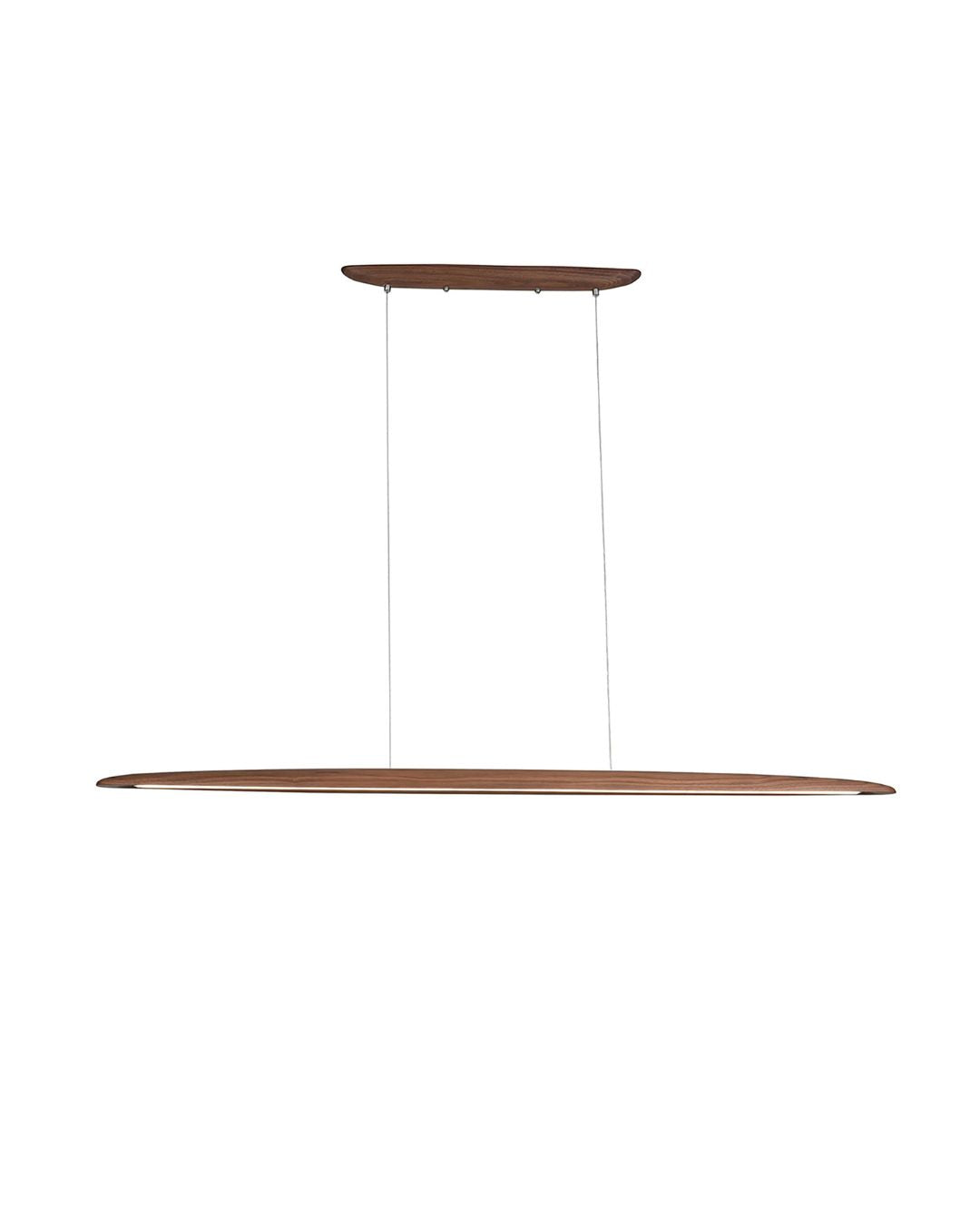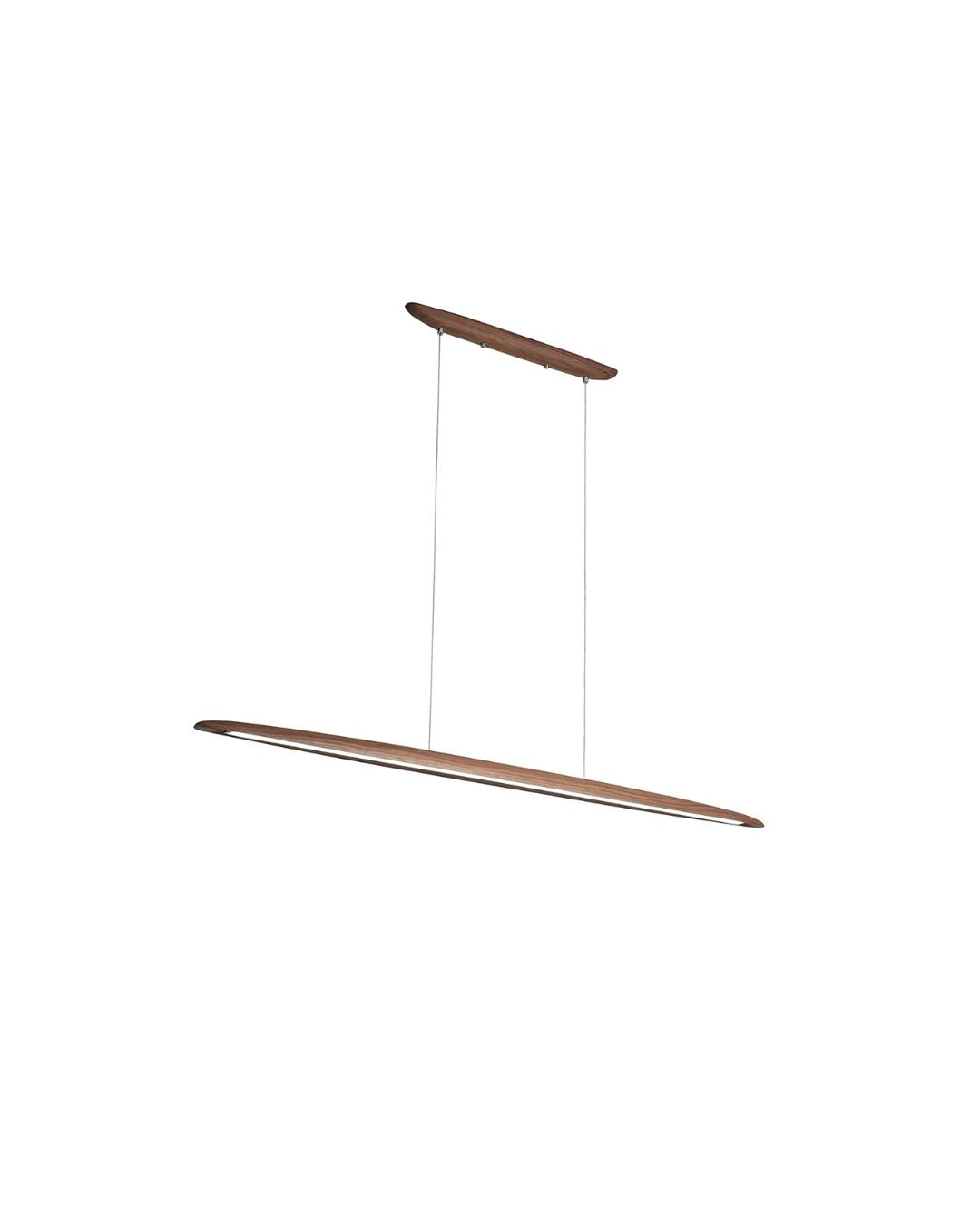 The Curved Timber Linear Pendant is made from Walnut timber with a matching ceiling canopy. Featuring an integrated TRIColour LED, this pendant can be conveniently switched between warm, cool and neutral light depending on the desired atmosphere. Ideal for installation above dining room tables and kitchen benches, ts graceful arc combines contemporary design with natural materials, creating a focal piece that complements organic and modern interiors.