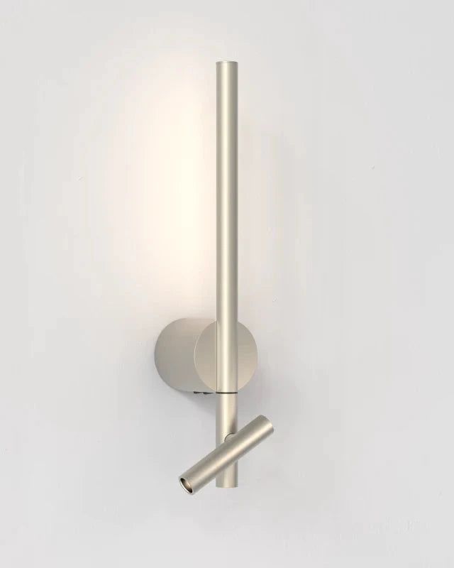 Ideal over bedside tables or near a desk, this sleek modern wall light features two metal lines intersecting at harmonious angles and can be mounted either vertically or horizontally. While the long slender rod provides a gentle and ambient indirect glow, the adjustable spotlight spreads a direct light perfect for reading time. This functional yet minimalist fixture is made from aluminium, is available in matt nickel or matt black finish and will easily enhance contemporary, modern or minimalist interior spaces.