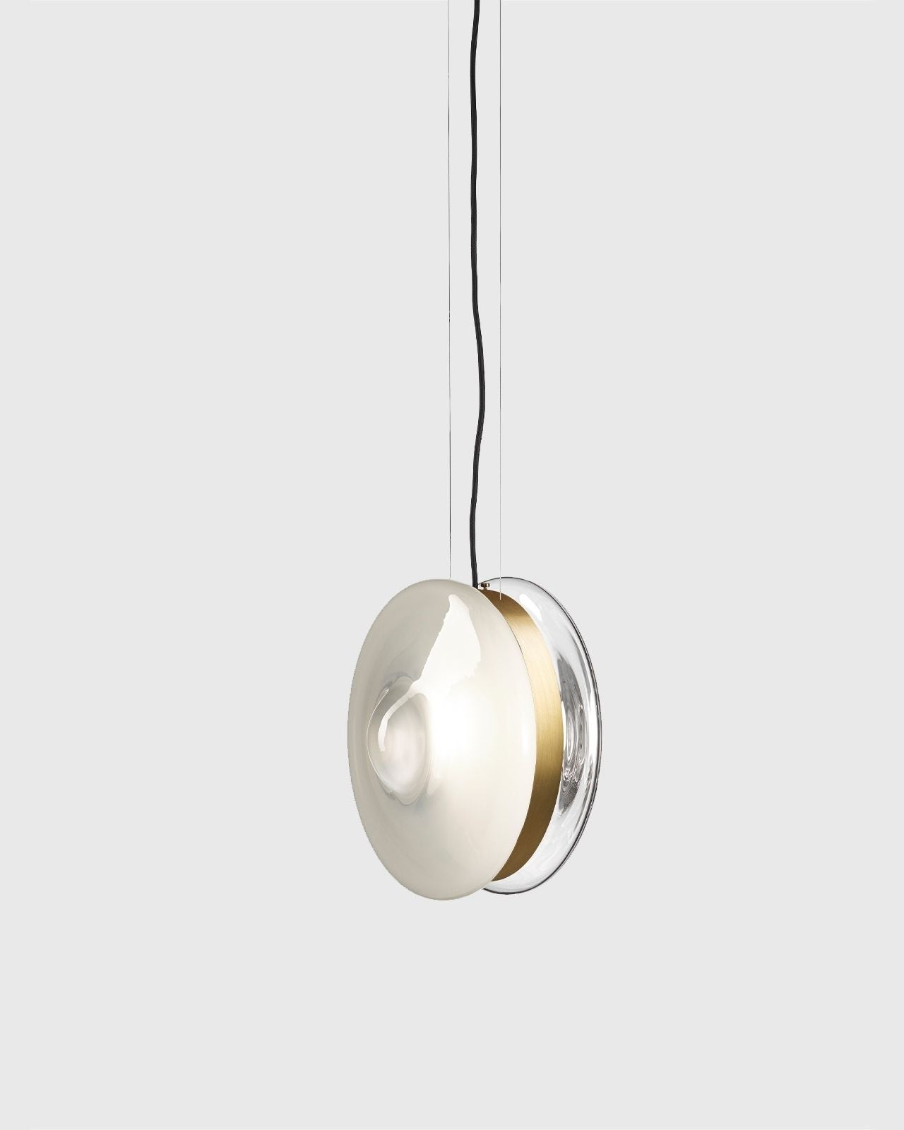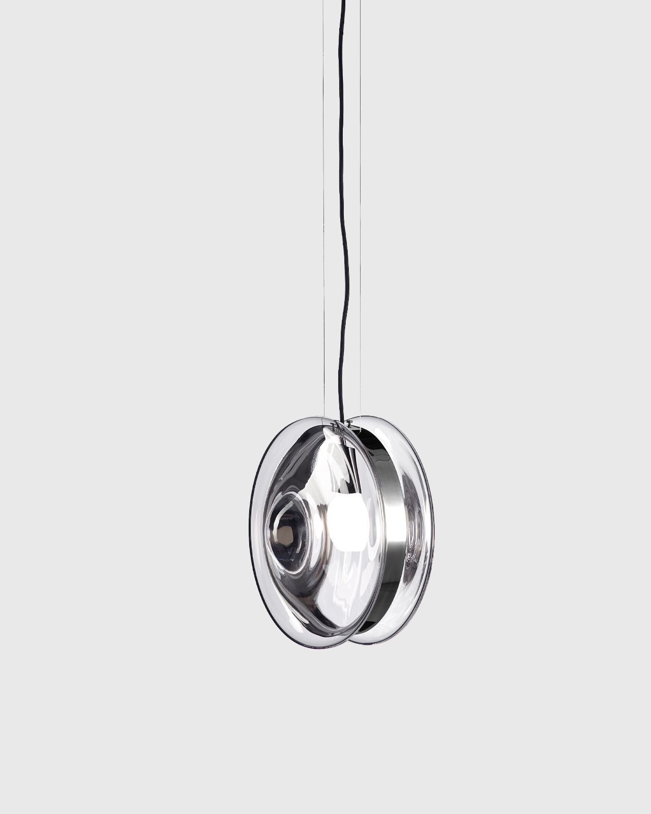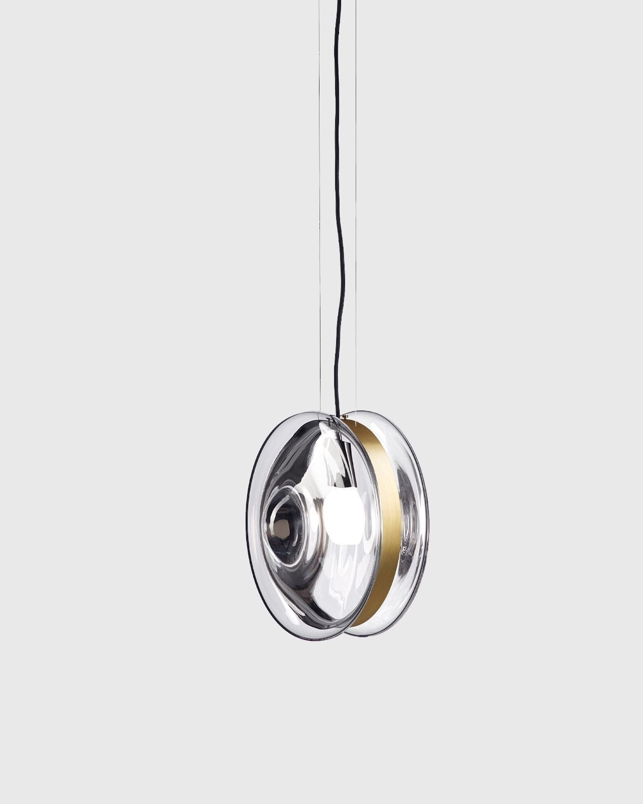 Creating a magical atmosphere, this hypnotic pendant light features two mouth-blown glass lenses which are ingeniously held together by a metal circular mounting. Of the two lenses, one will always be in a clear finish while the second can be in a moonlight clear, venus pink, mercury black or polaris white colour. The elegant metal structure is available in either silver or patina gold finish to suit any modern or contemporary interior style. As a group or a singular pendant, this fixture will refract a harmonious light around, suspended over a dining table, near a bed, or in an entrance hall with high ceiling.