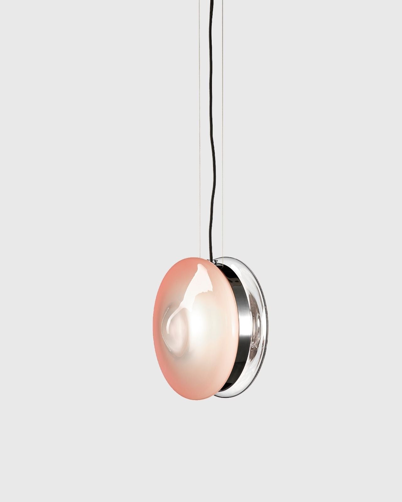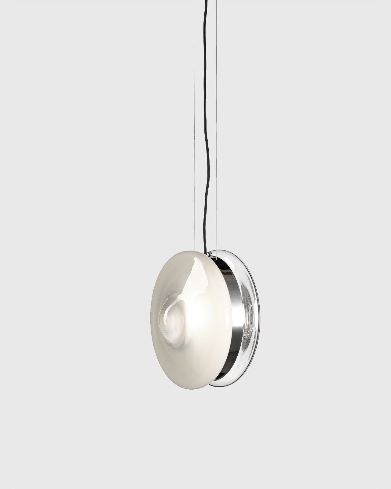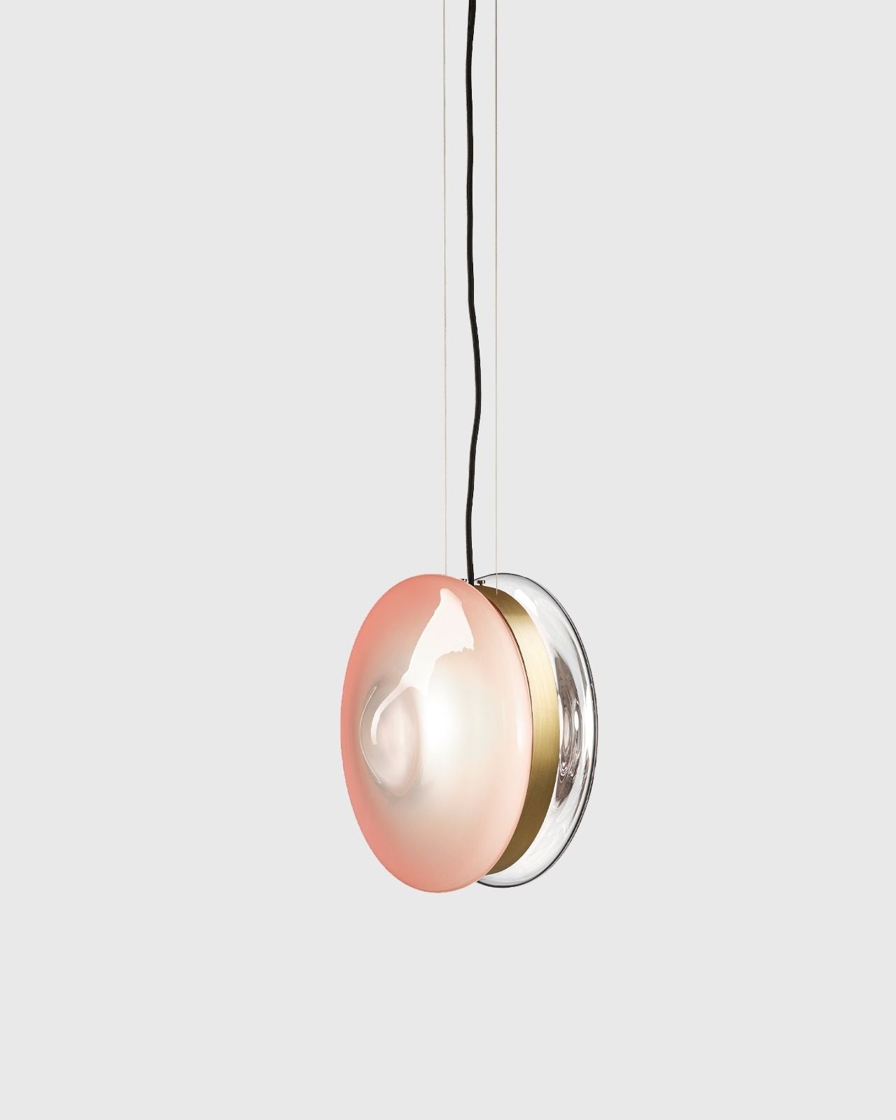 Creating a magical atmosphere, this hypnotic pendant light features two mouth-blown glass lenses which are ingeniously held together by a metal circular mounting. Of the two lenses, one will always be in a clear finish while the second can be in a moonlight clear, venus pink, mercury black or polaris white colour. The elegant metal structure is available in either silver or patina gold finish to suit any modern or contemporary interior style. As a group or a singular pendant, this fixture will refract a harmonious light around, suspended over a dining table, near a bed, or in an entrance hall with high ceiling.