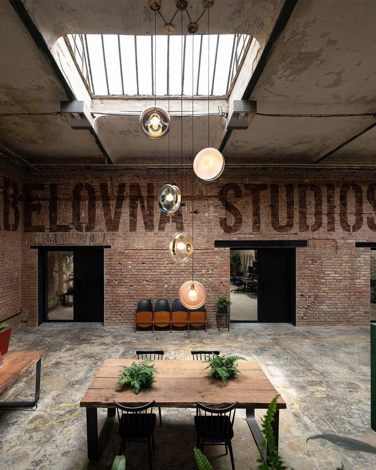 Three Antique Teardrop Pendant Lights hanging in an country artist room over a table