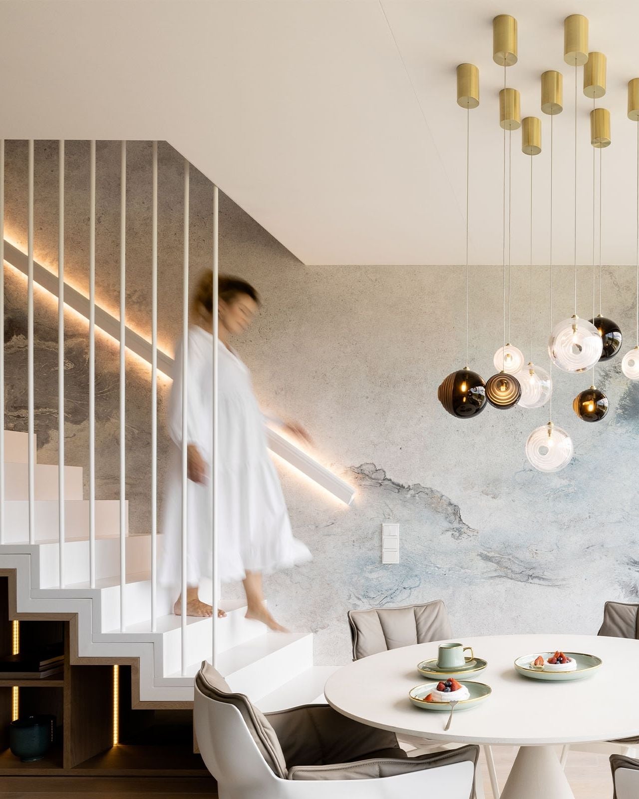 Frosted Tubular Brass Suspended Pendant  6 Light variant displayed in a modern stairwell