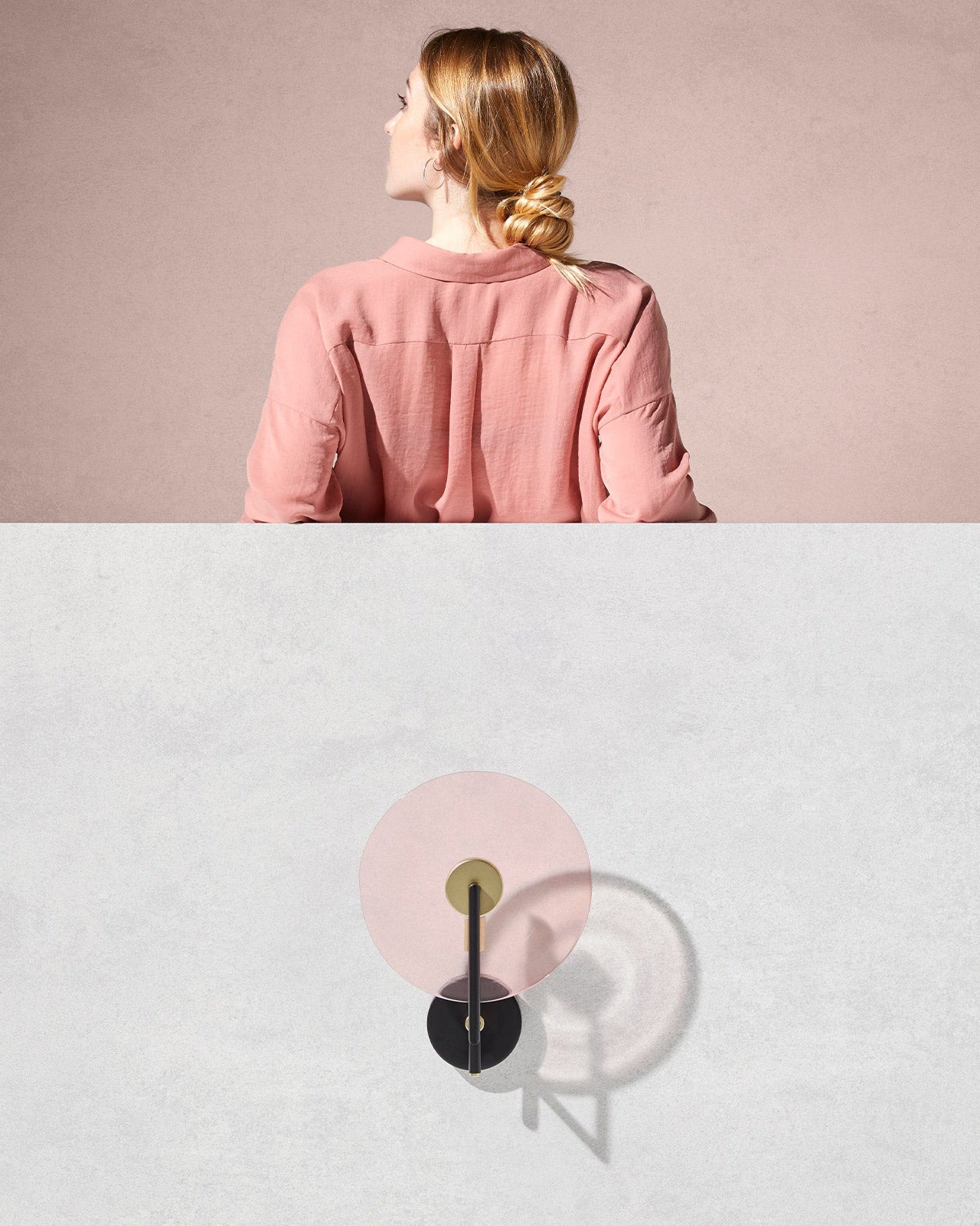 The Large Matte Black Geometric Disc Wall Light combines sleek design with soft, ambient illumination. A matte black metal frame with subtle matte brass accents supports a soft pink glass disc that gently diffuses light. Supplied with a 5W G9 LED (2700K), it brings warmth and style to hallways, bedrooms, or living areas.