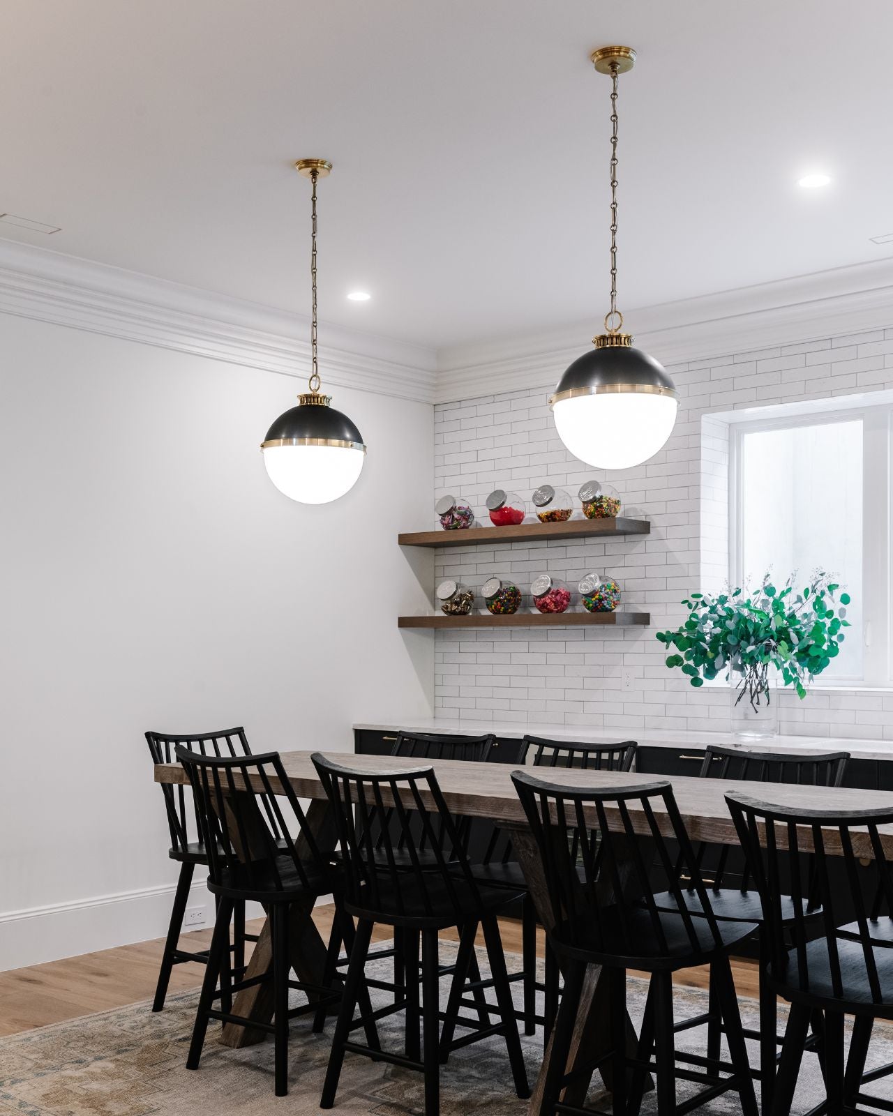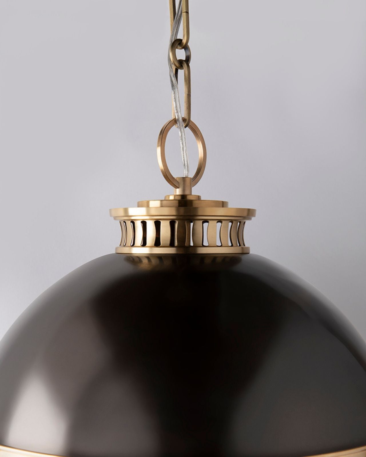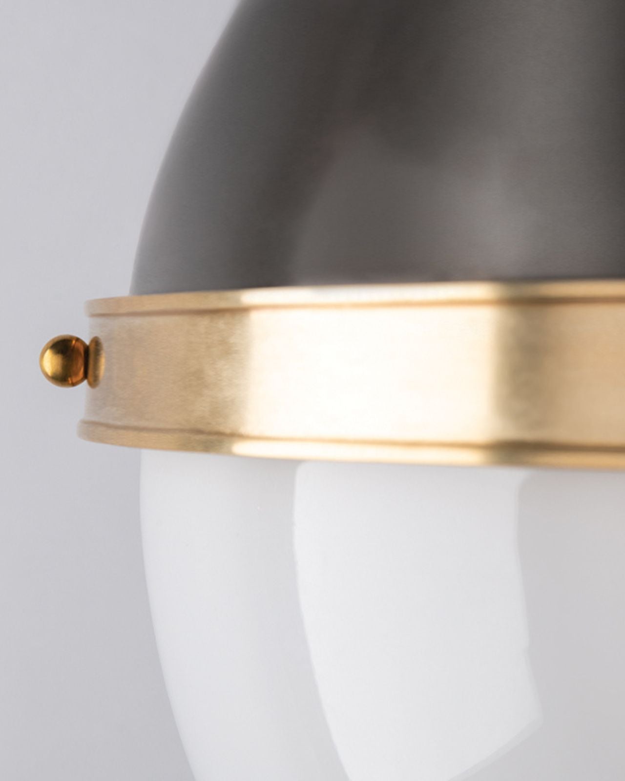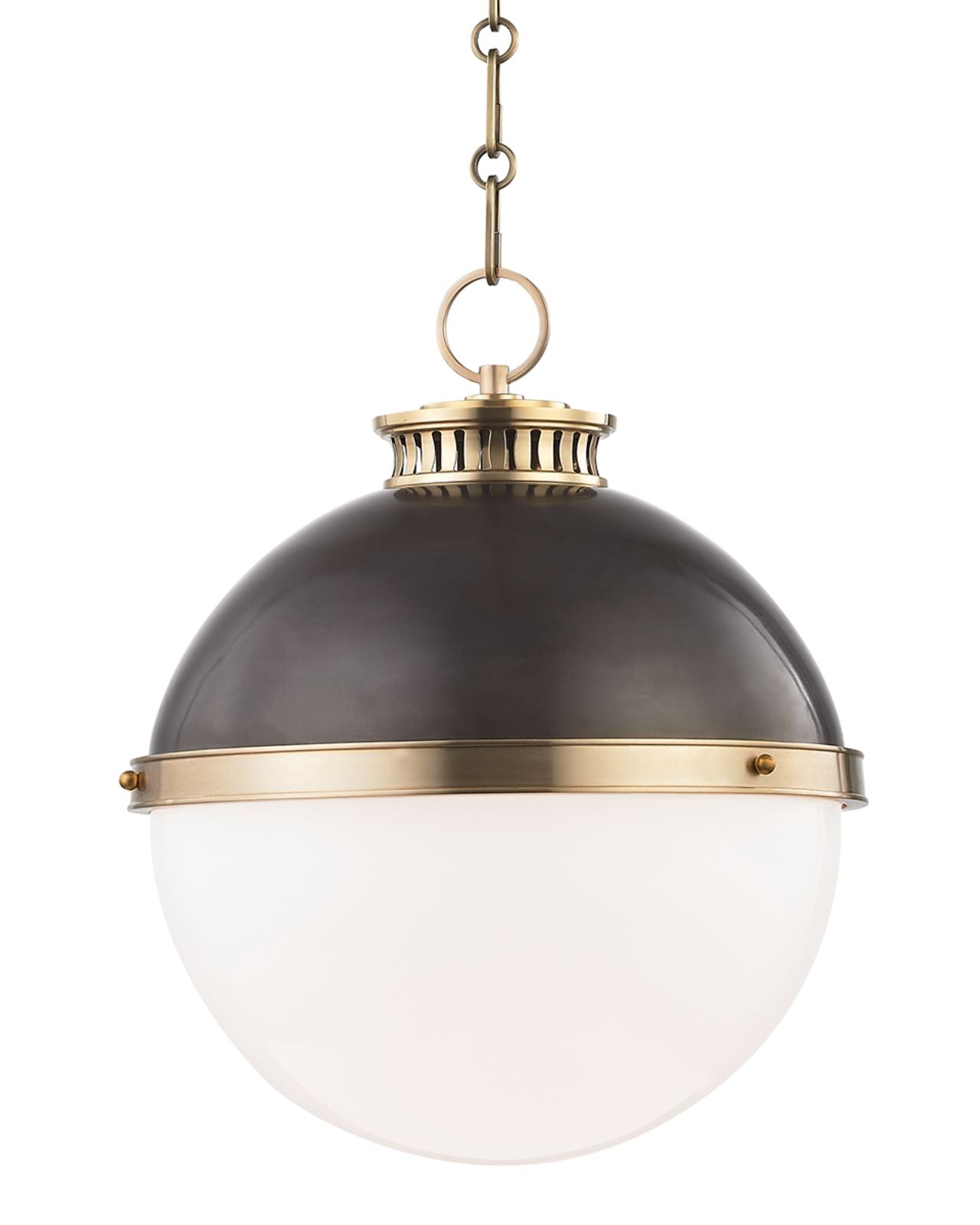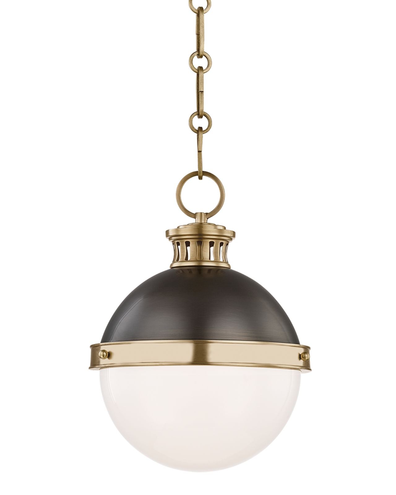 Its smooth curves and detailed metal accents make this classical pendant perfect for installation as a singular statement piece or as a cluster over a dining table or kitchen island. Available in small and large this fitting showcases a two-toned orb in antique bronze and opal glass finish.