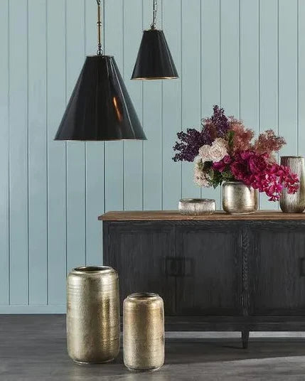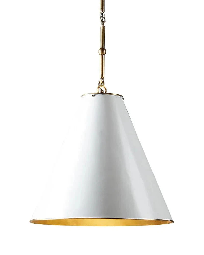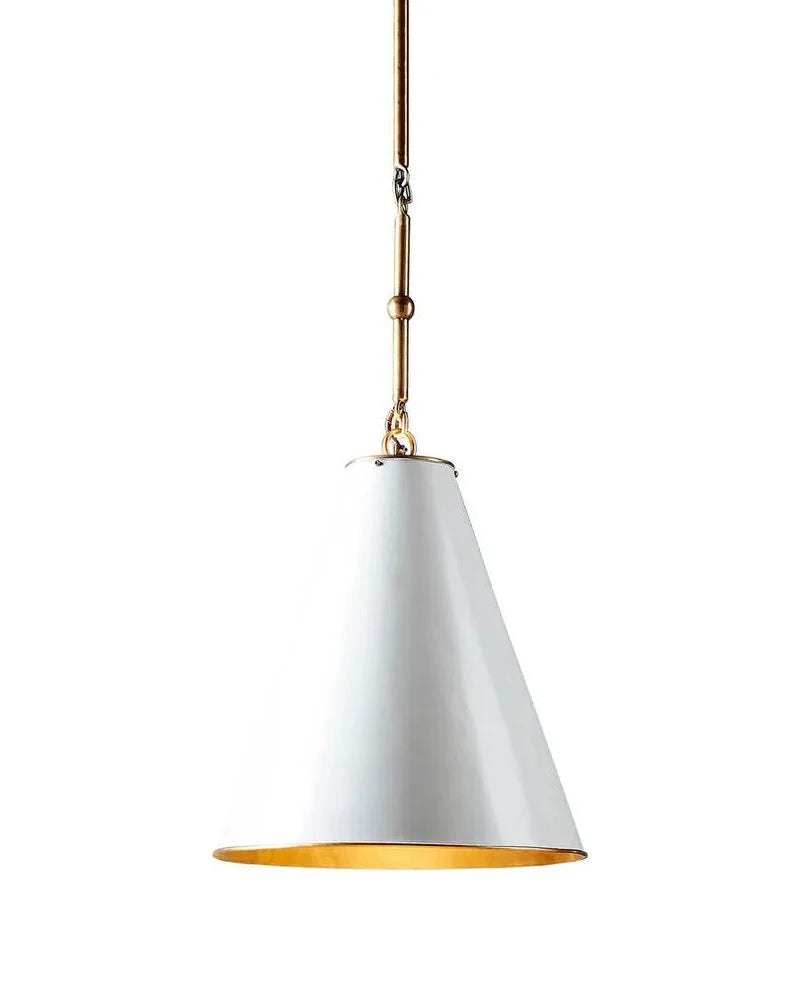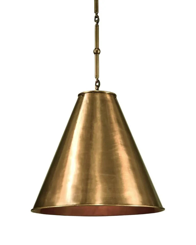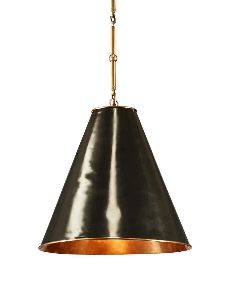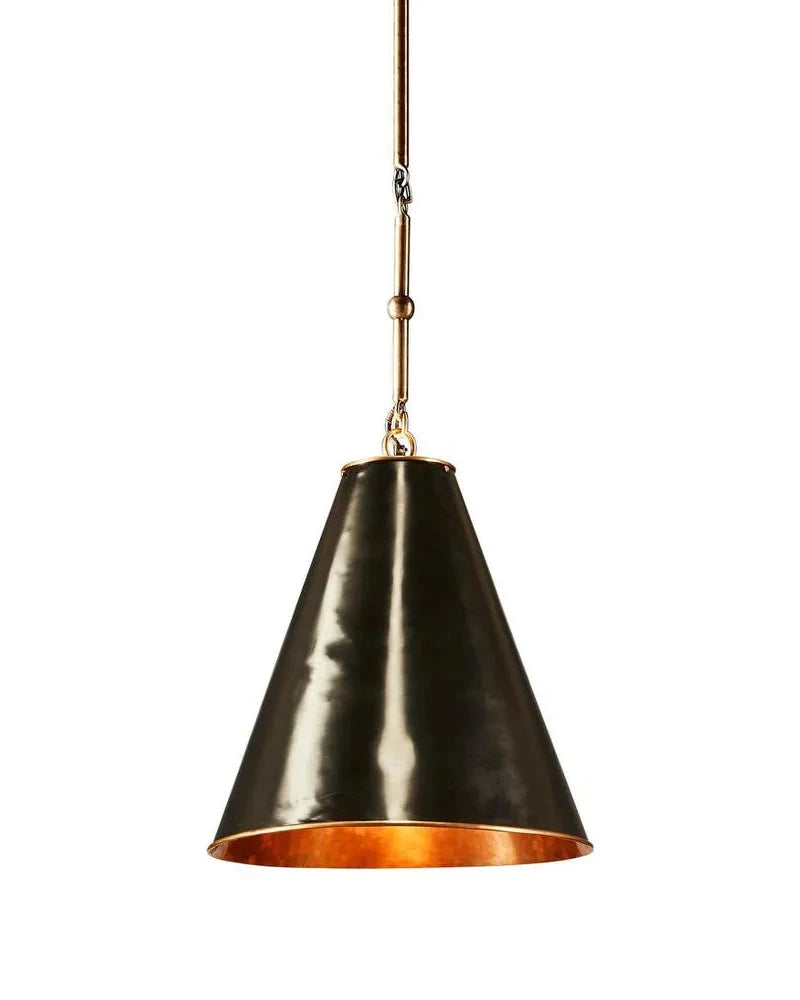 This Industrial Cone Pendant Light features a captivating blend of elegant curves and rustic charm. Featuring a brass lining that allows for versatile lightbulb choices, create a warm, downward light. It is a perfect addition to any space and a must-have for those seeking a stylish and functional lighting solution. Choose from three modern finishes in two different sizes.