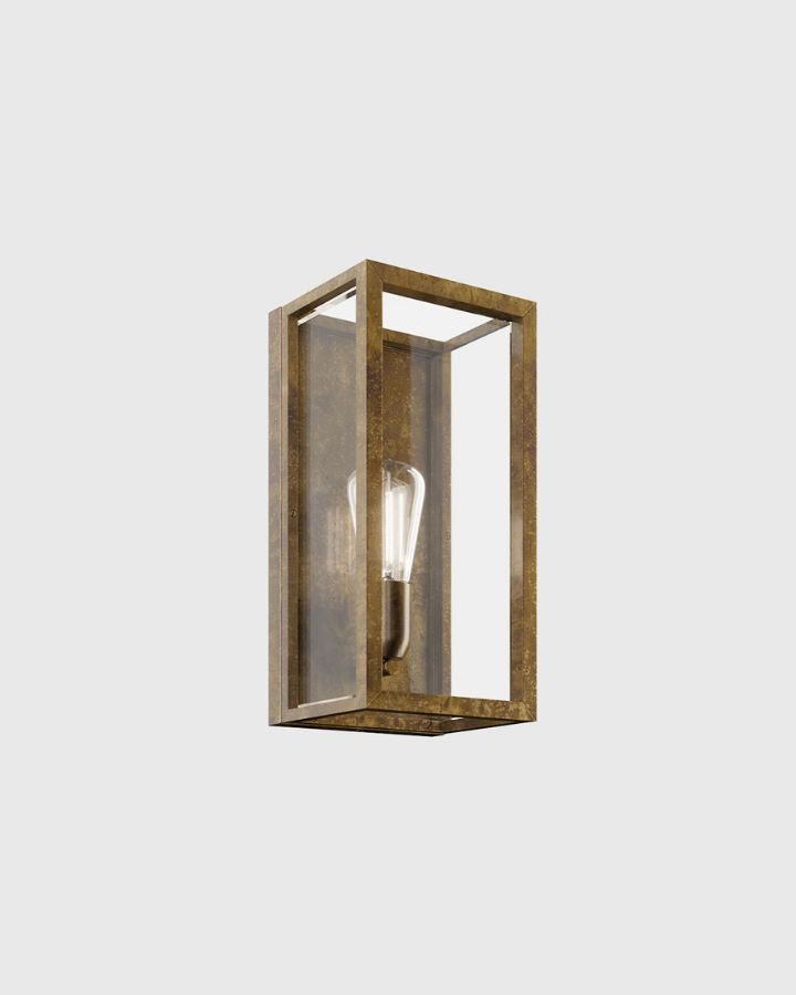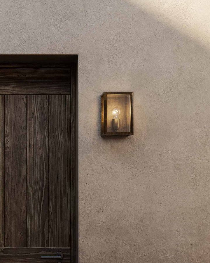 Characterised by its boxed form made from pre-aged brass and clear glass this Italian lantern is designed to provide optimal illumination for outdoor spaces. Featured with an IP55 rating this exterior fitting combines traditional and contemporary design. The Exterior Pre-Aged Box Light is ideal for adding the finishing touch to an entranceway or outdoor entertainment area. Available in Small, Medium or Large.