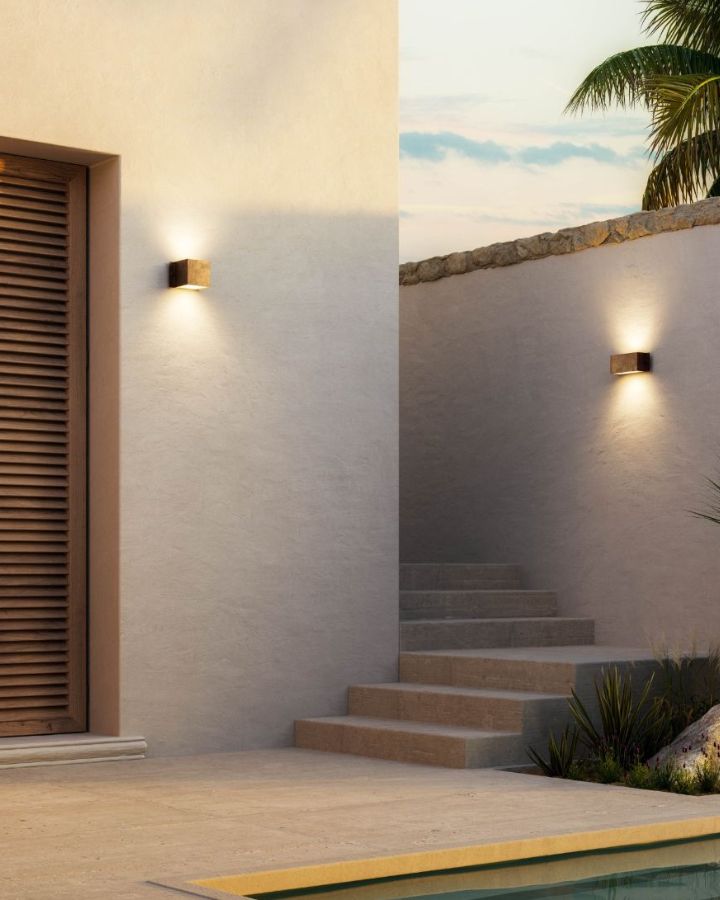 Antique Copper Rectangular Wall Lights near a pool at golden hour time