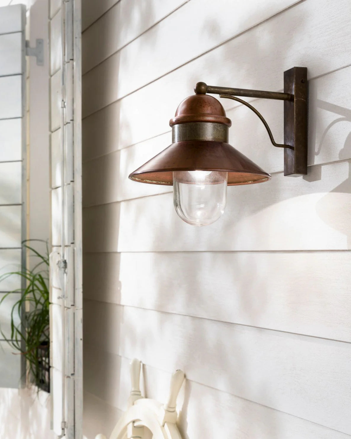 The Brass and Copper Exterior Wall Light draws inspiration from classical lighting styles, revised with a contemporary approach. Careful research and artisanal craftsmanship are combined with the latest lighting techniques to produce a high-quality functional fitting with timeless charm. Featuring a shade of aged copper on an aged brass frame, this captivating wall light is available in a choice of clear or opal glass. The aged finish is produced by subjecting the metal to a corten process, enhancing both the durability, and appearance of the light.