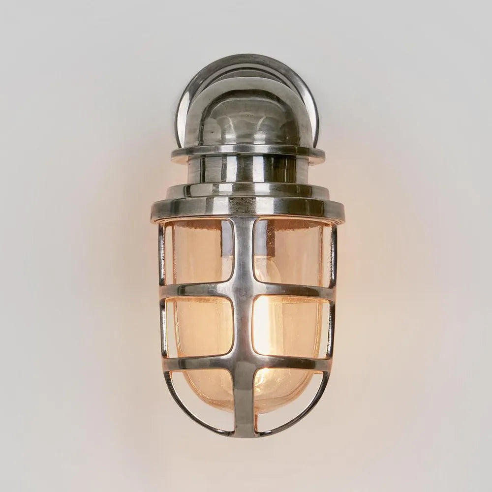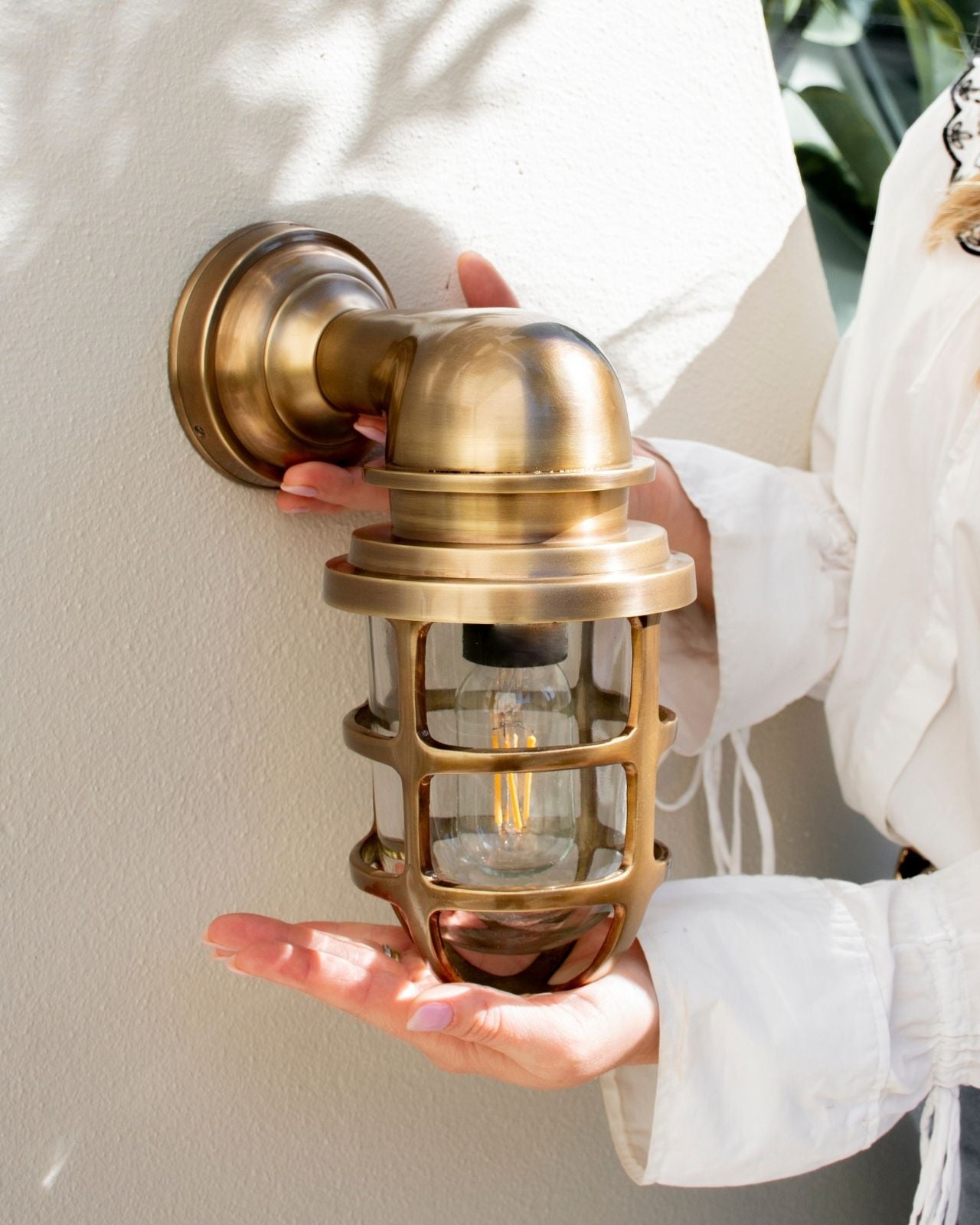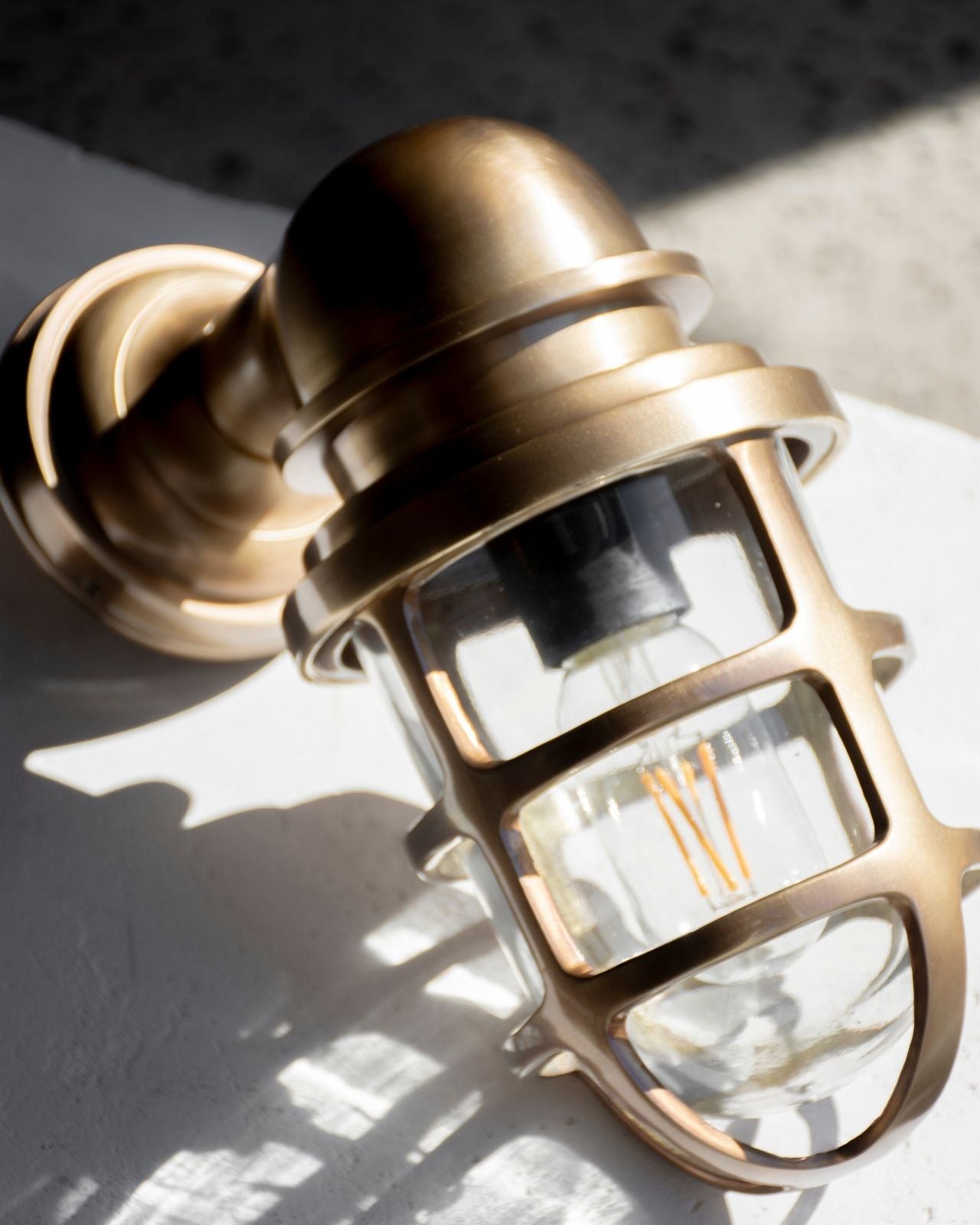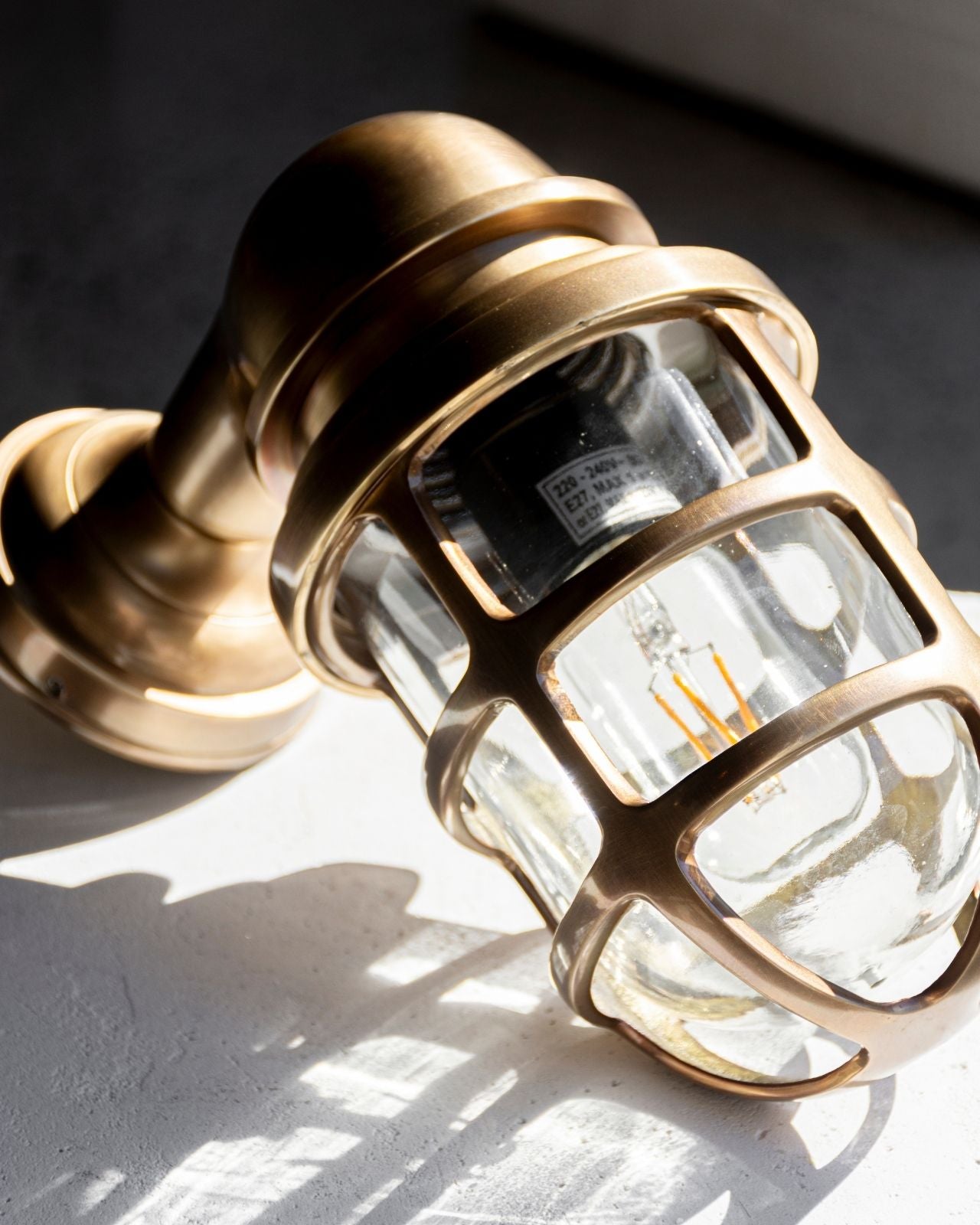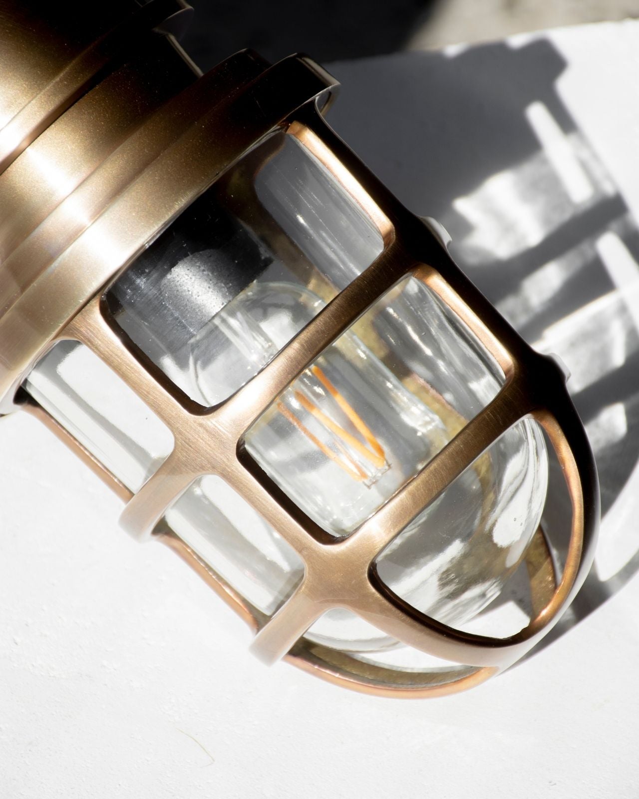 Solid brass wall fitting with caged glass. Inspired by the original fittings of maritime vessels, this fitting is sure to add the right industrial touch to your space. The glass casing inside the cage not only adds to the aesthetics of the light but also furthers the protection from water and dust, ensuring it will last the test of time.