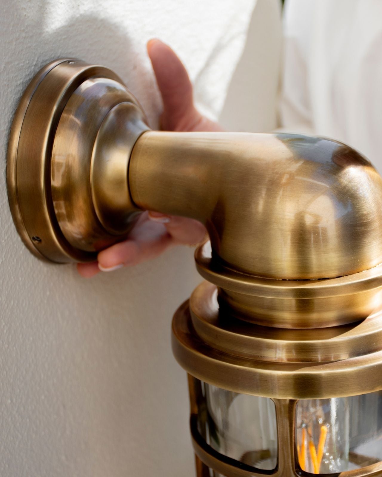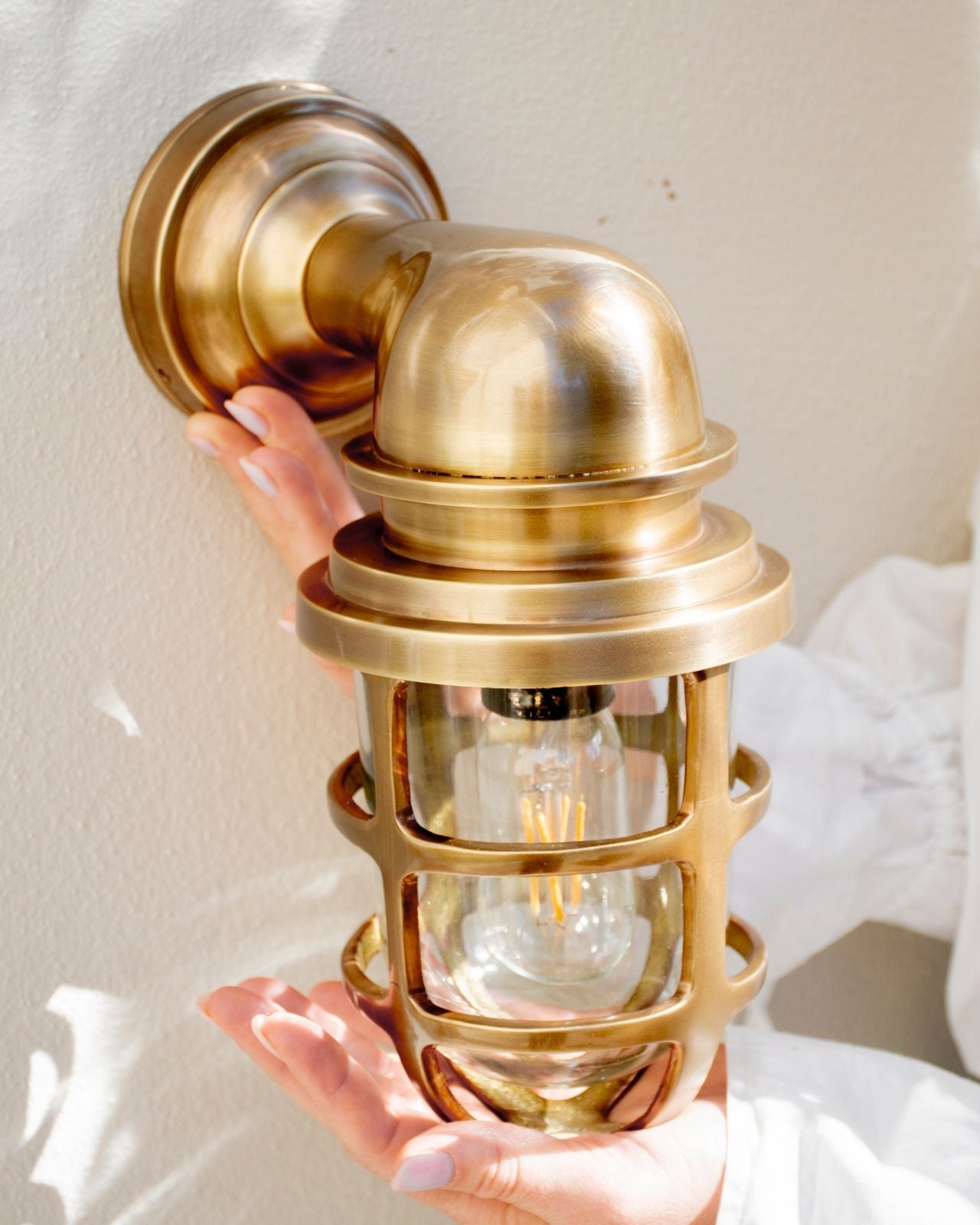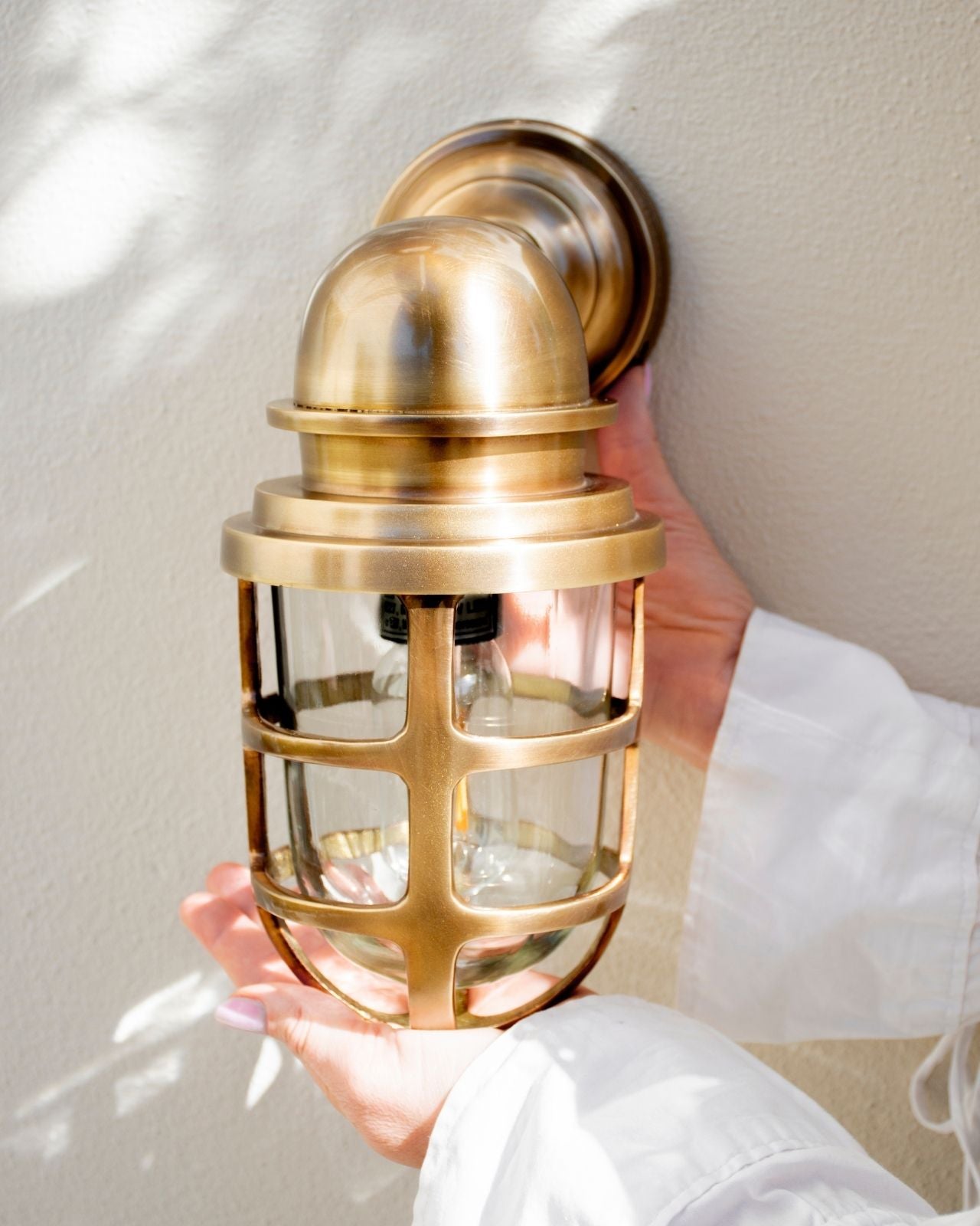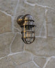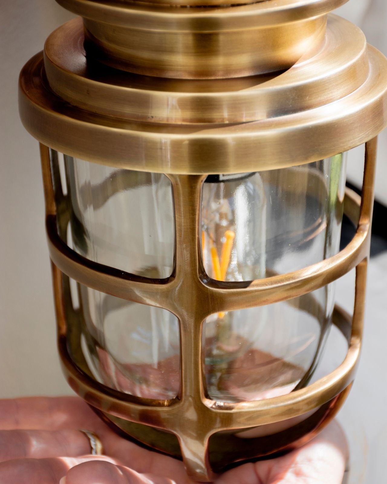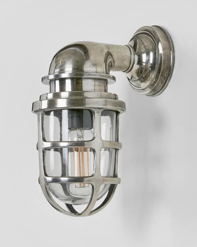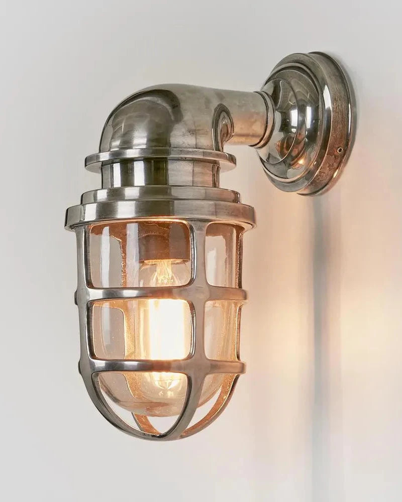 Solid brass wall fitting with caged glass. Inspired by the original fittings of maritime vessels, this fitting is sure to add the right industrial touch to your space. The glass casing inside the cage not only adds to the aesthetics of the light but also furthers the protection from water and dust, ensuring it will last the test of time.