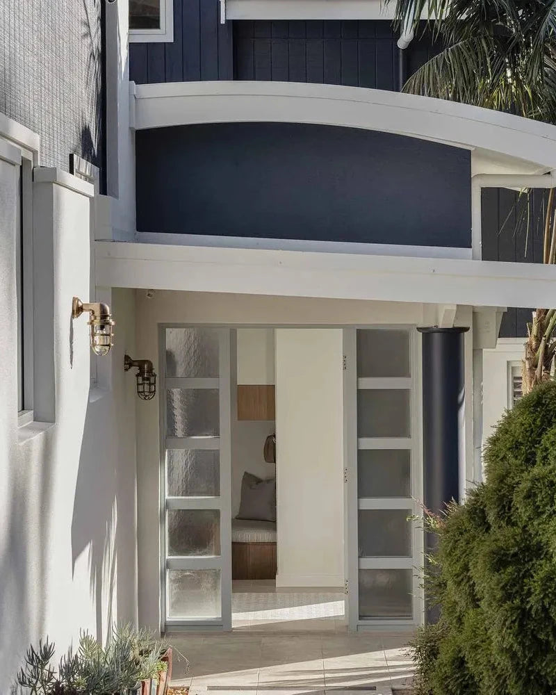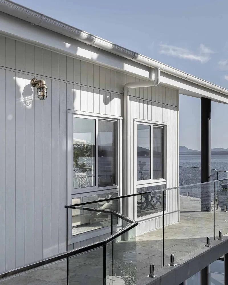 Brass Bunker Light Dark Brass at the front of a riverside home