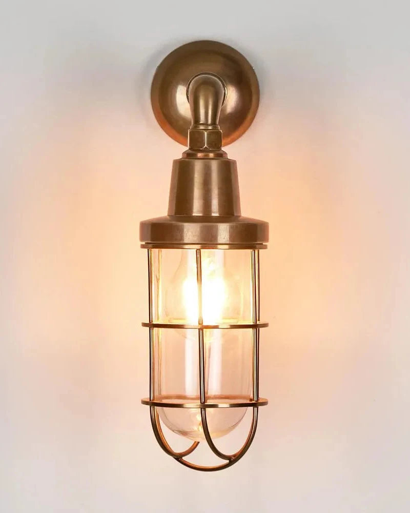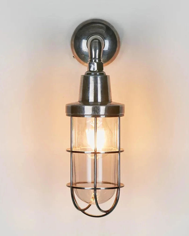 Made from solid brass this antique, old-world, ship-inspired outdoor light is enclosed by a durable and hard-wearing cage. Modelled after the classic London Underground lights of 1910, this steadfast fixture features a beautiful antique brass or silver finish. Its caged enclosure is compatible with a standard bulb or an antique-style filament that mimics the glow of a warmly lit station.