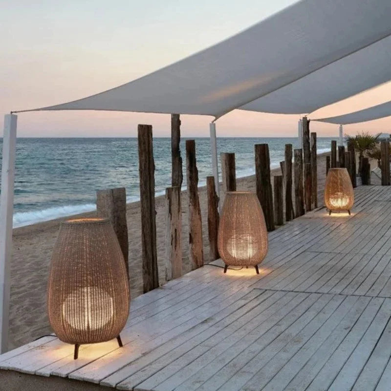 This decorative exterior floor lamp was designed in Barcelona to elevate outdoor living and entertainment spaces. The Exterior Wicker Floor Lamp uses an exaggerated wicker basket shade to funnel the source of light through the floor lamp for both an indoor and outdoor statement in your space. This carefully crafted woven floor lamp is rated IP66, making it suitable for both commercial and residential spaces and capable of withstanding exterior elements.