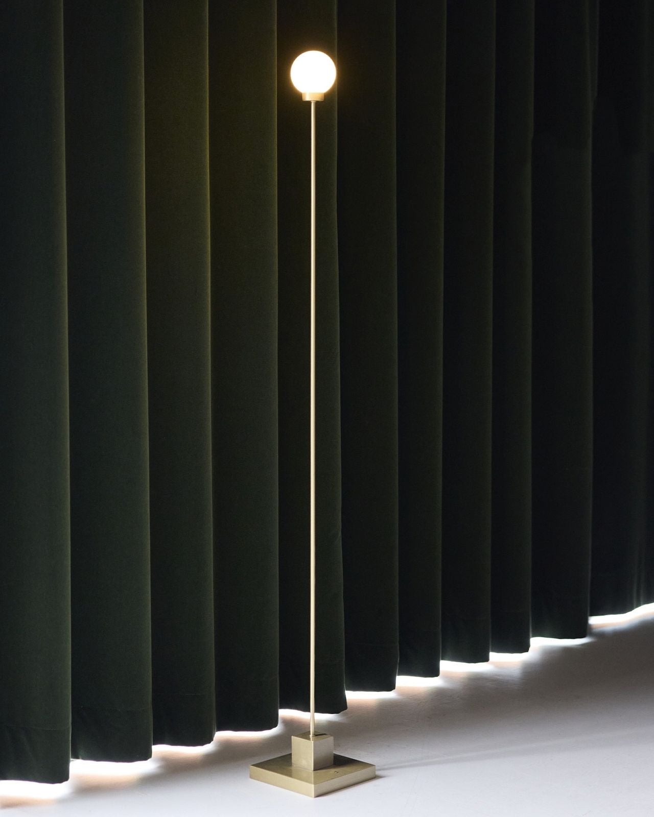 Floor lamp with a round light bulb against a dark curtain background