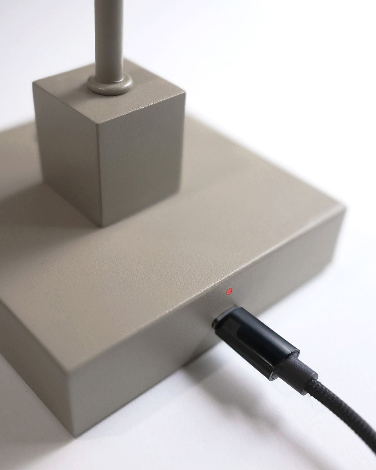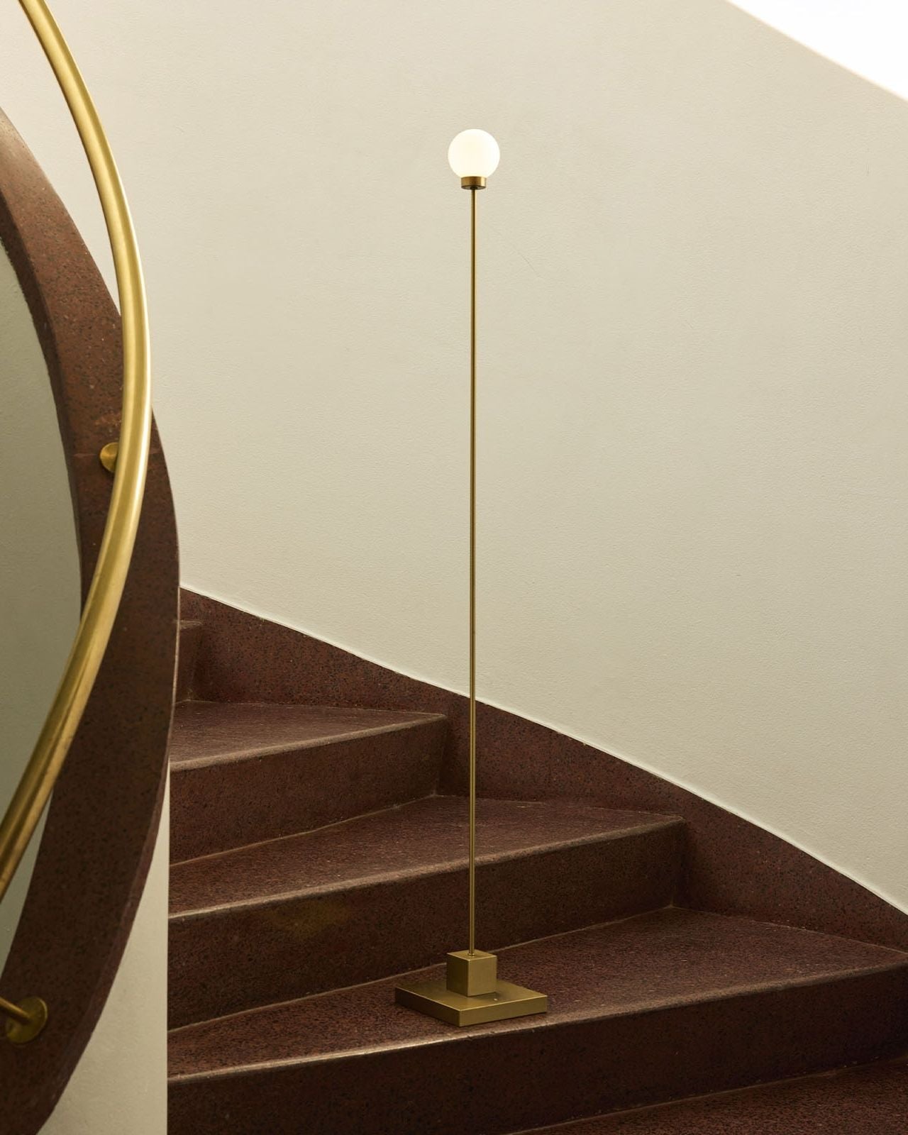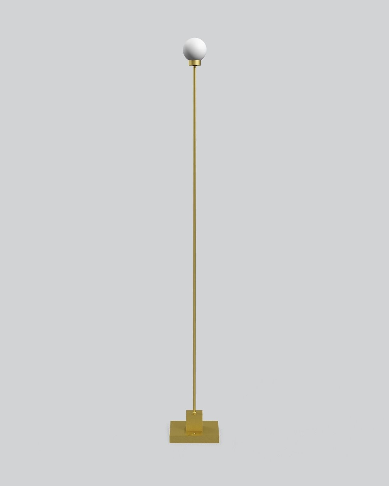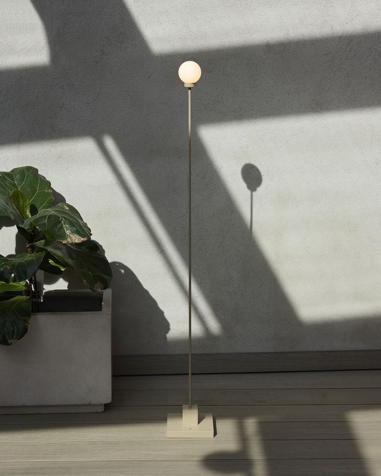 The Portable Mid-Century Modern Floor Lamp features a slender metal stem that rises from a solid square base, crowned with a smooth opal glass globe. Designed for indoor and outdoor environments, this floor lamp is available in finishes both brass and grey-beige. It is a cordless portable floor lamp that offers easy repositioning, USB-C charging, and three-step dimming via touch control. The balanced proportions and clean geometry illustrate sculptural and minimal design, ideally placed in contemporary spaces like terraces, balconies, living rooms or reading corners.