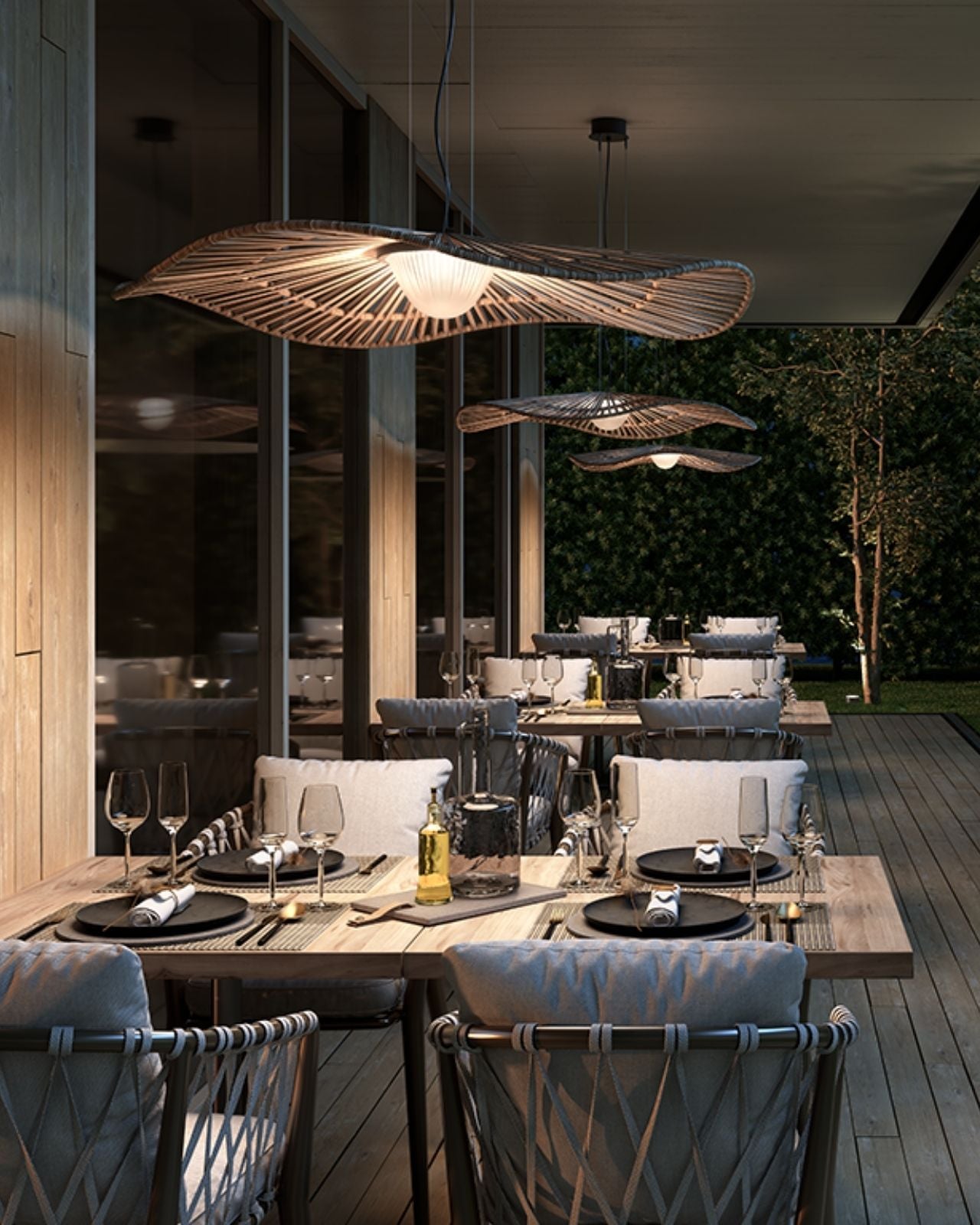 The Exterior Woven Wave Pendant, designed and crafted in Barcelona, Spain is a large handwoven fitting. Ideal for Coastal style interiors or exteriors, this pendant is an interesting focal piece, utilising the gaps in the shade to cast unique shadows from the light shining through. With an integrated LED, TRIAC dimming, and an IP66 rating, this fitting is easy to install and suitable for harsh weather. Featuring an opal glass diffuser for a soft light.