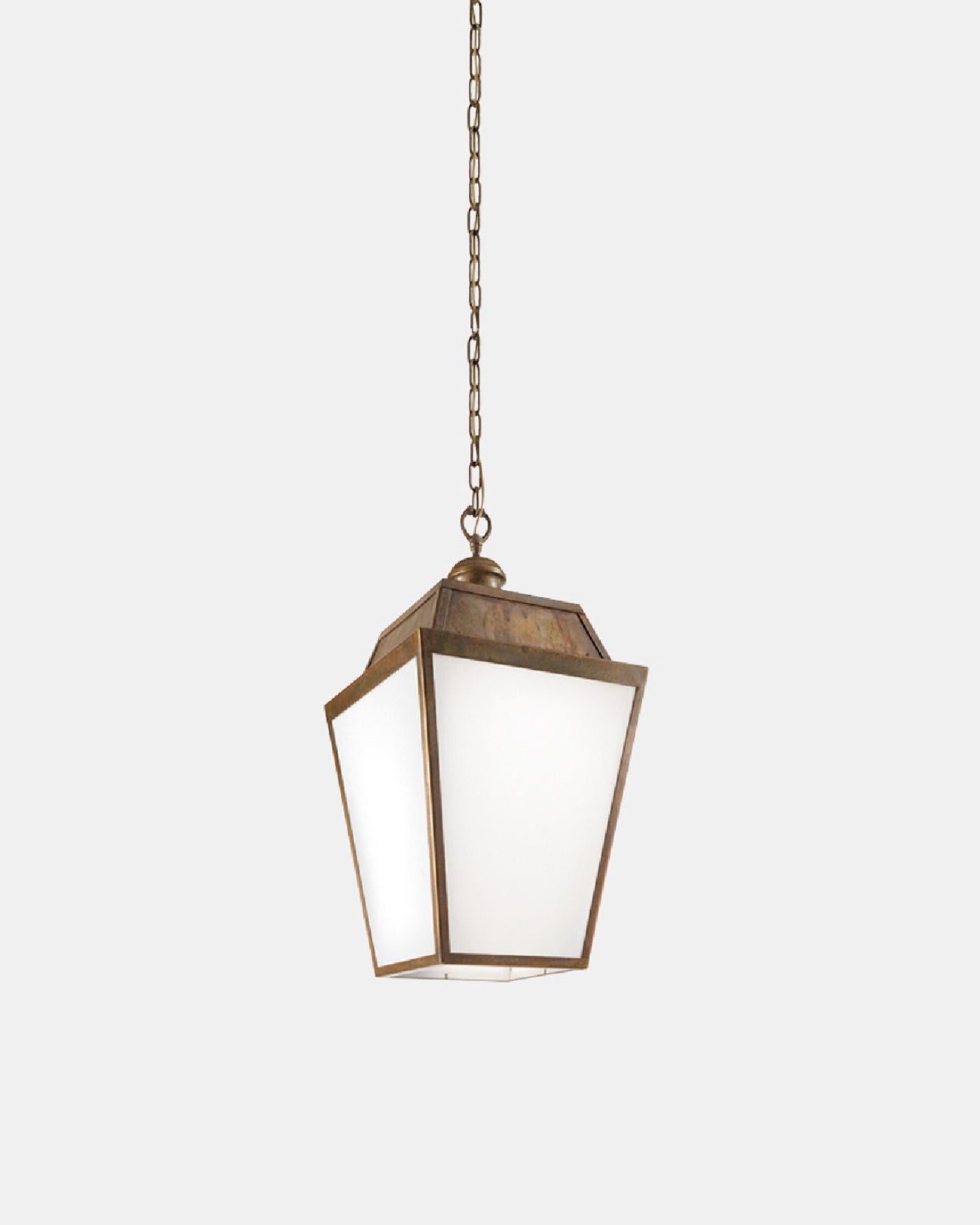 This outdoor pendant light is made from pre-aged brass, featuring a chain that can be adjusted to suit the space perfectly suited for installation at the front entrance of a house or in an open verandah. The Pre-Aged Brass Exterior Lantern Pendant pendant is available in two finishes, white or transparent.