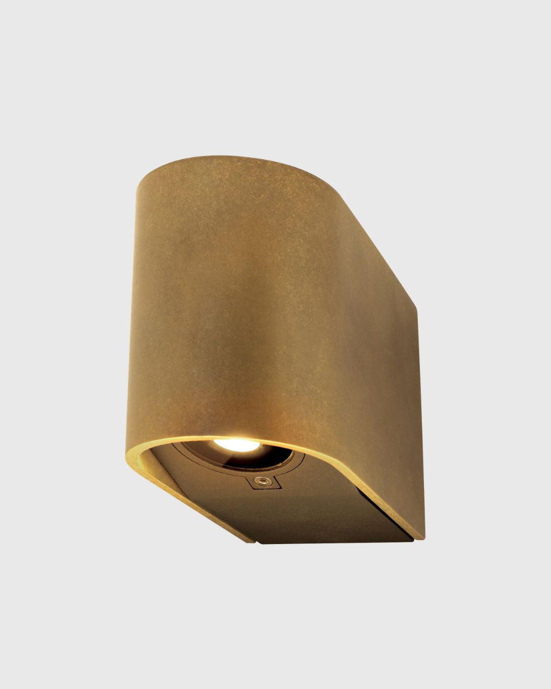 Simple up down light source with cylindrical brass shade attached on grey background