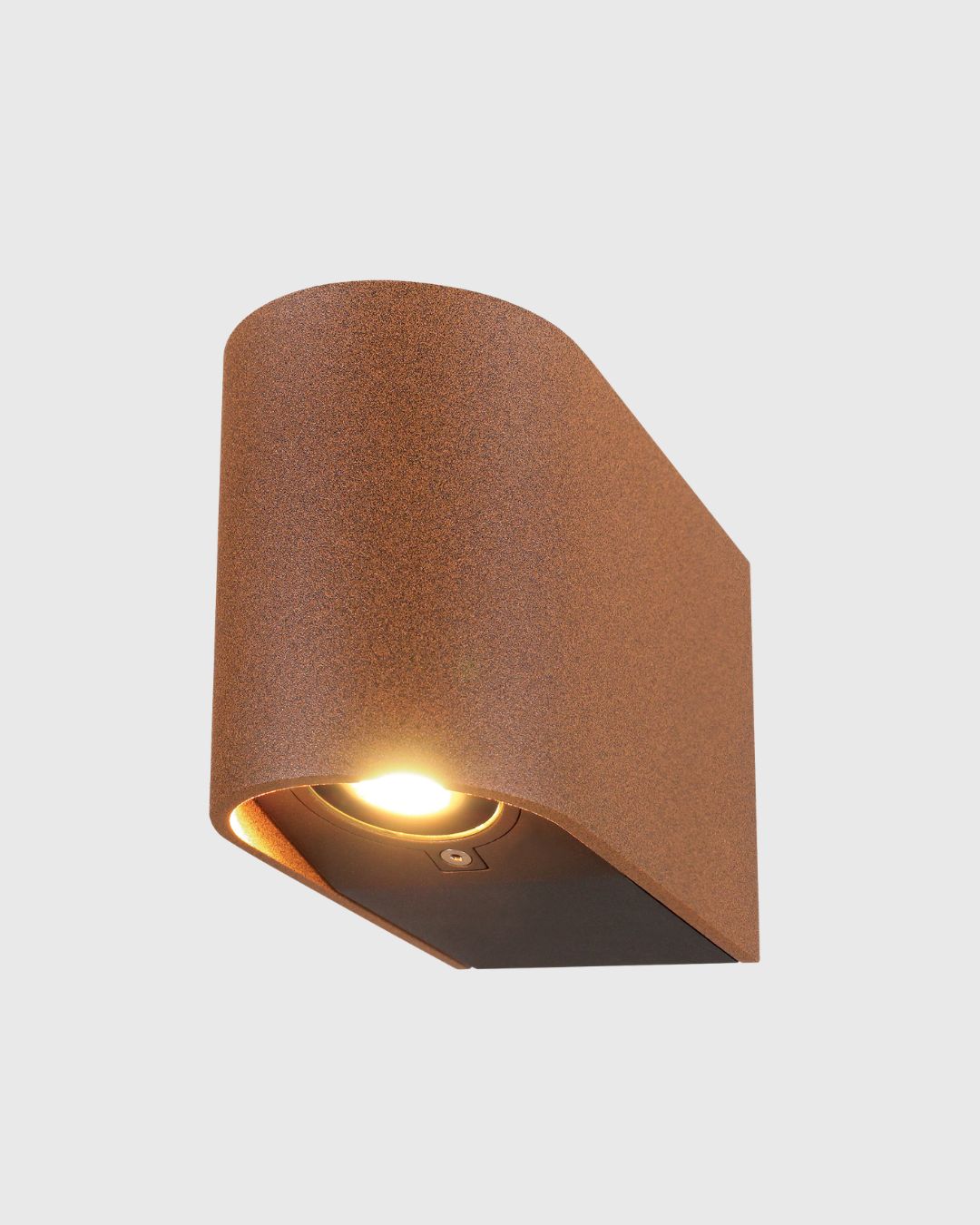 Simple up down light source with cylindrical rust shade attached on grey background
