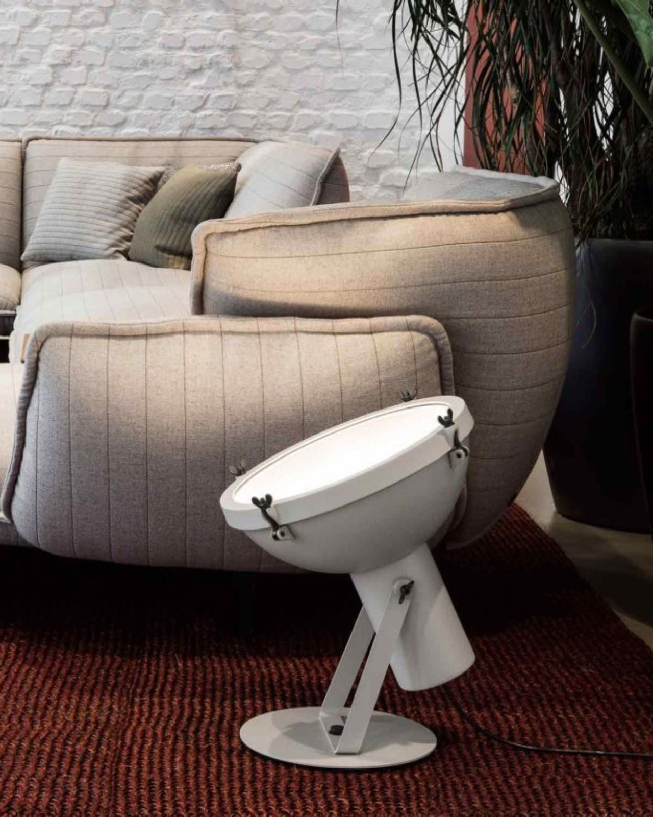 Made in Italy from high grade aluminium, finished in your choice of night blue or white sand. The adjustable shade allows you to position light to suit your needs, making this a great option for task lighting and uplighting. The shade is completed with an opal glass diffuser which provides even light distribution.