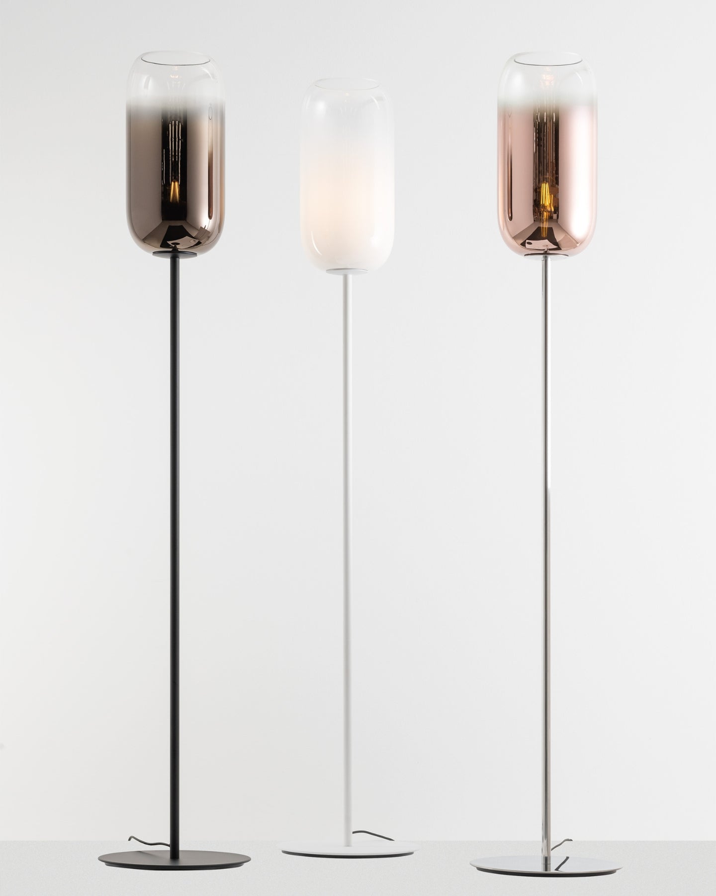The Glass Oblong Floor Lamp is designed to highlight the natural beauty of handcrafted blown glass. The blue, copper, bronze, and silver versions are crafted using an innovative, environmentally responsible PVD (Physical Vapour Deposition) process. This advanced metal vacuum-deposition technique delivers vibrant, durable finishes while eliminating harmful emissions. In the white version, each diffuser is created using an age-old Venetian technique that fuses white glass with crystal during the blowing process, resulting in unique, one-of-a-kind pieces rich in artisanal character. The result is a fitting that beautifully blends tradition, innovation, and sustainable craftsmanship.