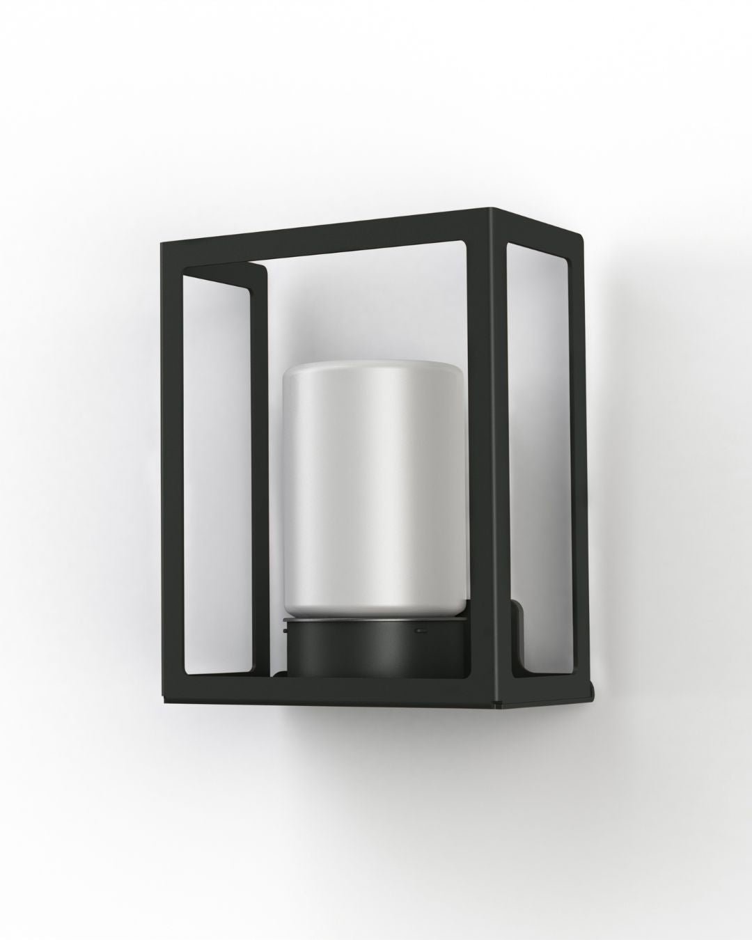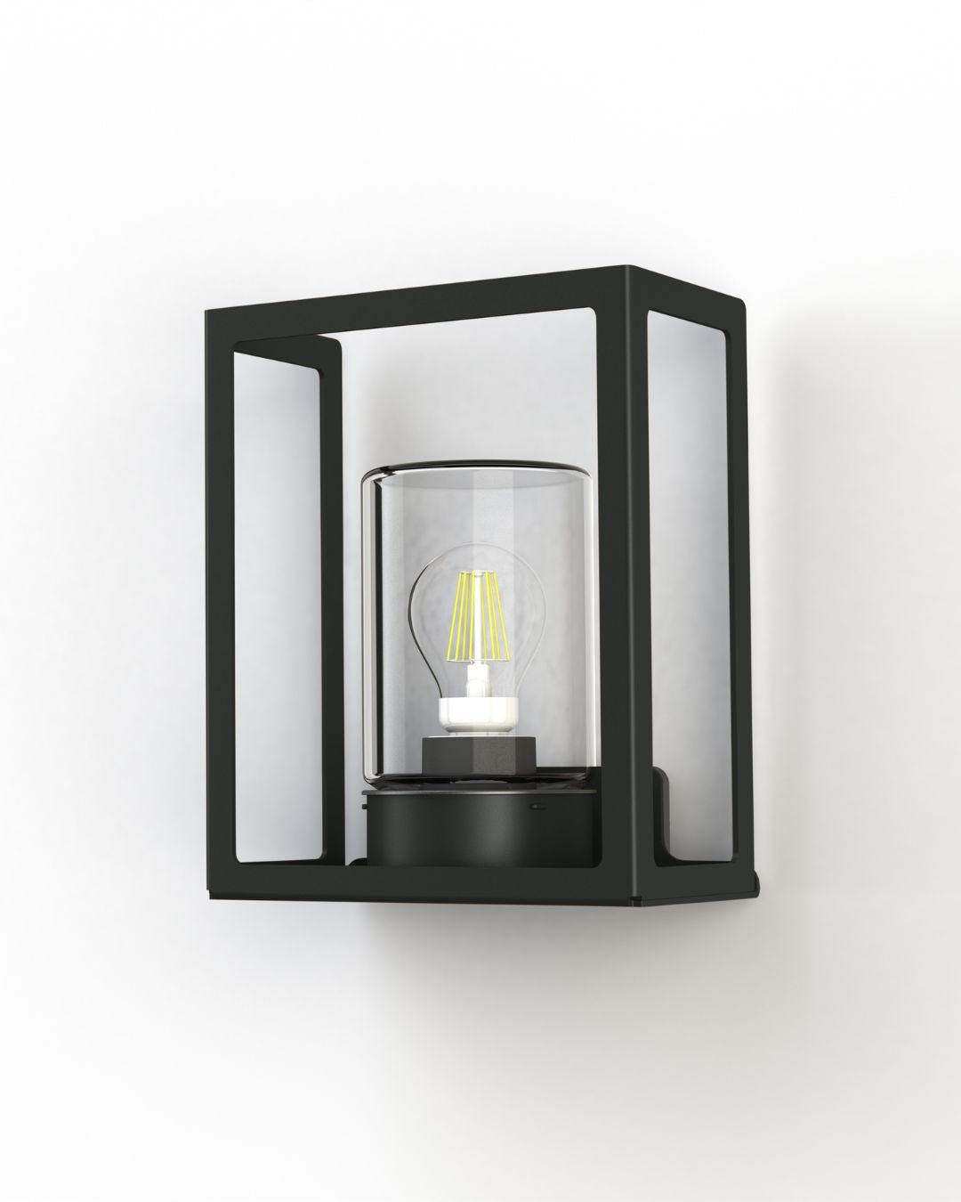 This wall light is a contemporary take on the traditional half wall lantern. The outer frame is open and free from any glass panels and the inner cylindrical glass which protects the globe comes in either a clear or frosted finish. The frame is also available in a dark grey aluminium finish and can be mounted facing up or down.