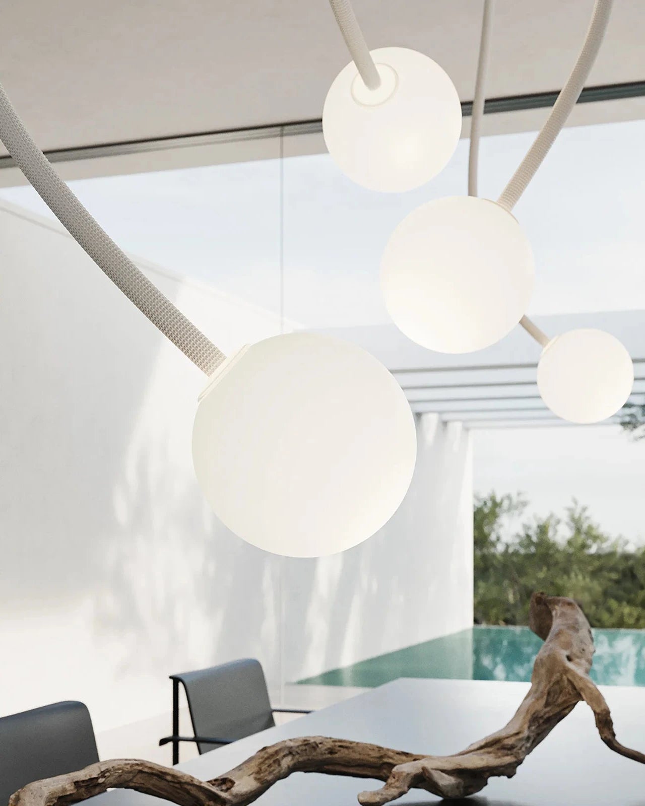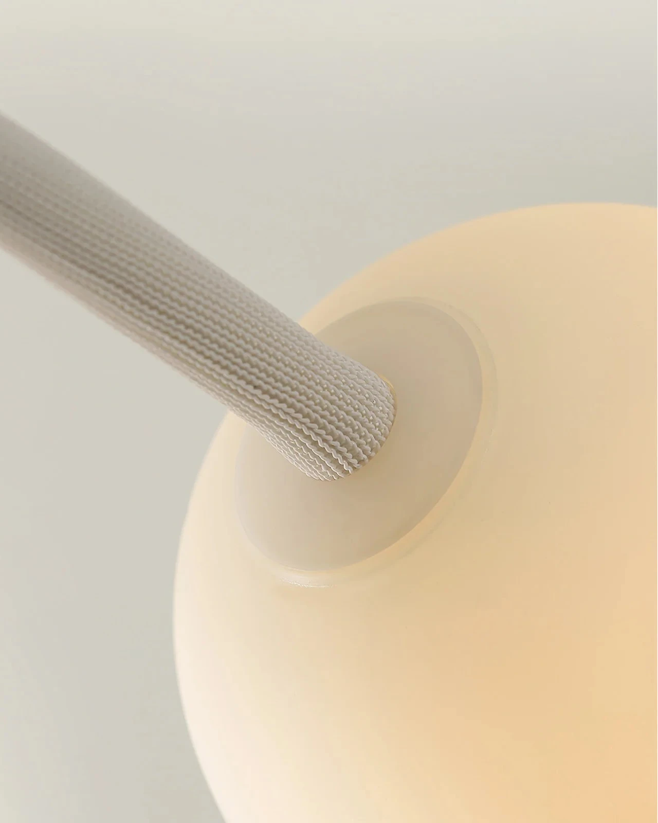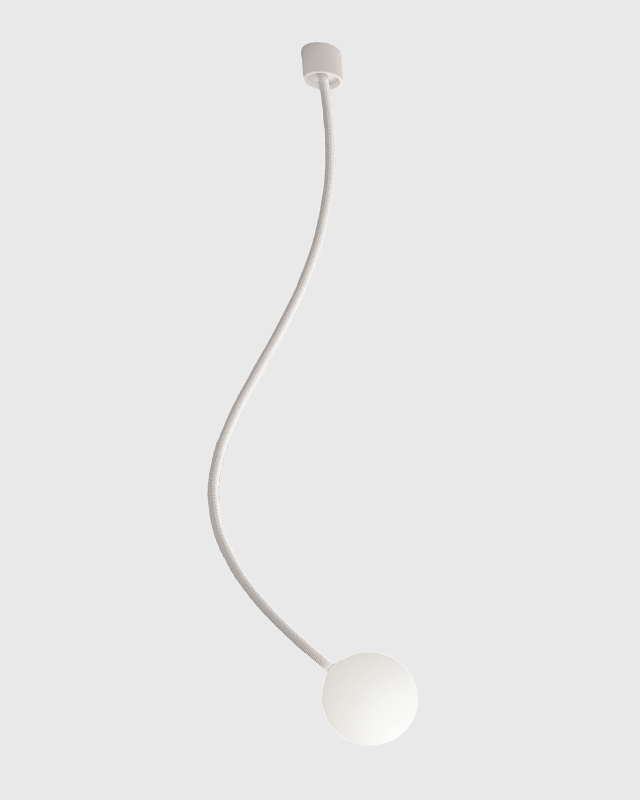 Designed by Marcantonio Raimondi Malerba, this versatile pendant showcases a minimalist design with a flexible arm covered by white canvas and a frosted glass orb. With the ability to direct the light where it is needed most, this fixture will spread a glare-free and warm light within bedrooms, dining rooms, kitchens or corridors. Displayed on its own or in a group, it will elevate modern, minimalist or contemporary interiors and bring some sophistication and elegance touch.