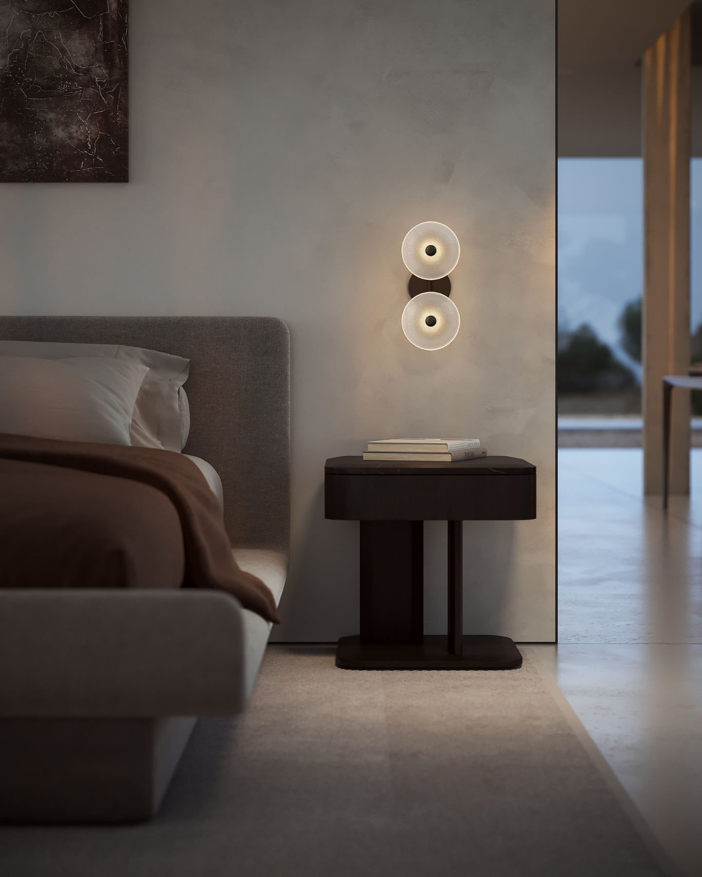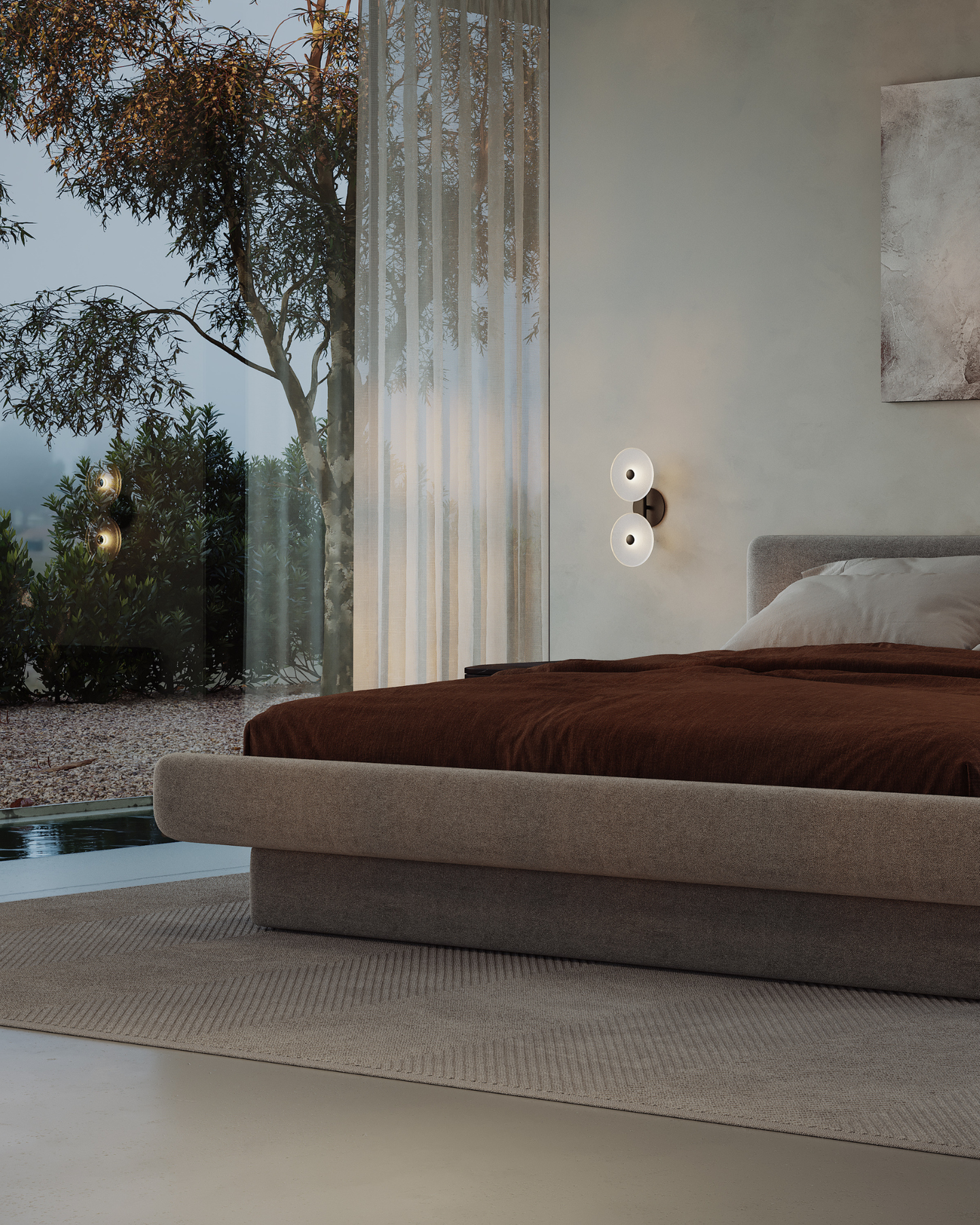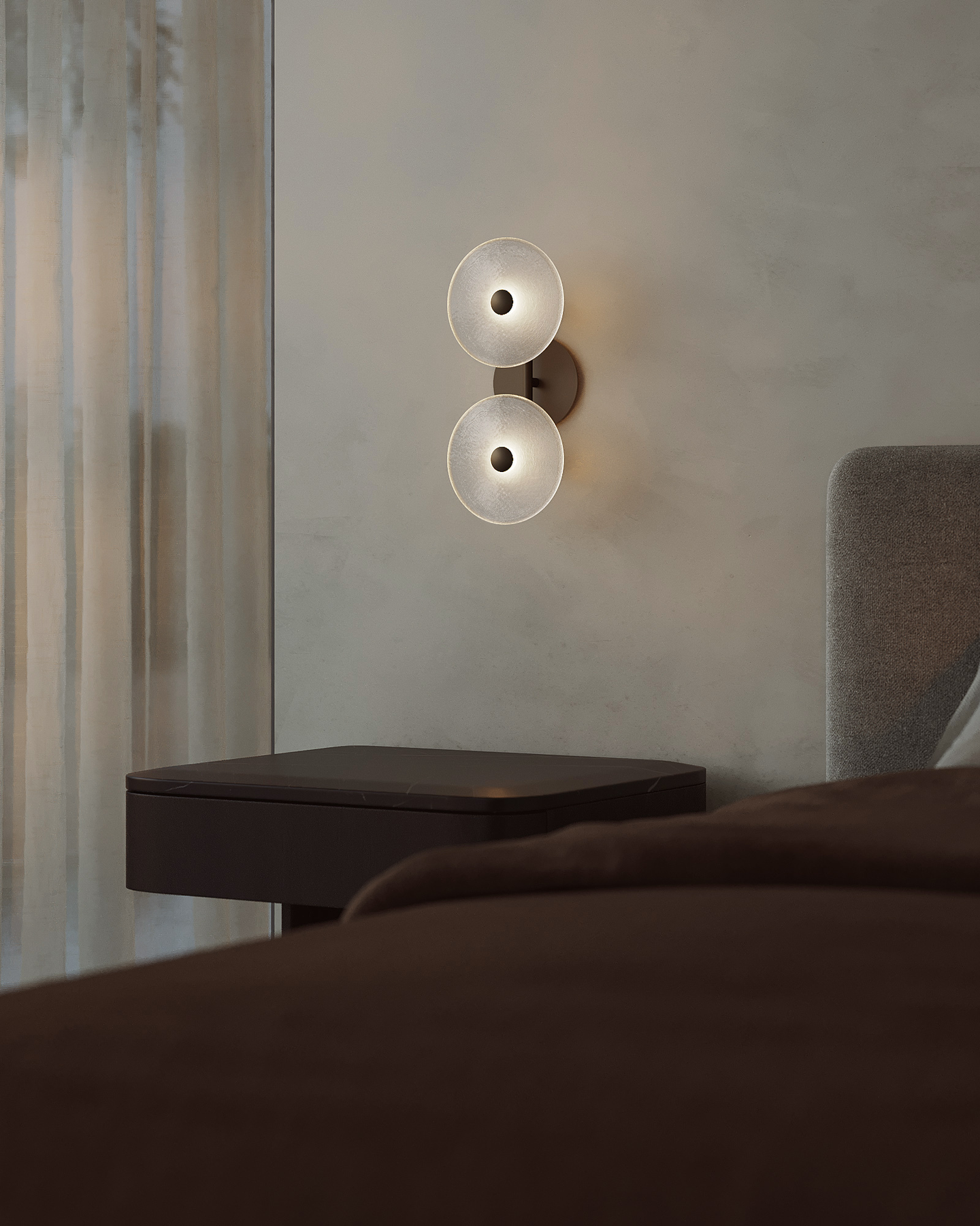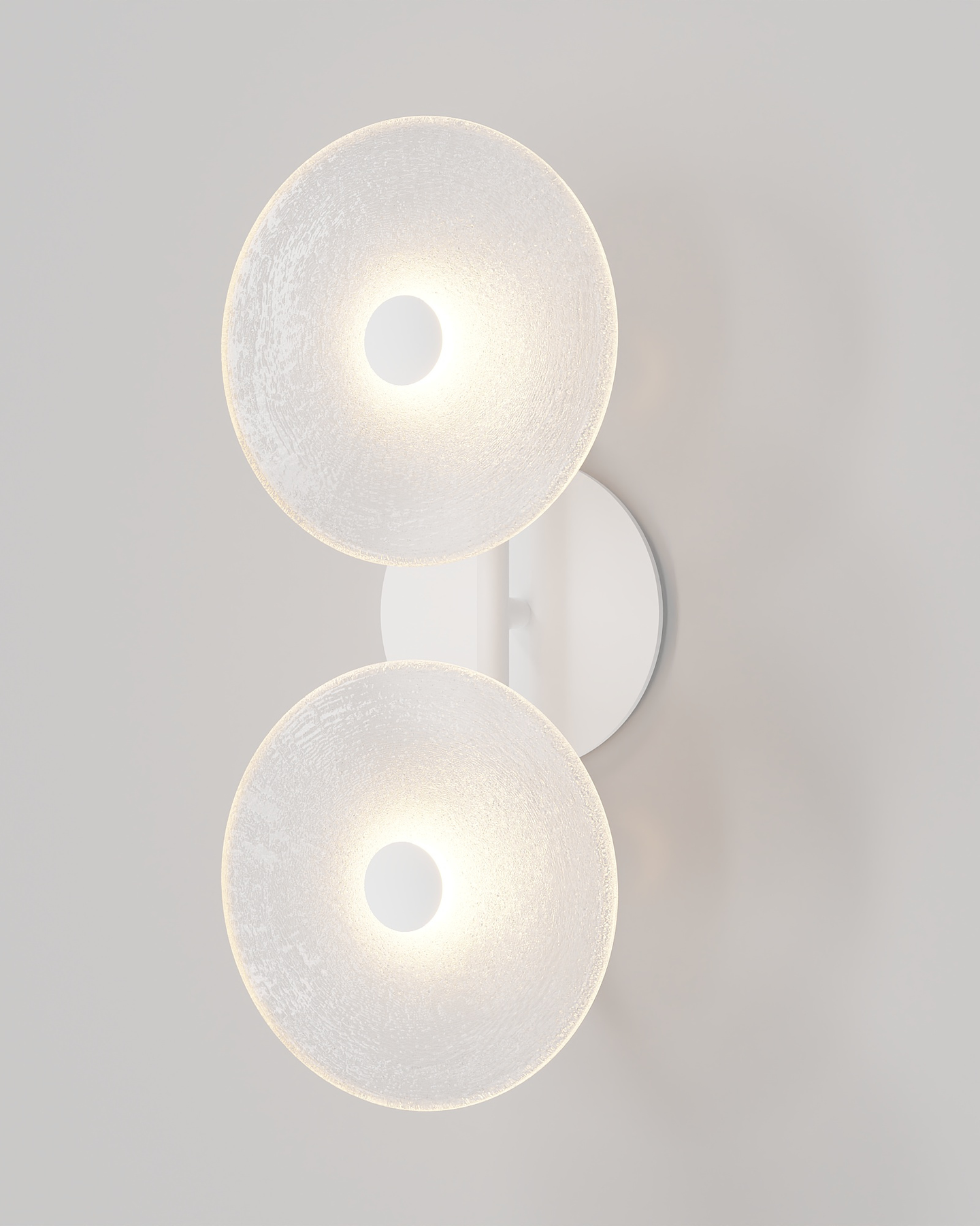 The Coral Duo Rod Wall Light, crafted and designed in Currumbin, Australia is a unique fitting made from two glass discs, mounted perpendicularly to a sleek rod. Available in Brass, Matte White, Matte Black, Steel and Medium Bronze, this fitting is versatile and suitable for a variety of contemporary interiors. Install a frosted glass fitting above a bedside table for a soft diffused light, or use the clear glass versions in clusters in a hallway for a more direct light.