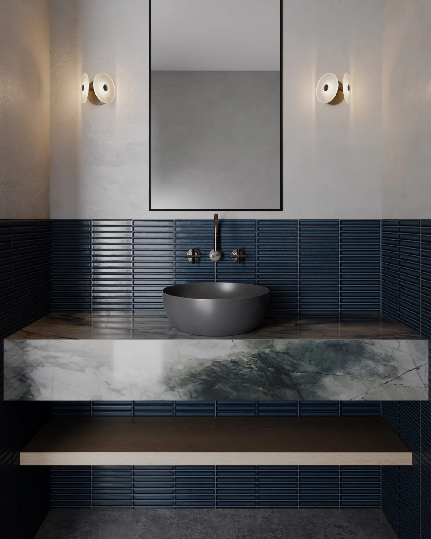 Modern bathroom with a dark grey sink, faucet, and blue tiled wall, glass wall light on either side of mirror