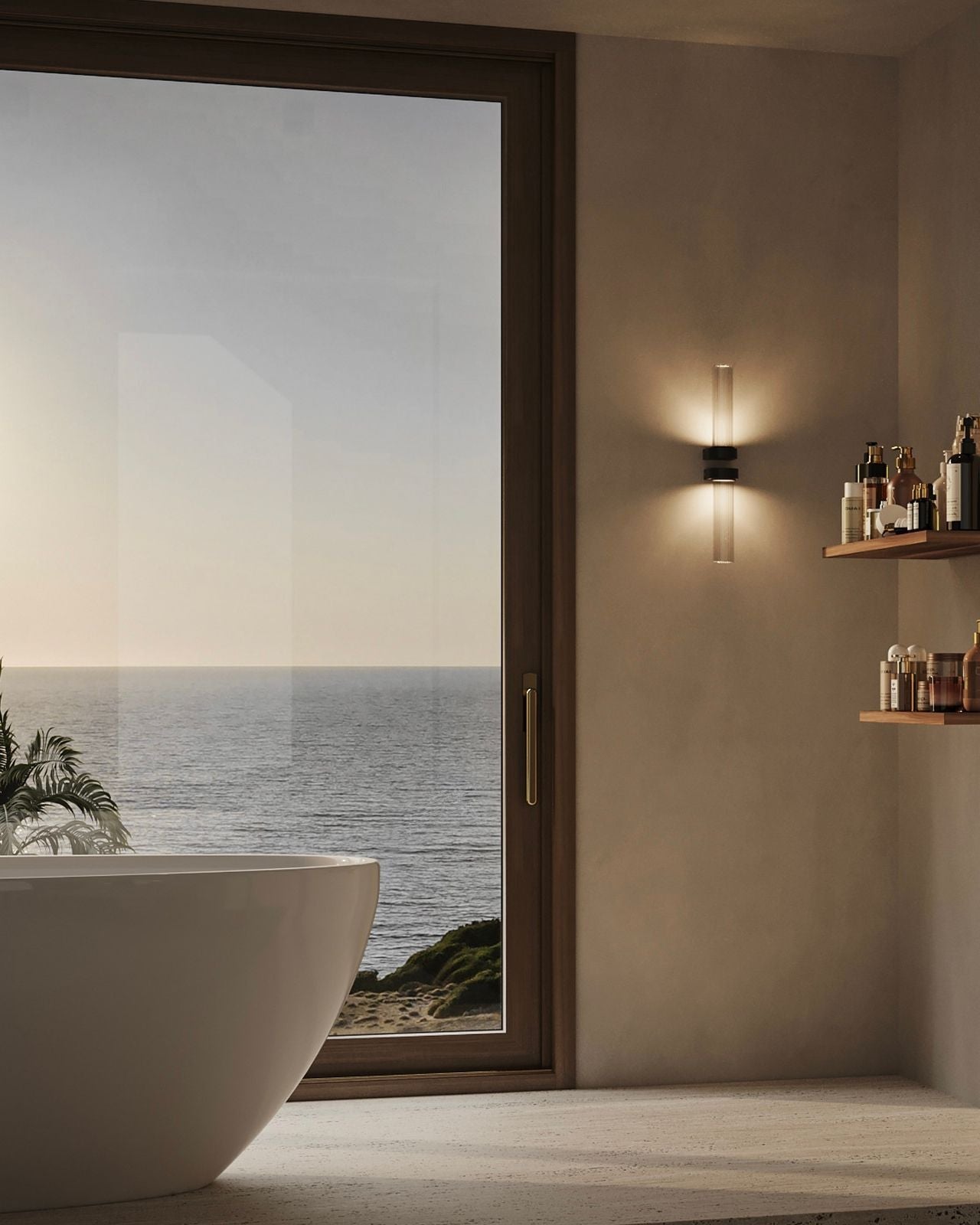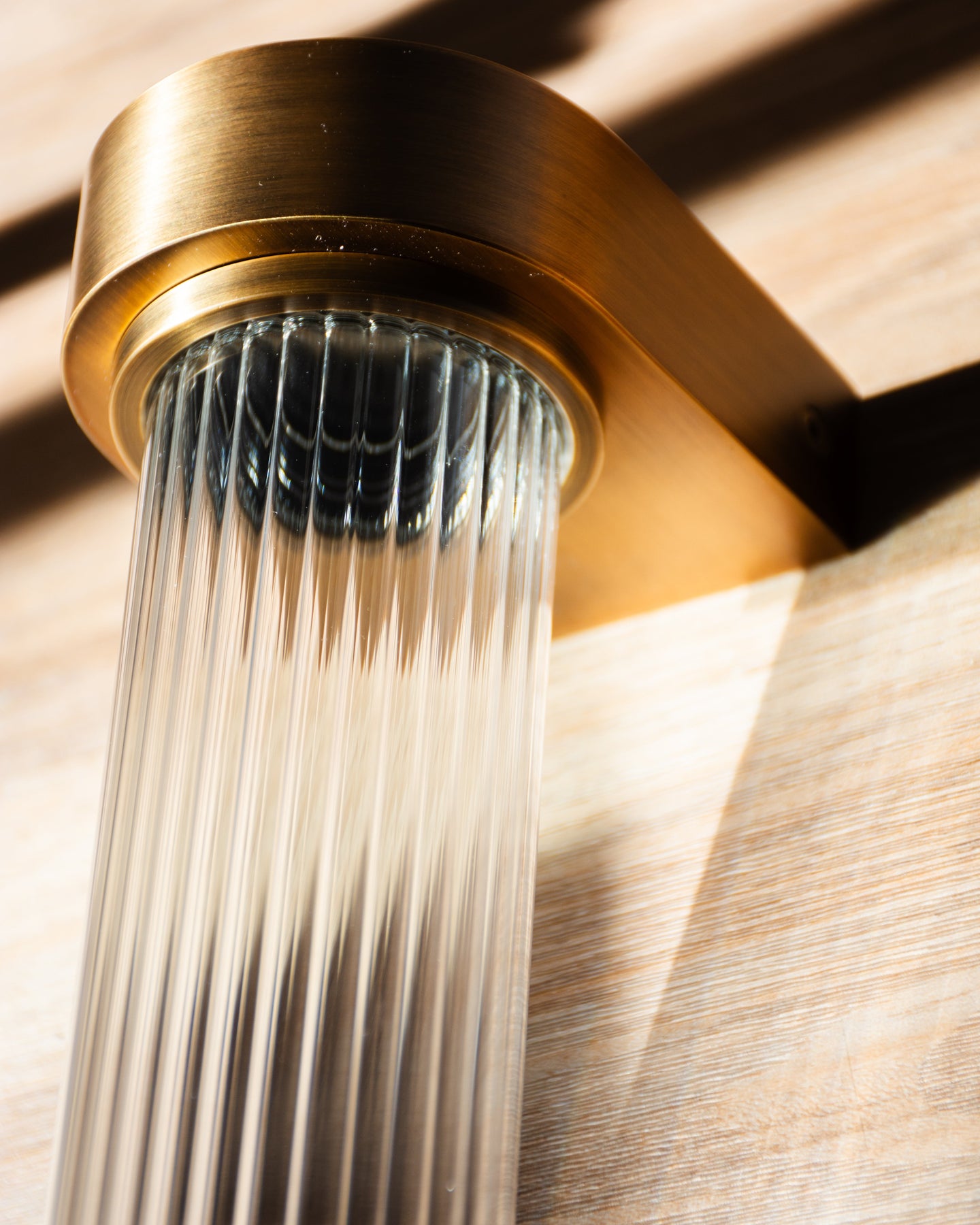 The Cylindrical Glass Wall Light presents a contemporary interpretation of classic design. A slim wall-mounted bracket, offered in Old Brass or Iron, supports a cylindrical borosilicate glass shade, available in clear, ribbed, or frosted finishes. The interplay between the structured metal form and the glass profile creates a clean, architectural aesthetic. Its balanced proportions and versatile design make it well-suited to a range of applications, from framing mirrors and illuminating hallways to enhancing bathroom interiors. With an IP44 rating, the fixture is suitable for damp environments while maintaining its refined appearance.