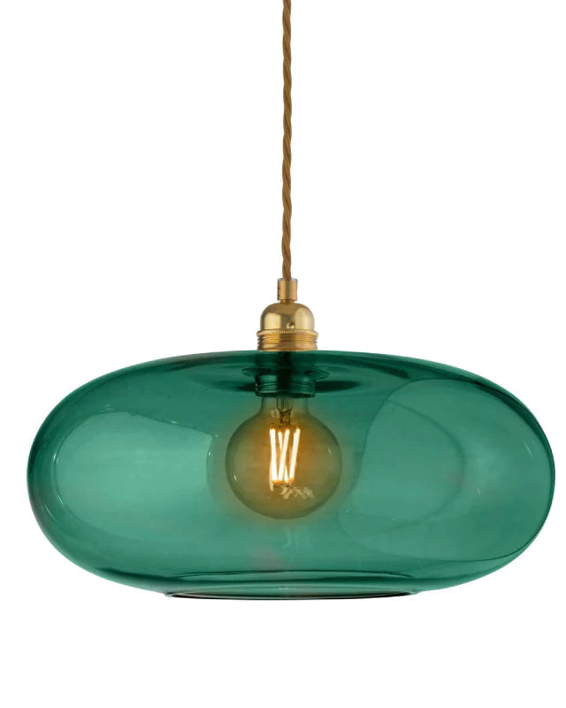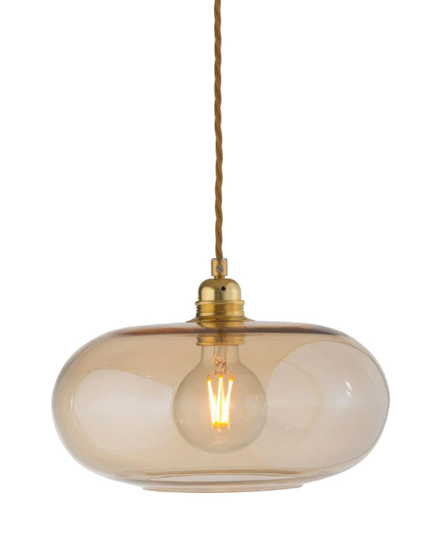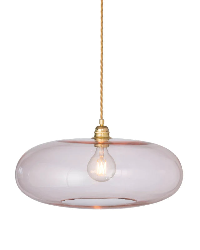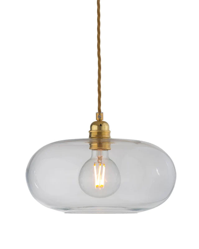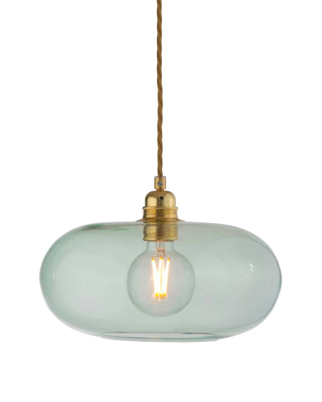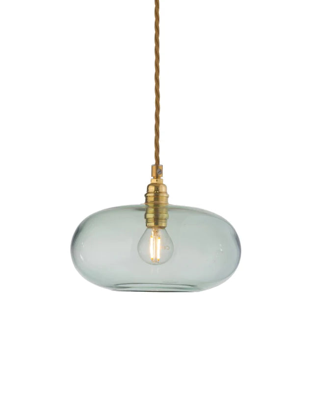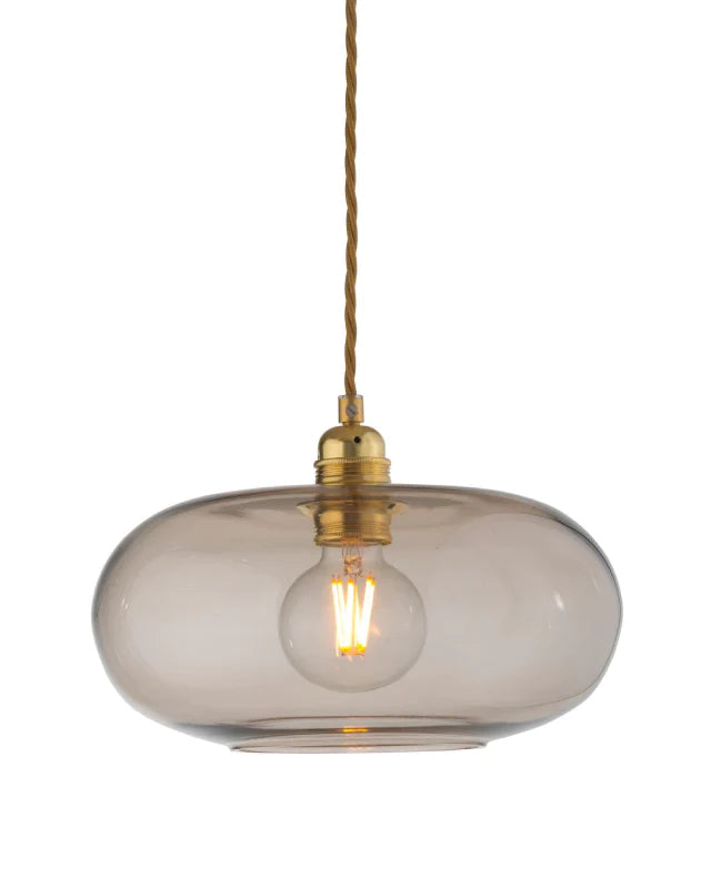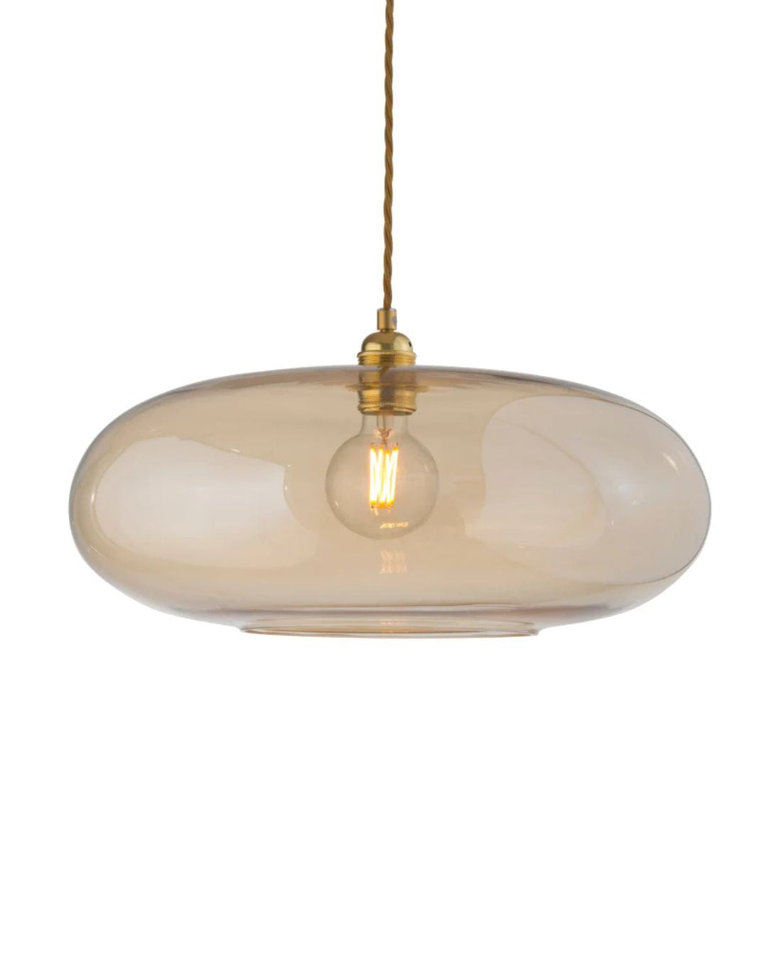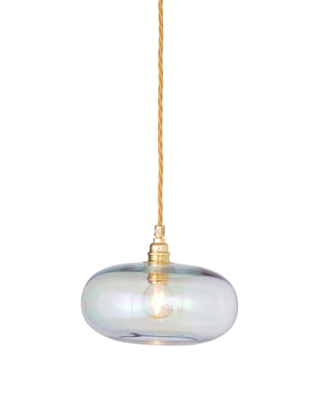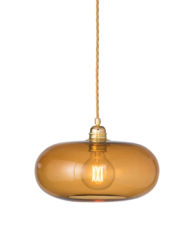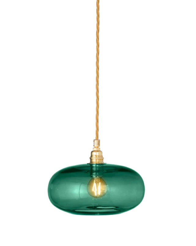 This captivating pendant showcases a wide shape and shallow height. Designed and handmade in Denmark from mouth-blown glass this retro pendant is paired with gold detailing that will add a sophisticated ambience to any interior. Designed to be used as a single installation to create an interior focal point or installed as a cluster. To be paired with an E27 globe (not included). Available in an assortment of glass colours and sizes.