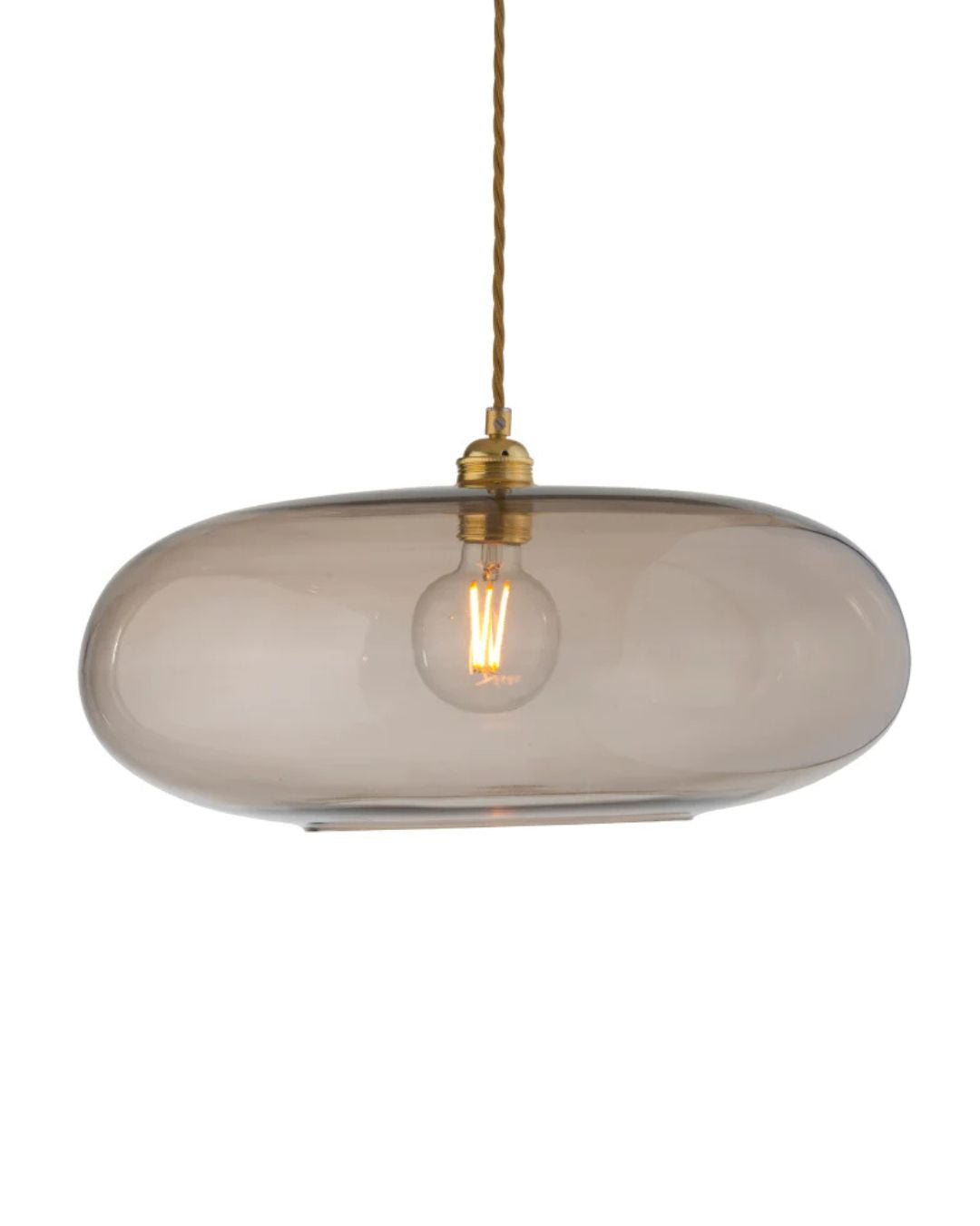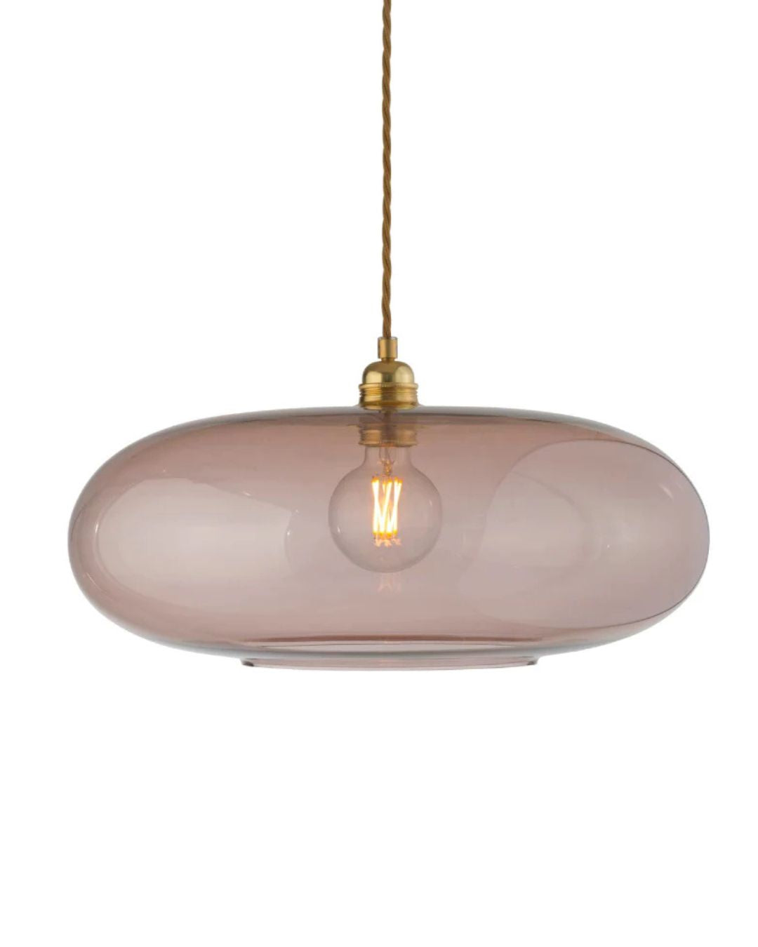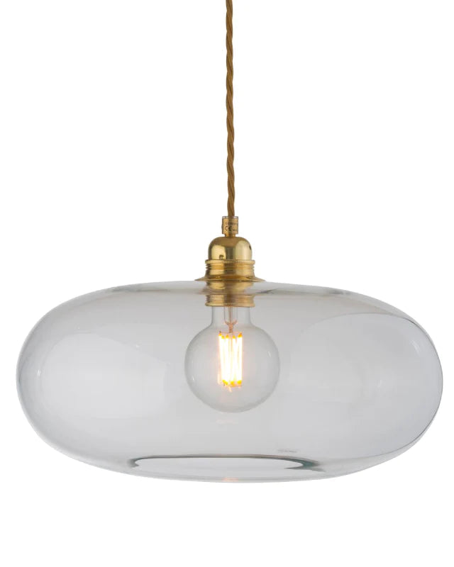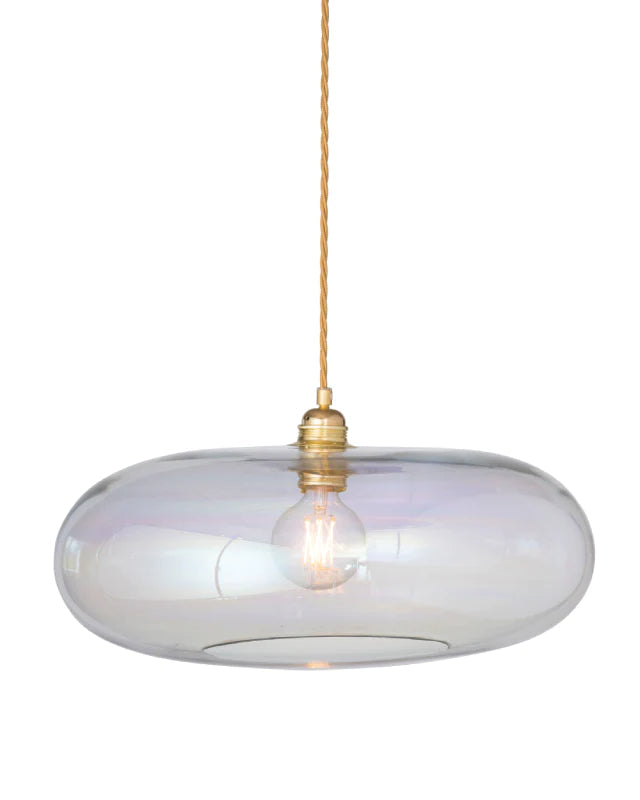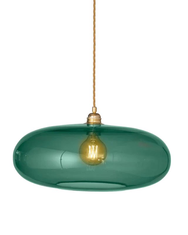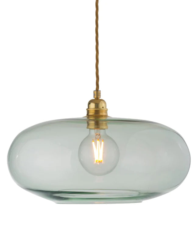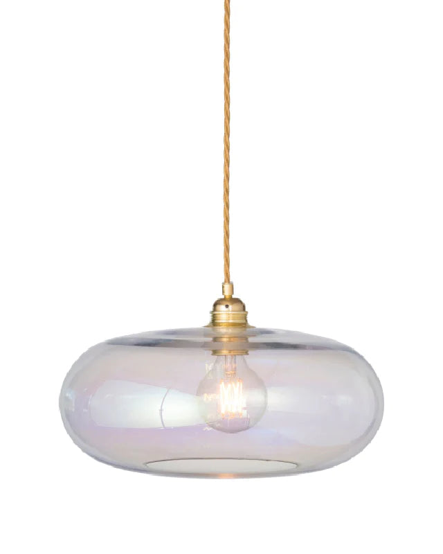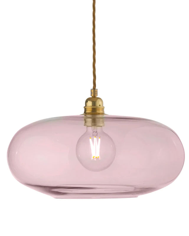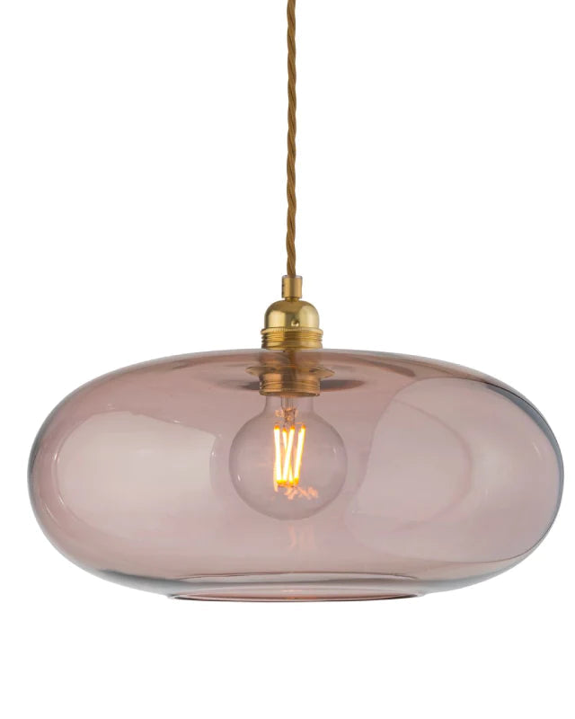 This captivating pendant showcases a wide shape and shallow height. Designed and handmade in Denmark from mouth-blown glass this retro pendant is paired with gold detailing that will add a sophisticated ambience to any interior. Designed to be used as a single installation to create an interior focal point or installed as a cluster. To be paired with an E27 globe (not included). Available in an assortment of glass colours and sizes.