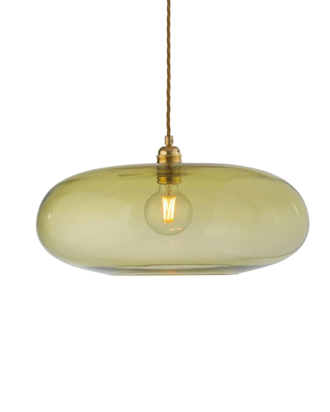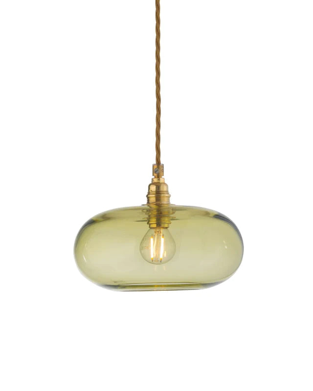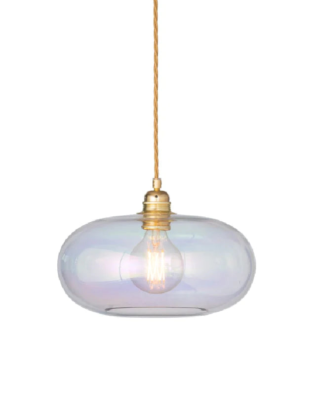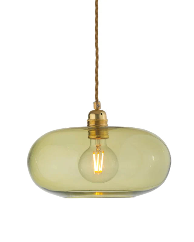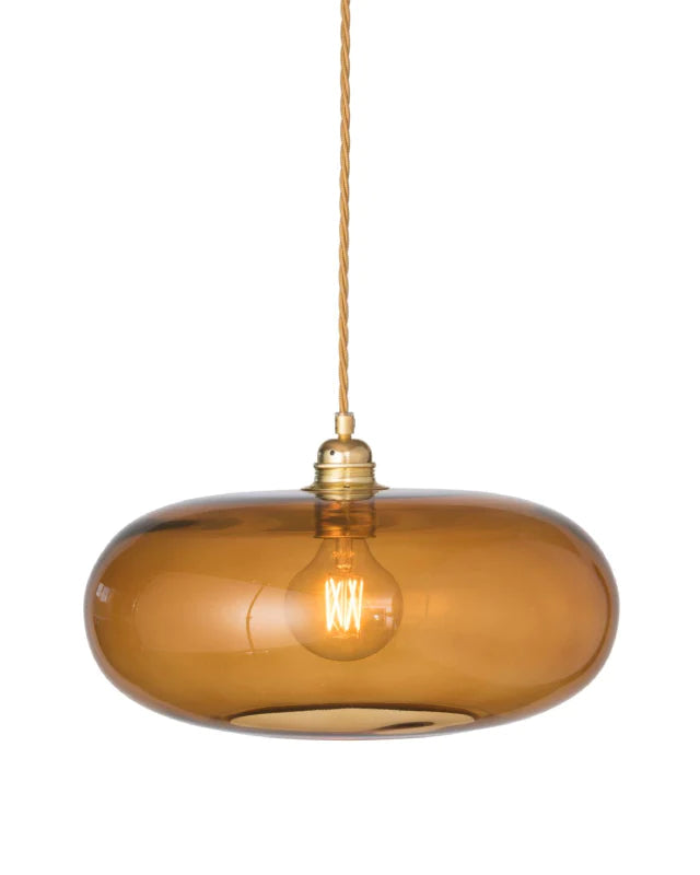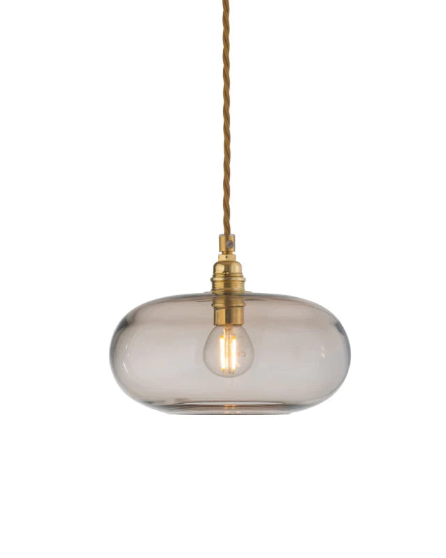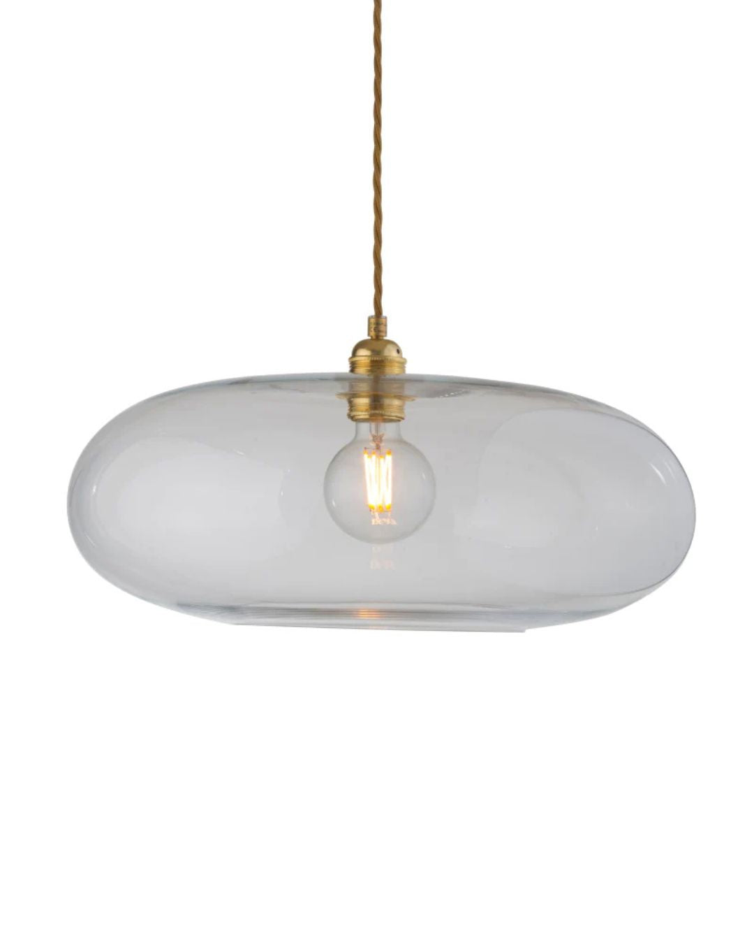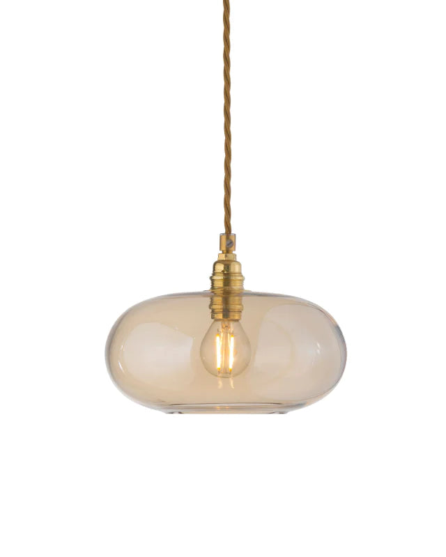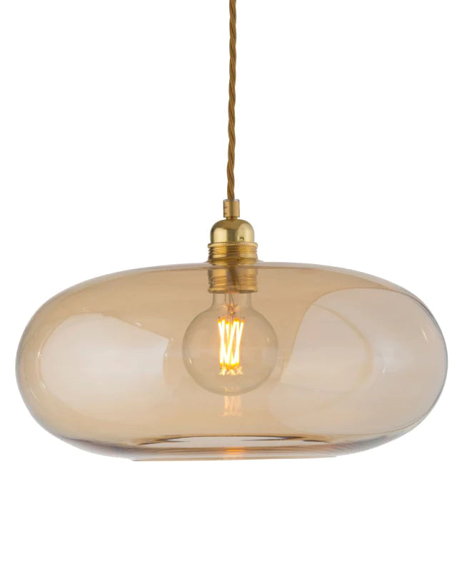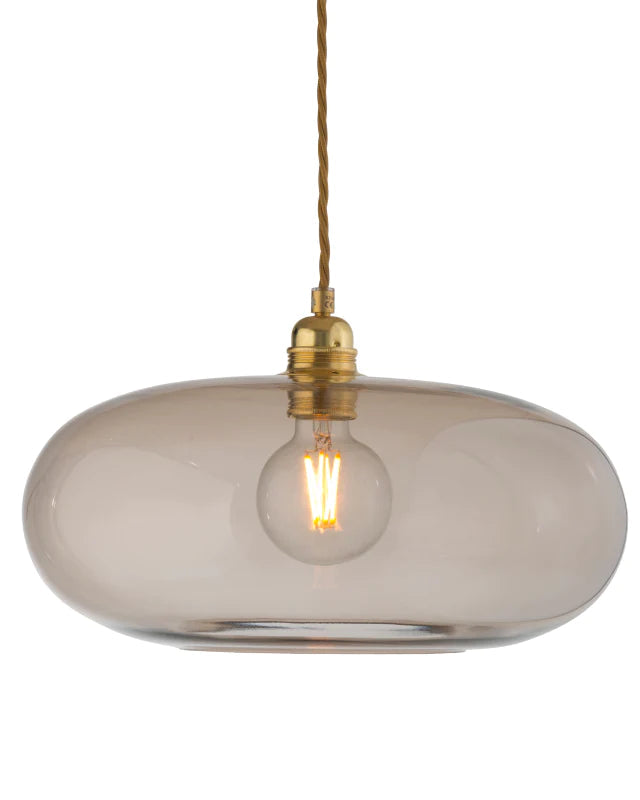 This captivating pendant showcases a wide shape and shallow height. Designed and handmade in Denmark from mouth-blown glass this retro pendant is paired with gold detailing that will add a sophisticated ambience to any interior. Designed to be used as a single installation to create an interior focal point or installed as a cluster. To be paired with an E27 globe (not included). Available in an assortment of glass colours and sizes.