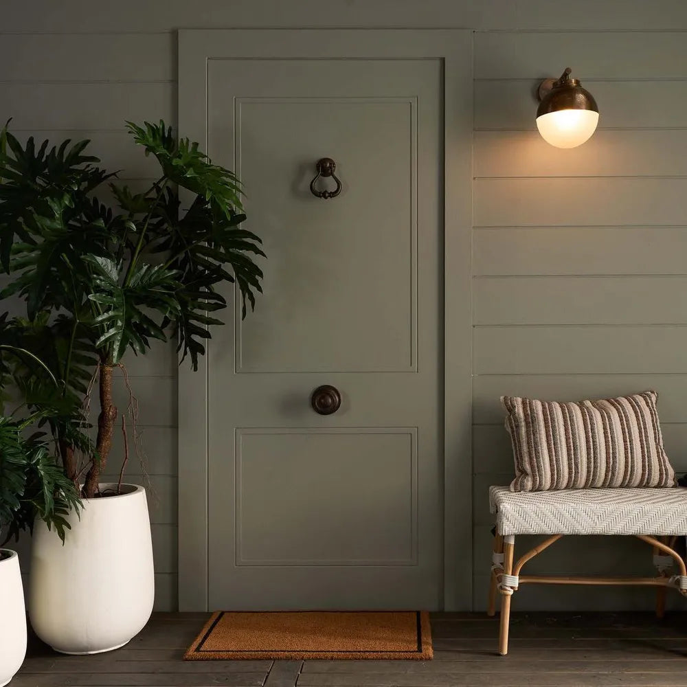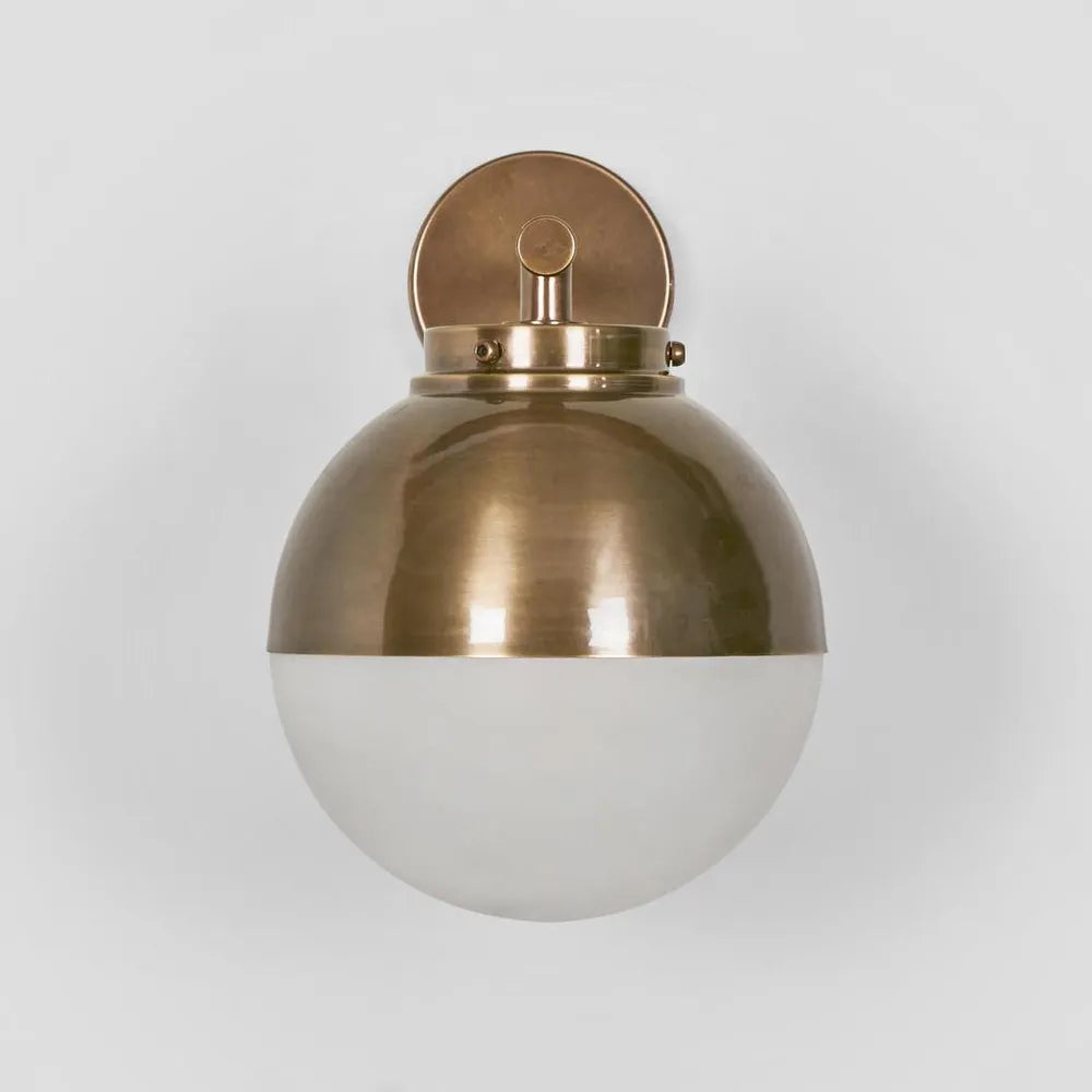 Crafted from solid brass, this wall light features a short arm fixed to a circular base supporting an elegant orb composed of antique brass and glass. Its timeless design and adaptable nature provide an inviting illumination, complementing a range of interior styles including traditional and vintage.