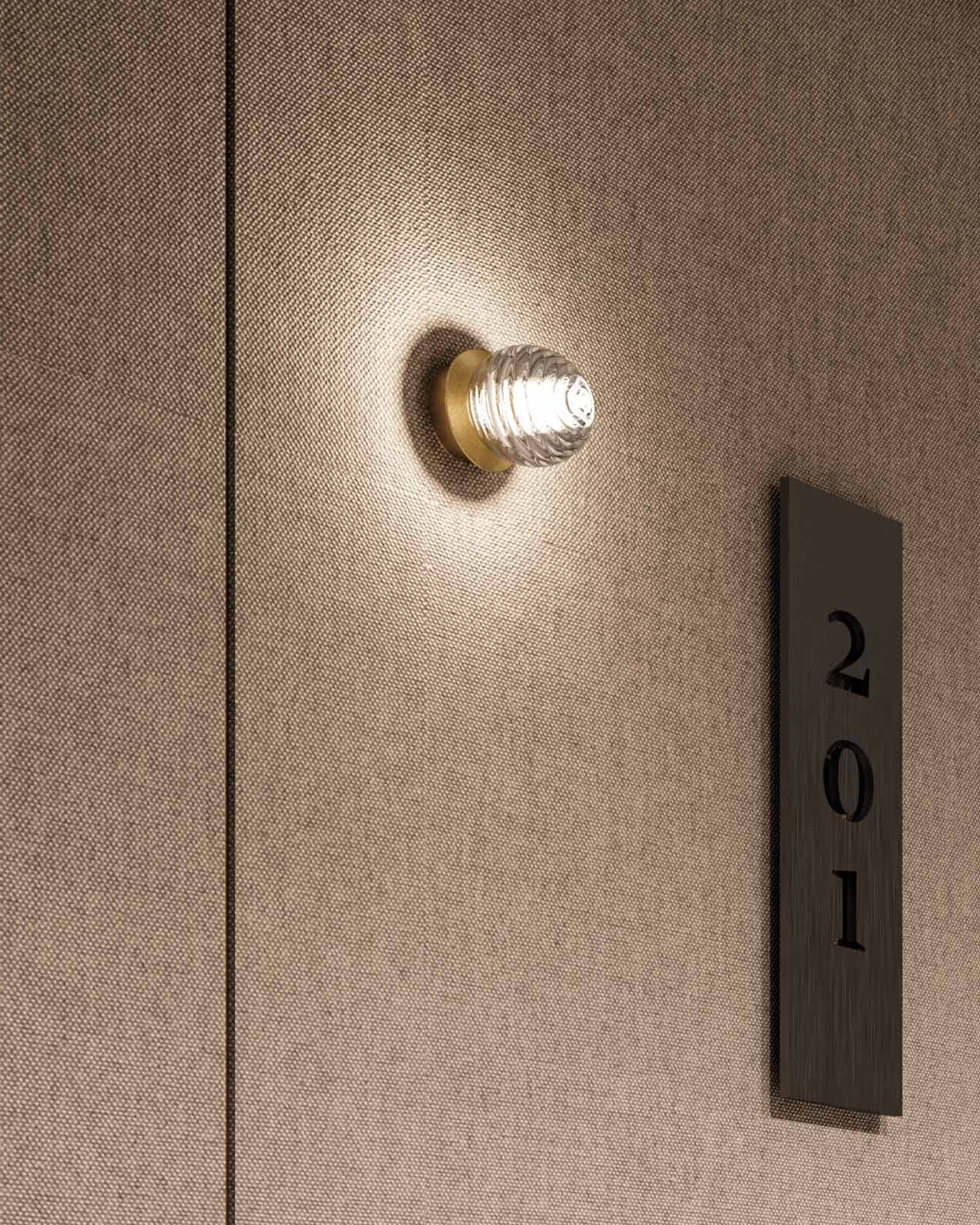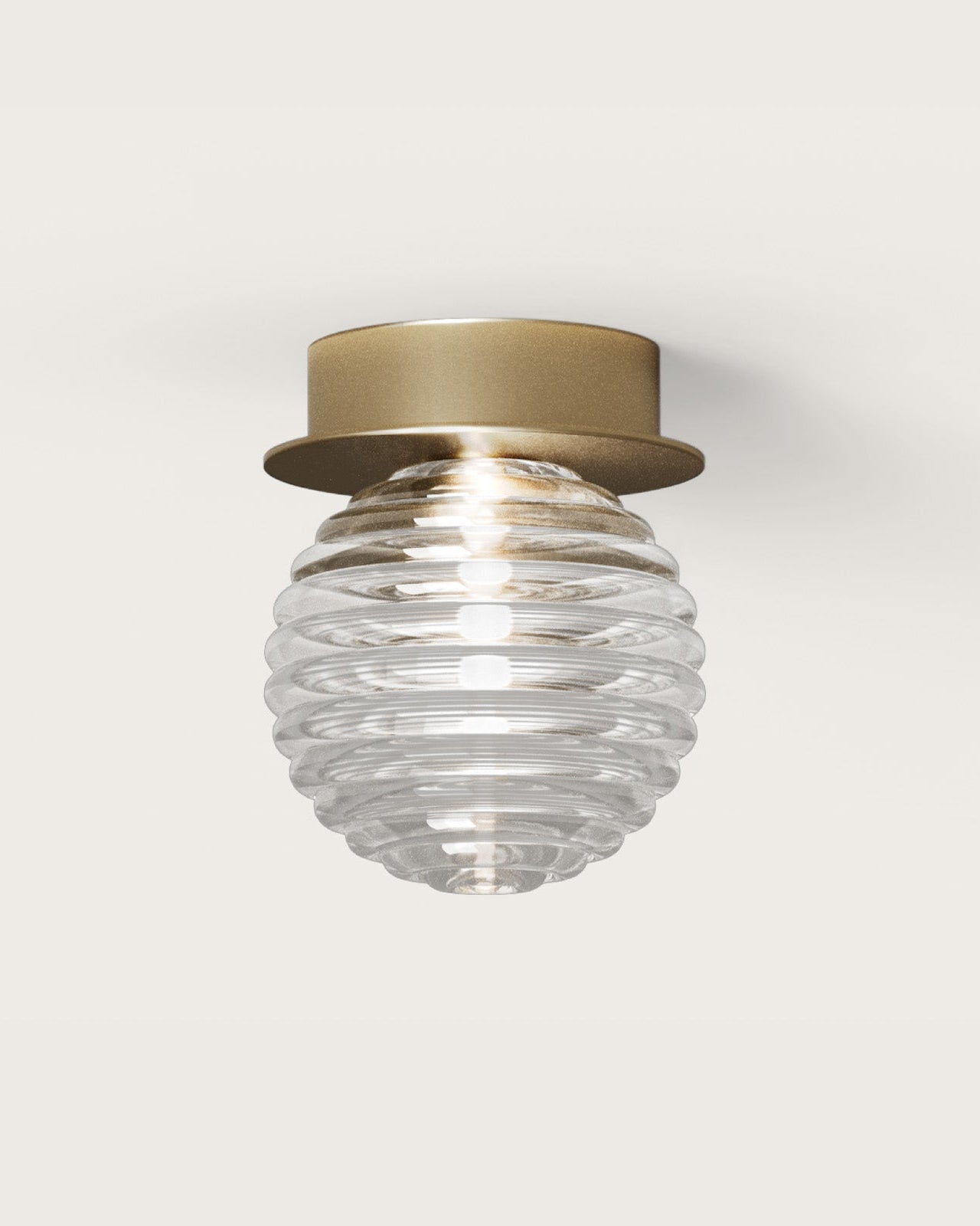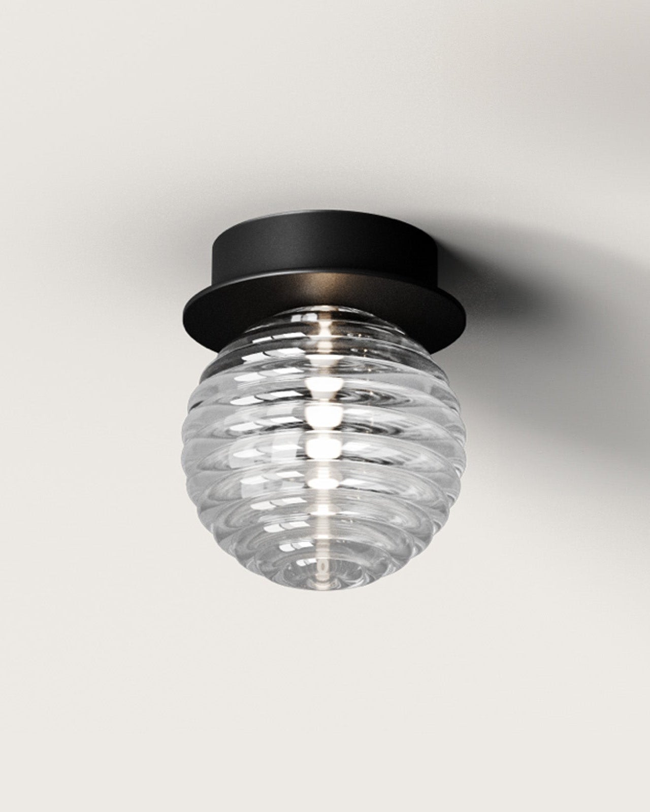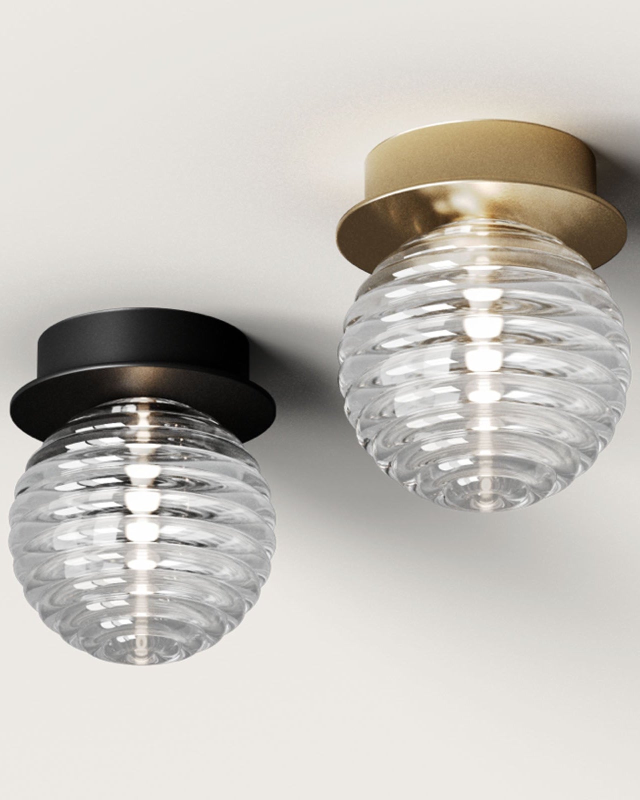 Displayed as a ceiling or wall light, this jewel-like fixture will easily make an impact in modern or contemporary interiors bringing softness and timeless elegance. With its diminutive size, the ridged singular sphere is mounted on a simple rounded fixture available in matte black or matte brass. A soft and ambient light will be nicely spread in living rooms, bedrooms, or corridors.