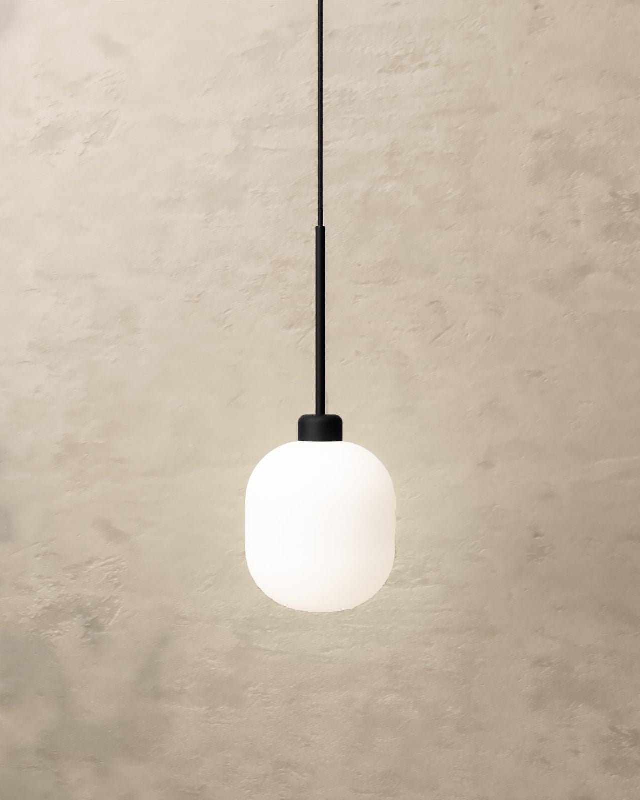 The Elegant Curved Glass Pendant Light will make a minimalist sleek statement in a living room, dining room, bedroom, or suspended over a table or on the side of a bed. Featuring a contemporary compact suspension, available in either a textured white or black finish with a bold curved shade that is crafted from high-quality mouth-blown glass.