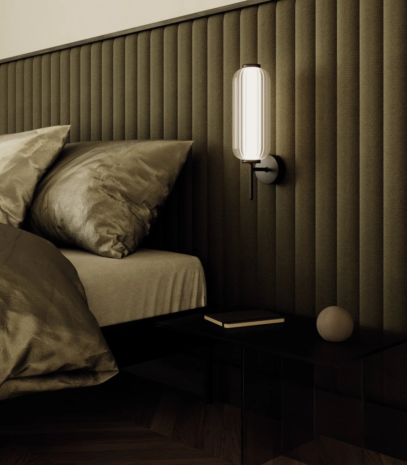 This modern wall light features an oblong striped glass shade paired with a refined metal fixture, creating a piece that is both sculptural and functional. Designed to enhance contemporary interiors, it casts a soft, even glow through its opal acrylic centre, providing ambient illumination perfect for bedrooms, hallways, or living areas.