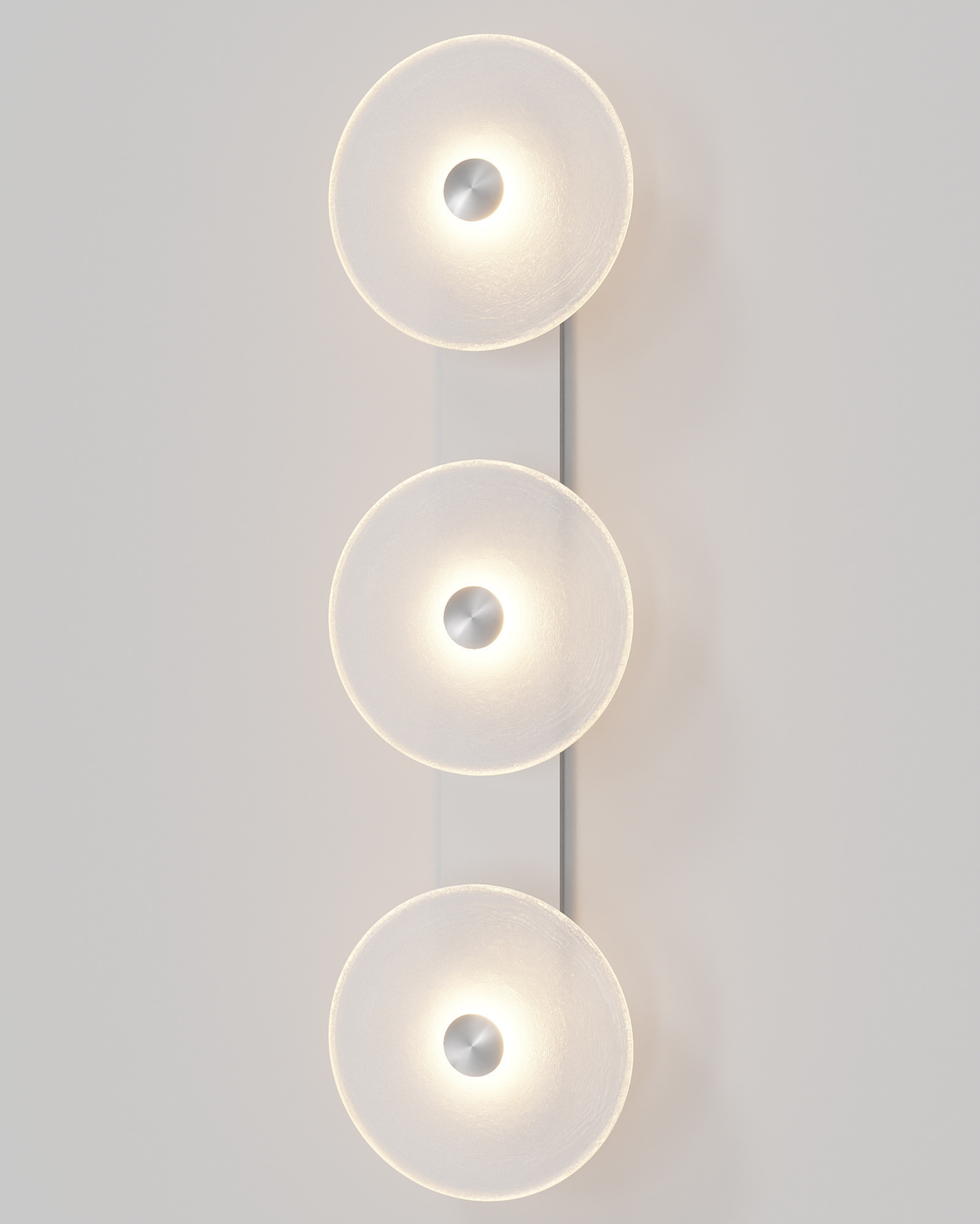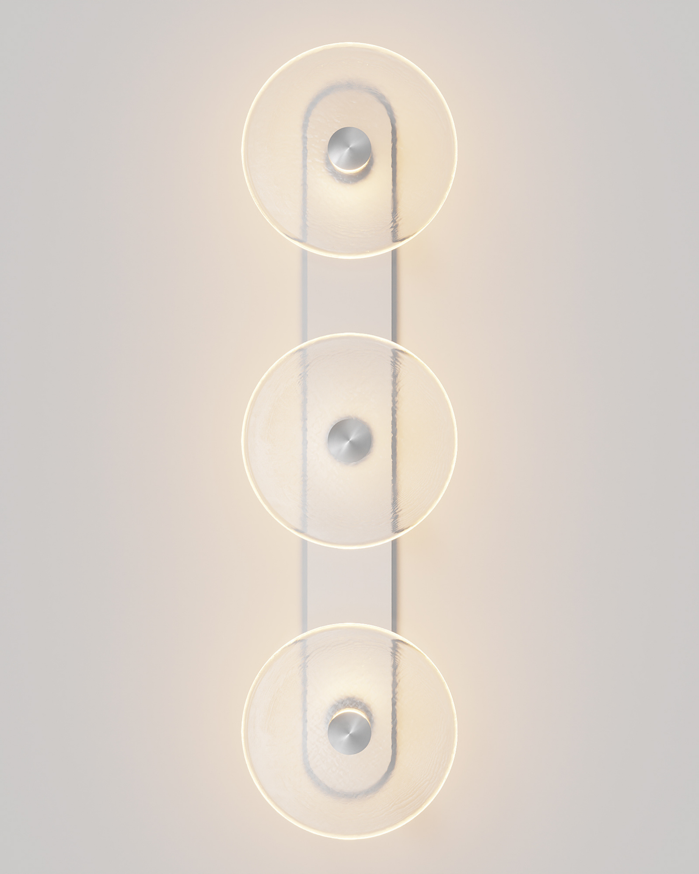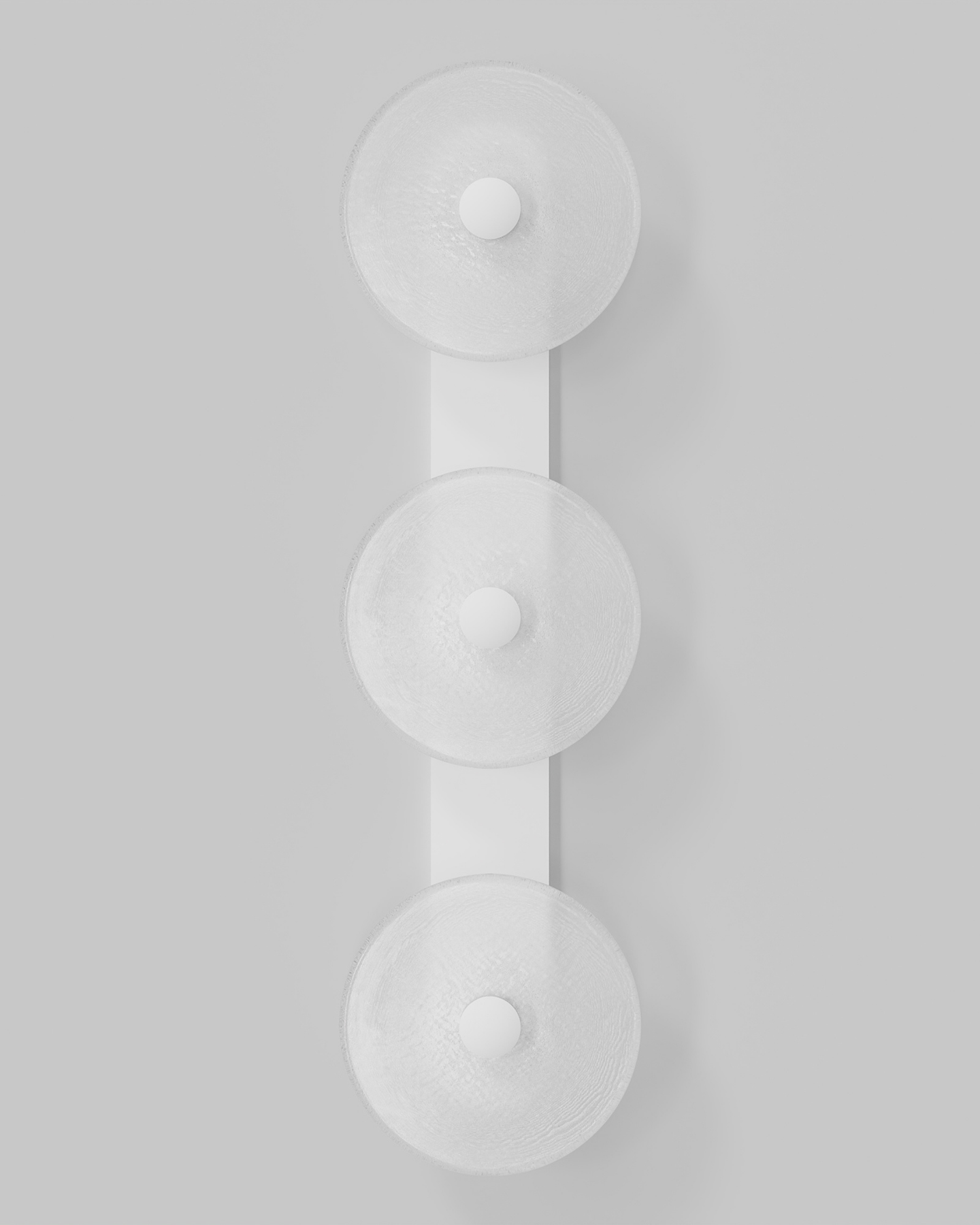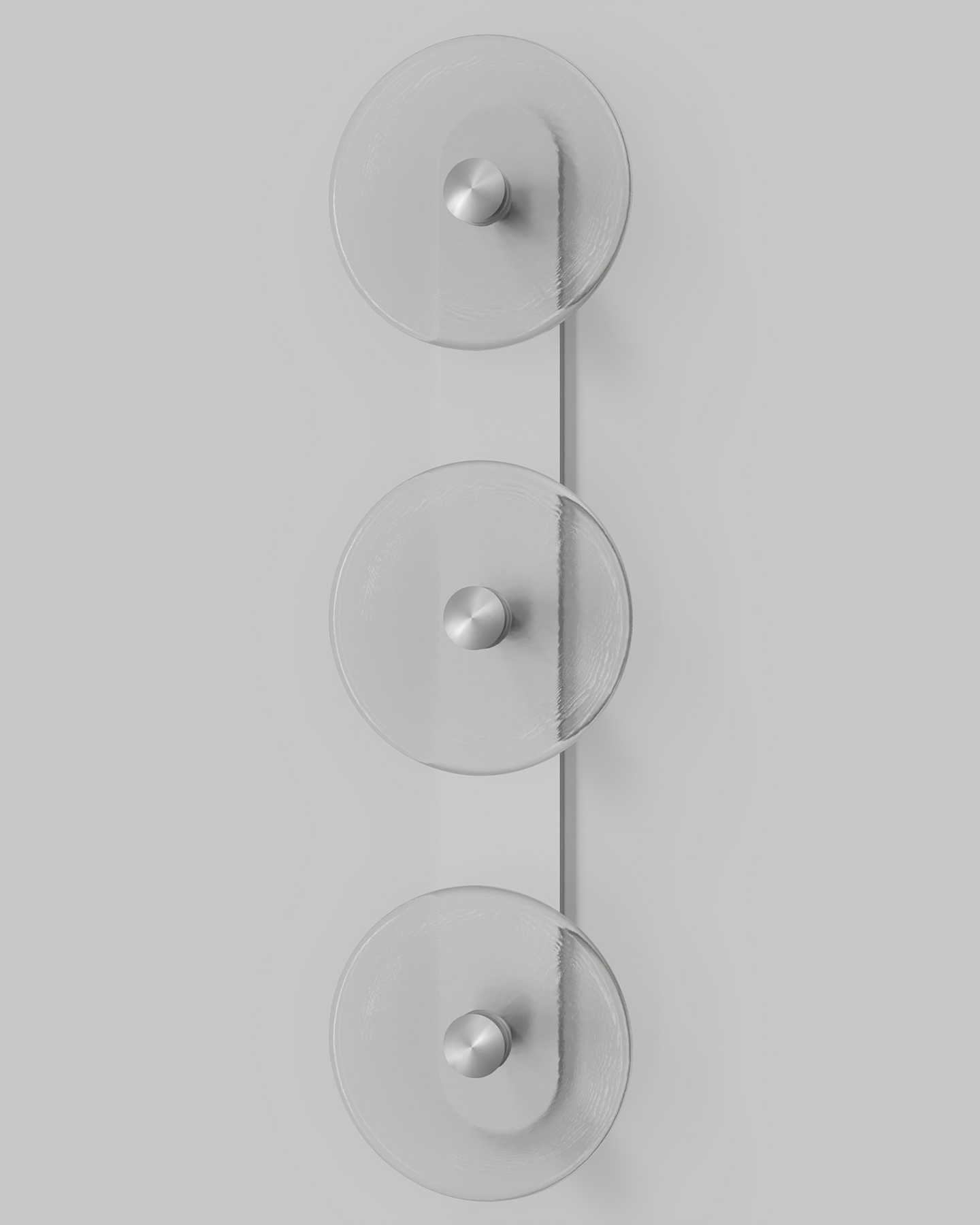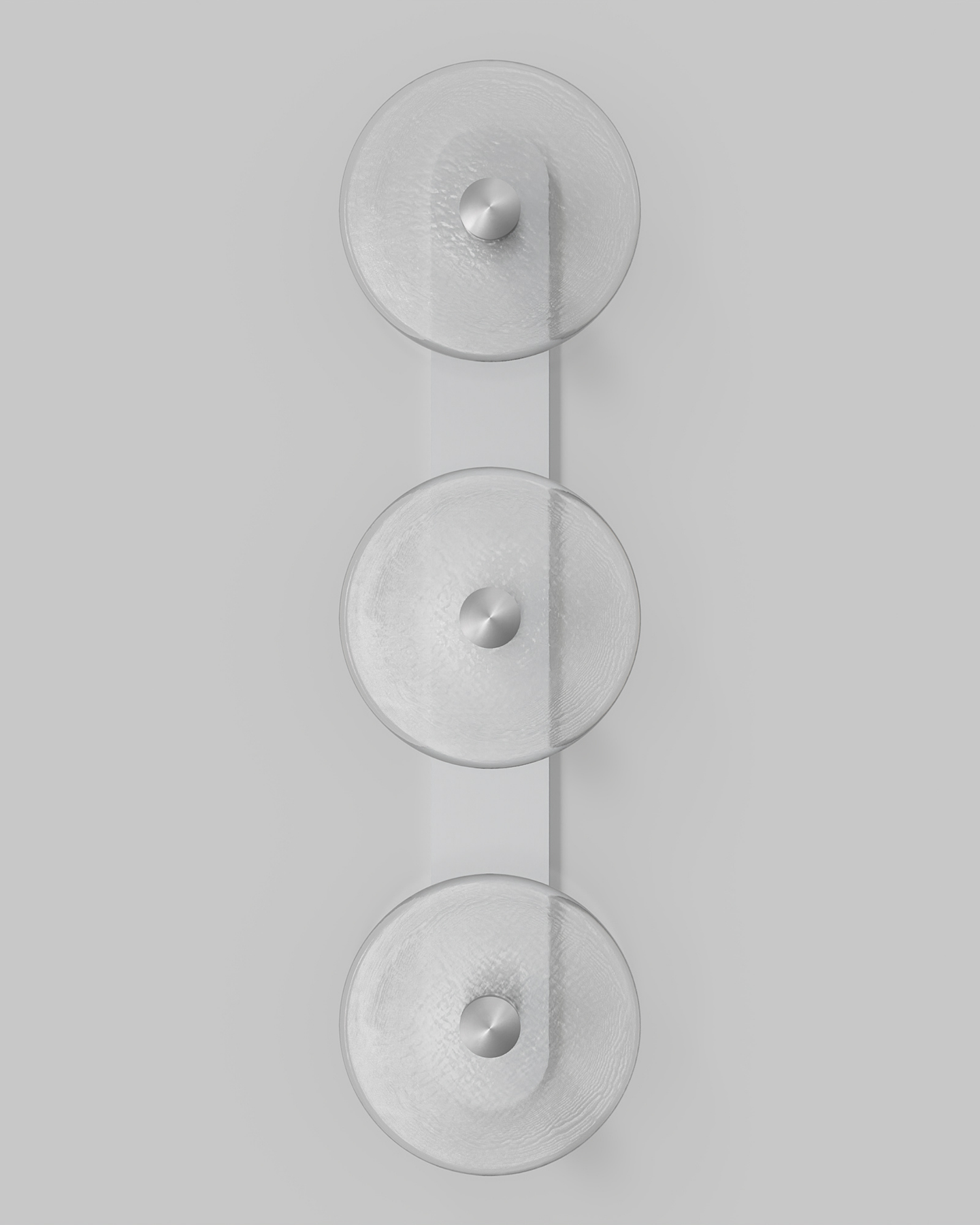 Individually handmade in Currumbin, Australia, this design is crafted from hand-blown frosted or clear Swedish glass. Designed by Oliver Höglund & Ryan Roberts, it features three discs mounted upon a sleek wall mount, making it ideal for both residential and architectural spaces. The glass is hand-blown at one thousand degrees Celsius, resulting in subtle variations that make each piece unique.