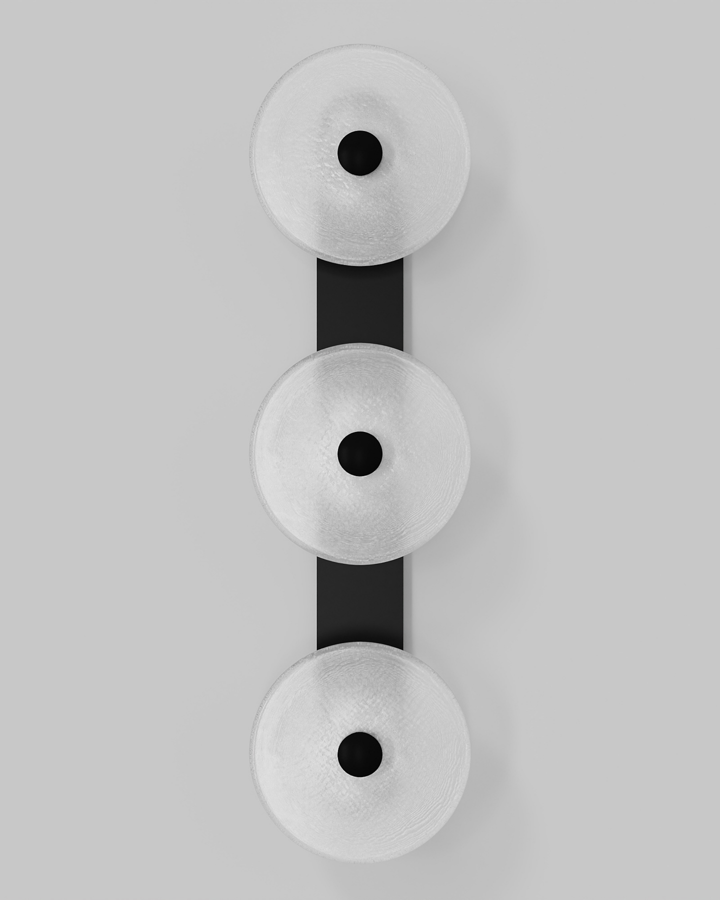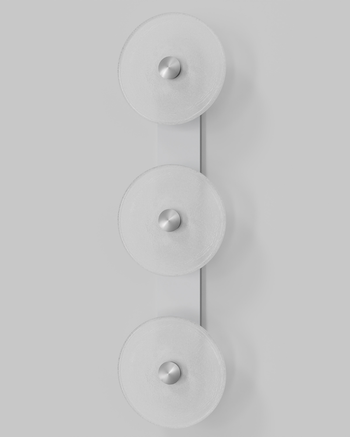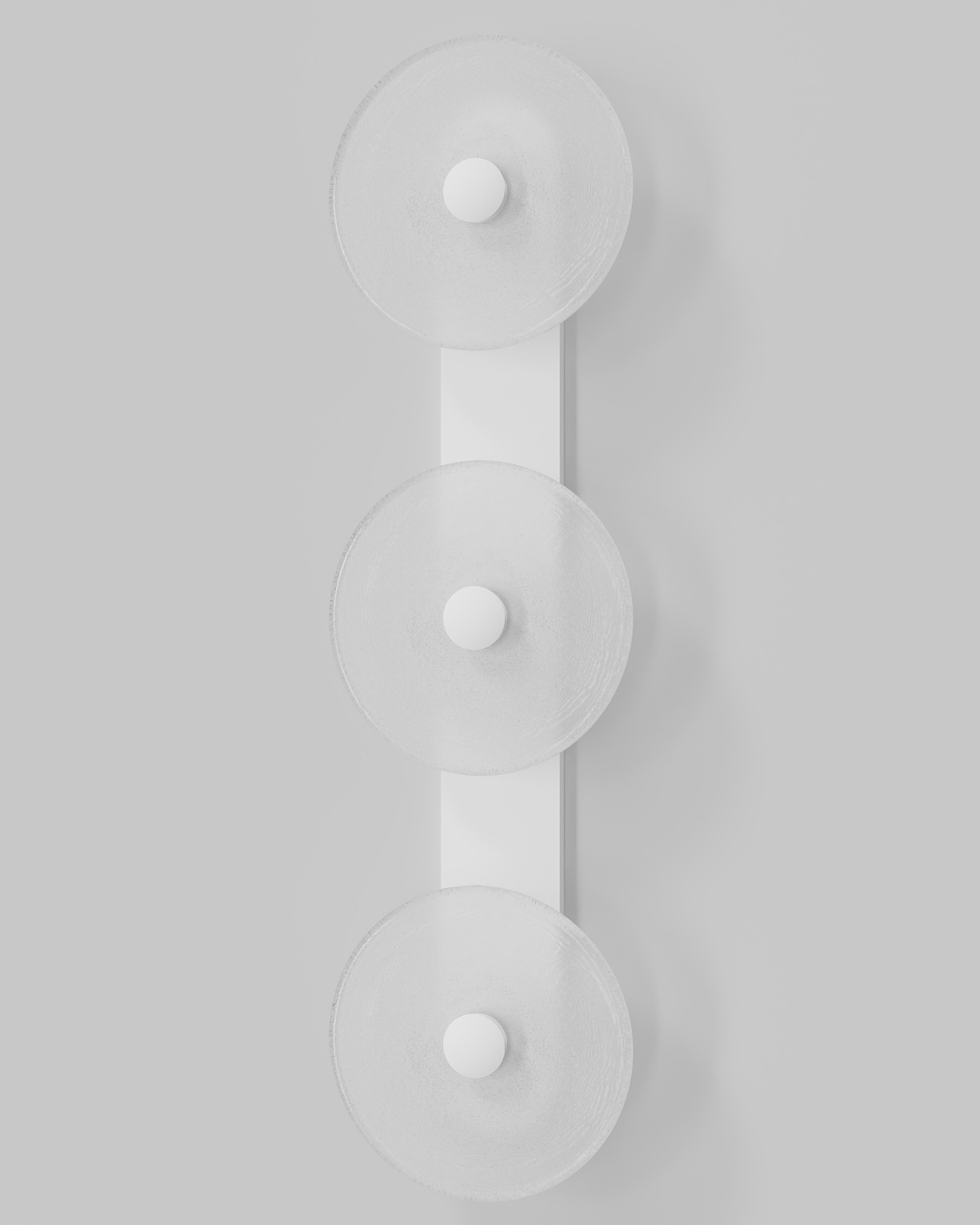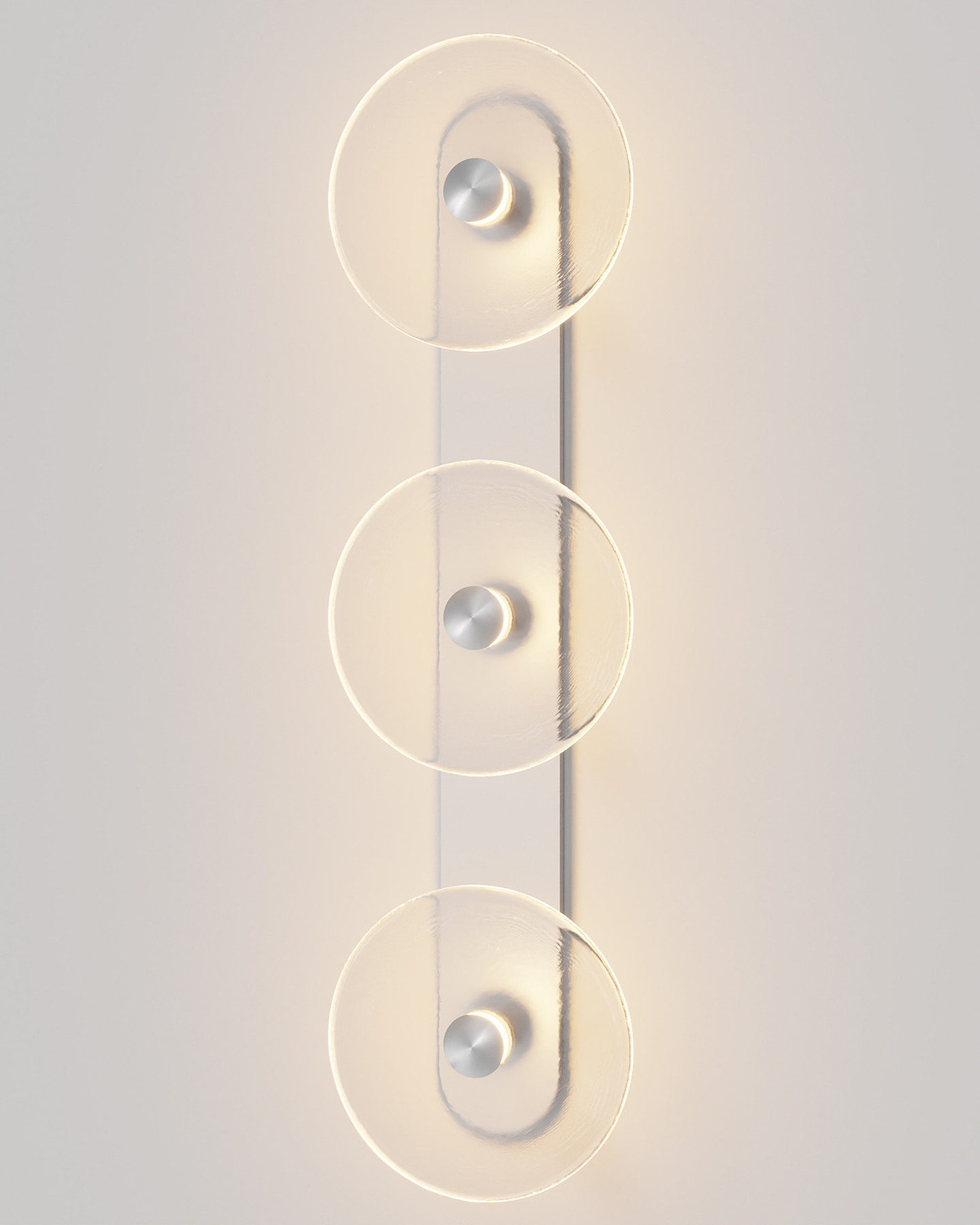 Individually handmade in Currumbin, Australia, this design is crafted from hand-blown frosted or clear Swedish glass. Designed by Oliver Höglund & Ryan Roberts, it features three discs mounted upon a sleek wall mount, making it ideal for both residential and architectural spaces. The glass is hand-blown at one thousand degrees Celsius, resulting in subtle variations that make each piece unique.