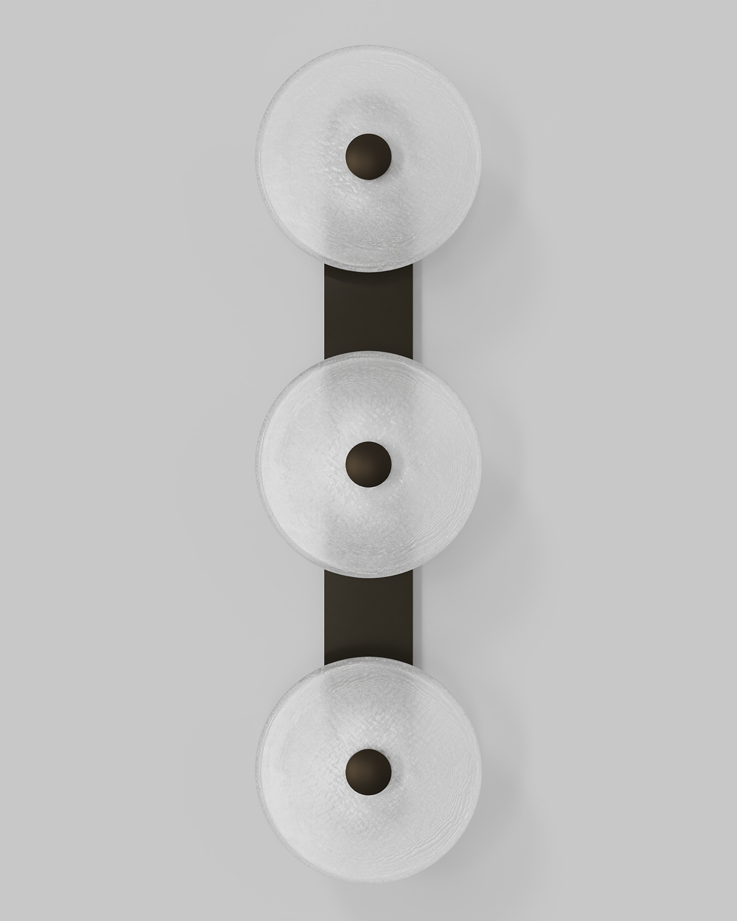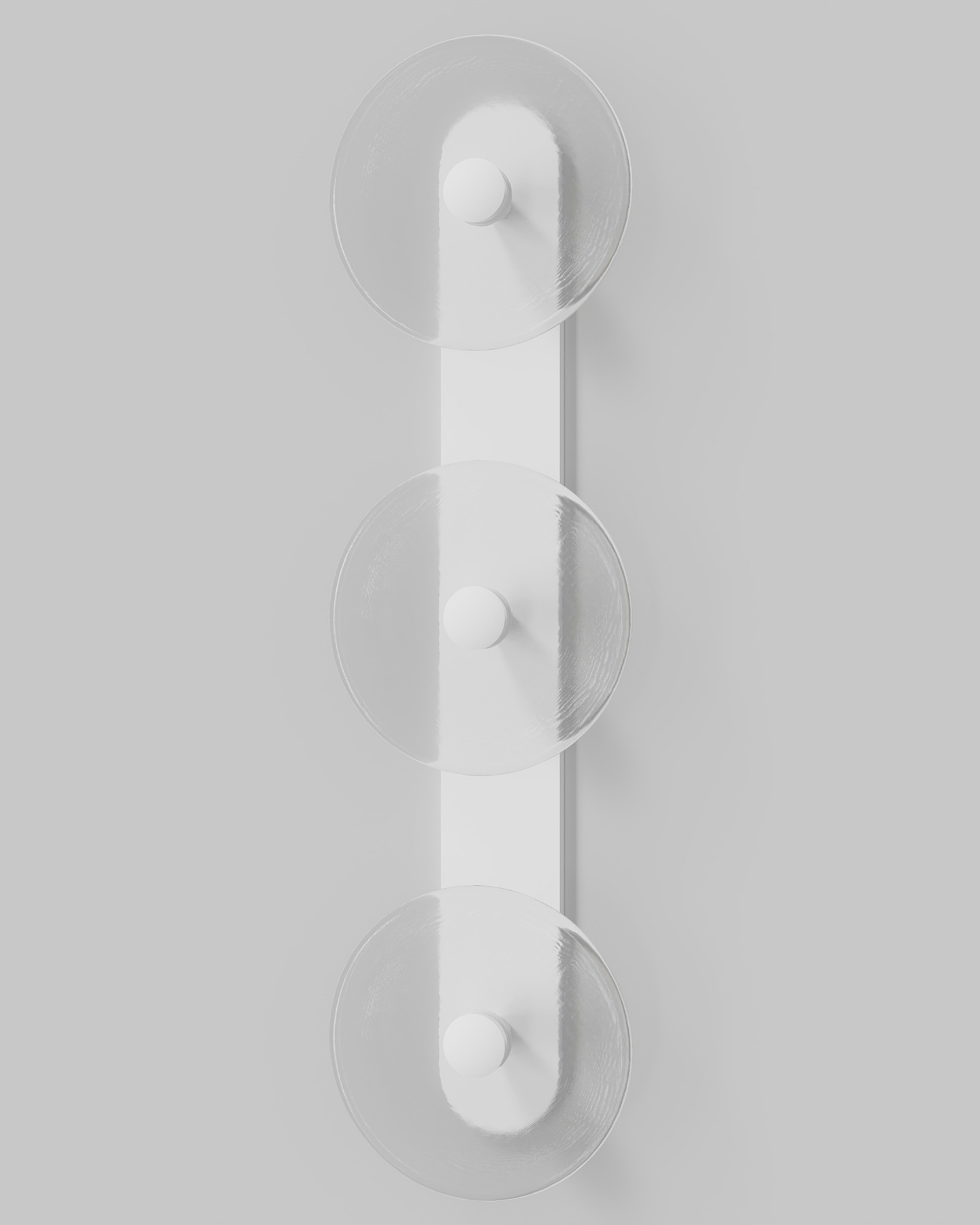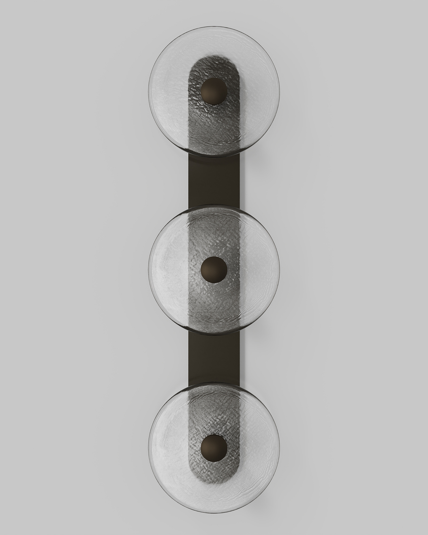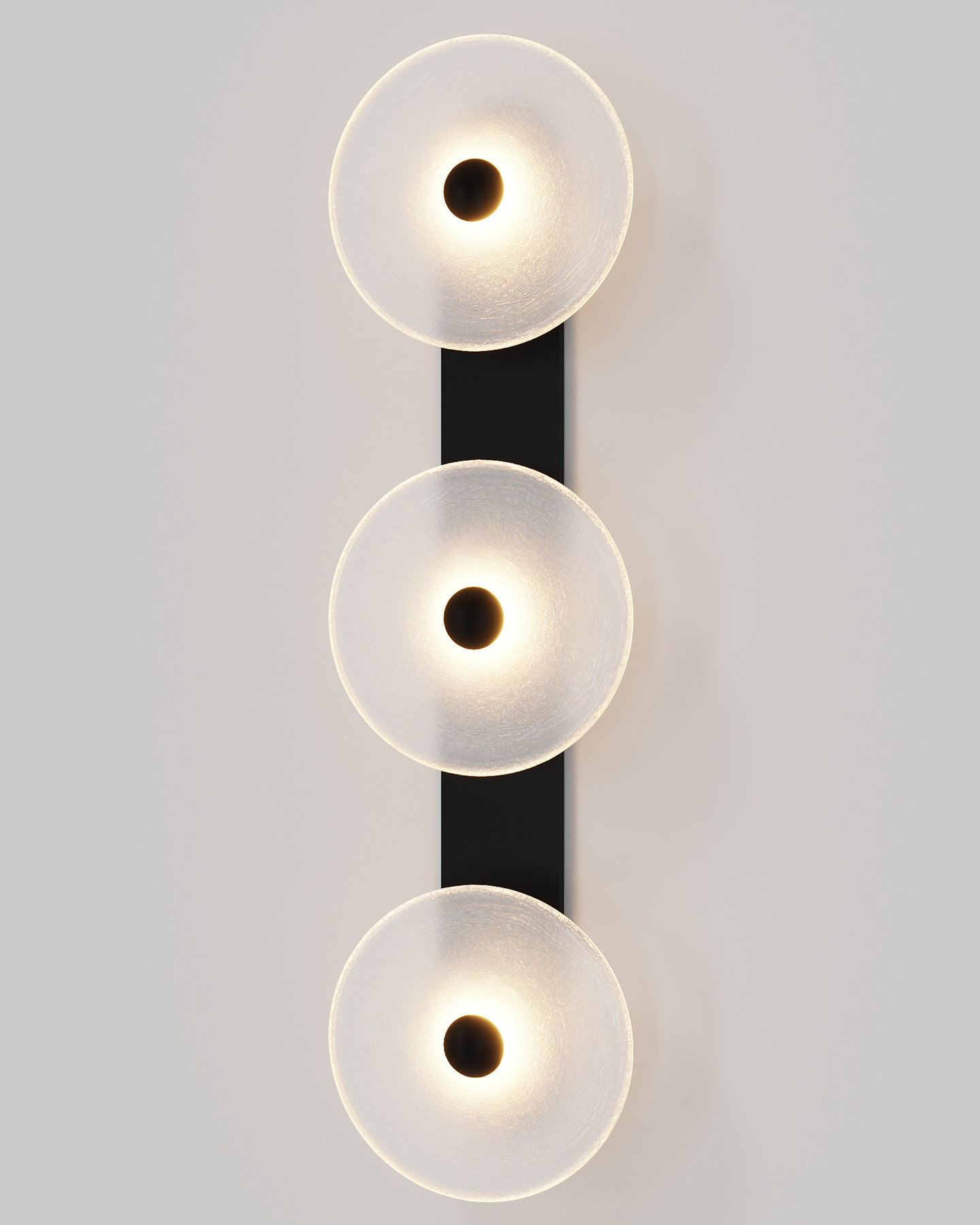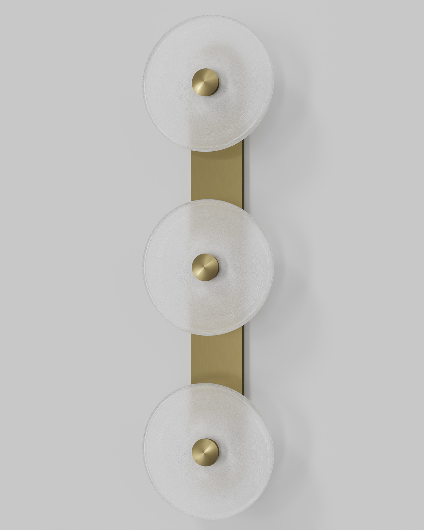 Individually handmade in Currumbin, Australia, this design is crafted from hand-blown frosted or clear Swedish glass. Designed by Oliver Höglund & Ryan Roberts, it features three discs mounted upon a sleek wall mount, making it ideal for both residential and architectural spaces. The glass is hand-blown at one thousand degrees Celsius, resulting in subtle variations that make each piece unique.