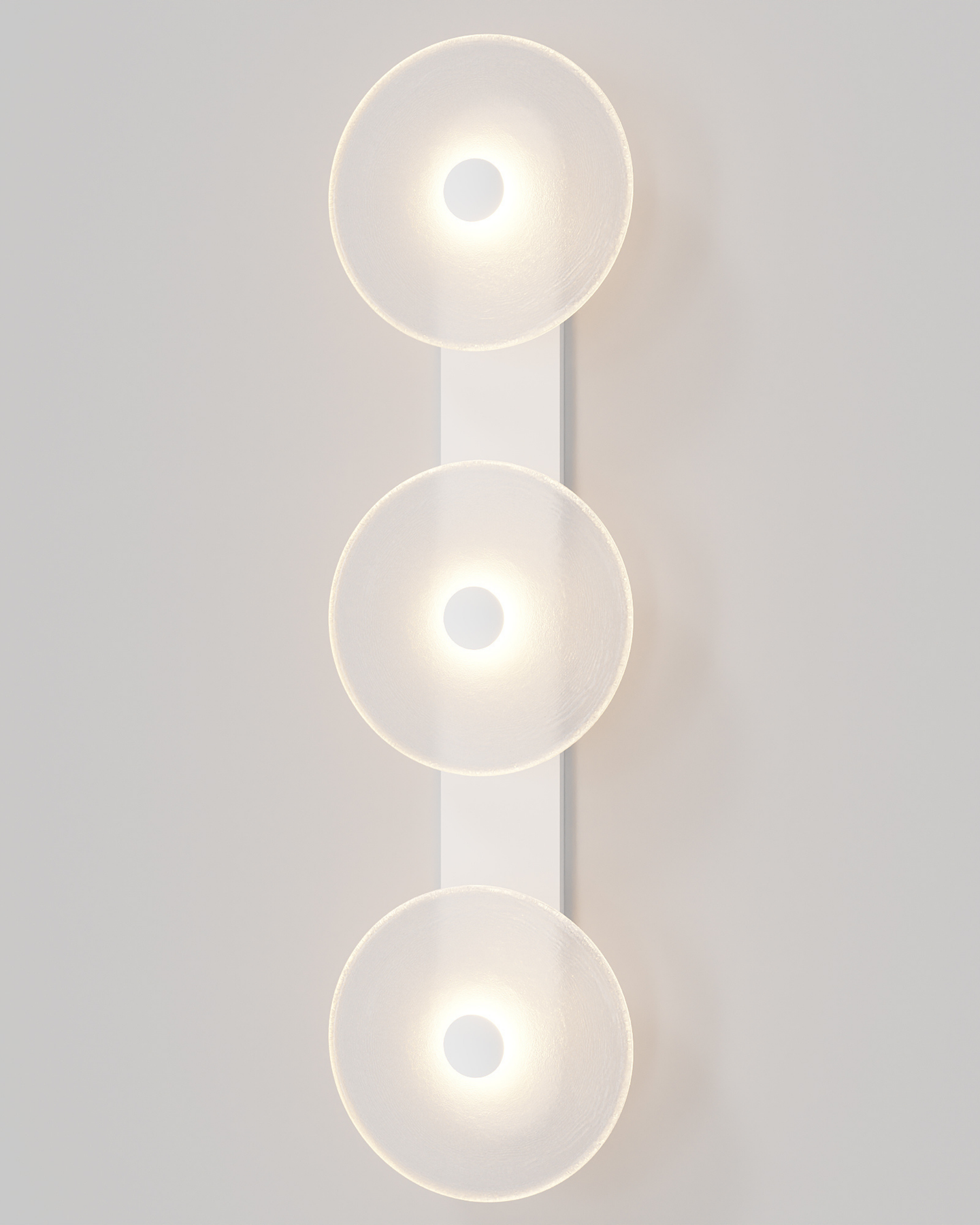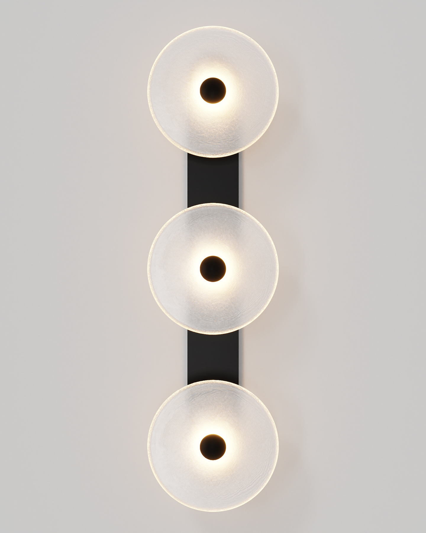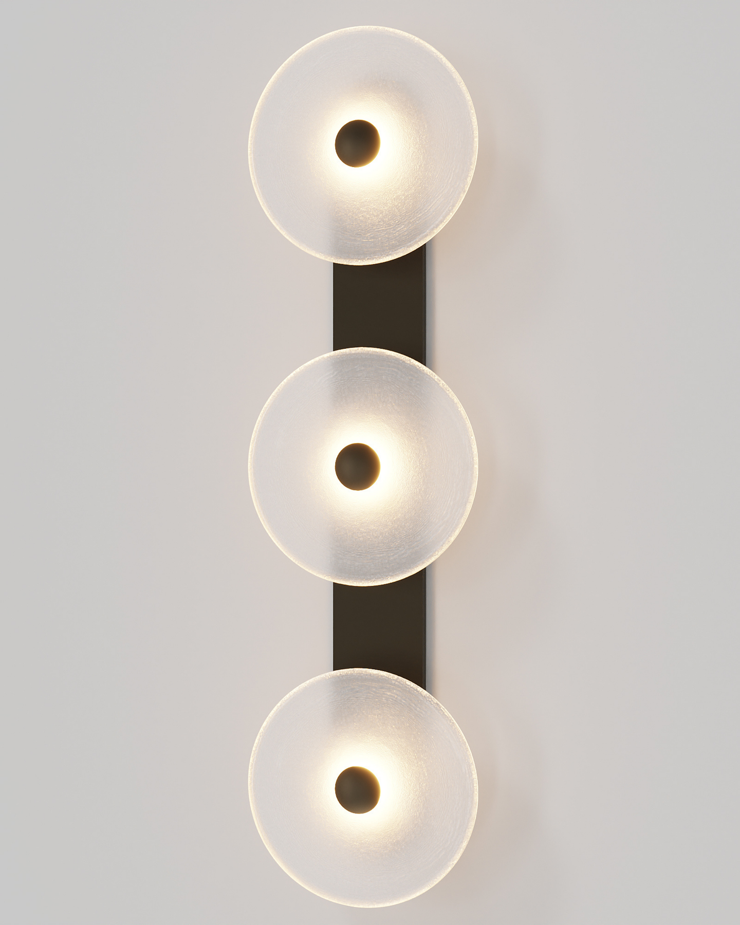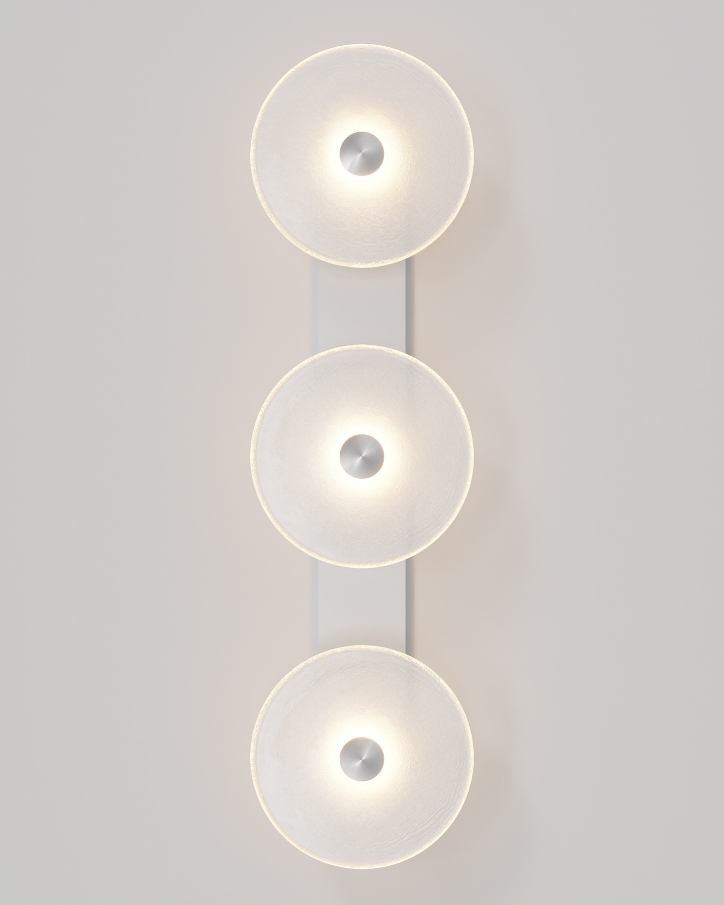 Individually handmade in Currumbin, Australia, this design is crafted from hand-blown frosted or clear Swedish glass. Designed by Oliver Höglund & Ryan Roberts, it features three discs mounted upon a sleek wall mount, making it ideal for both residential and architectural spaces. The glass is hand-blown at one thousand degrees Celsius, resulting in subtle variations that make each piece unique.