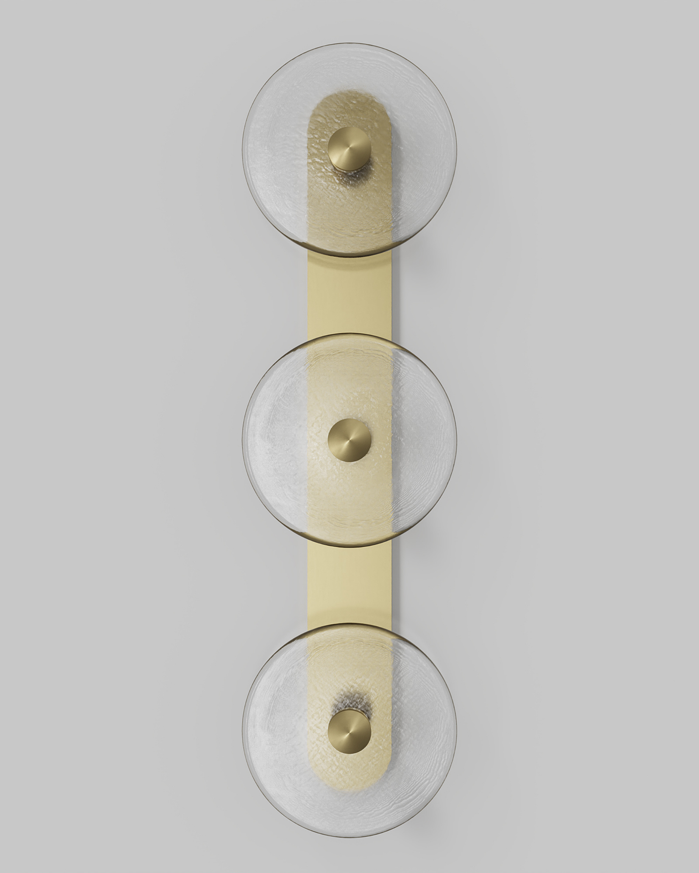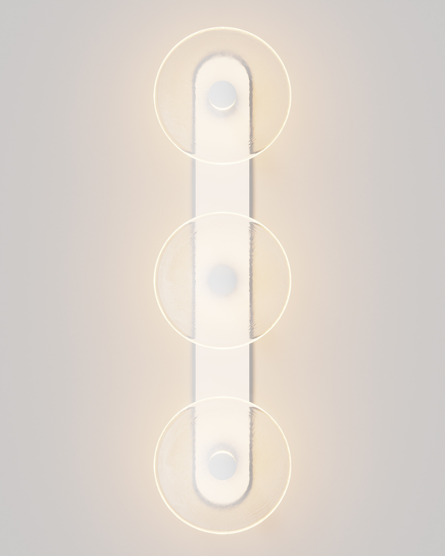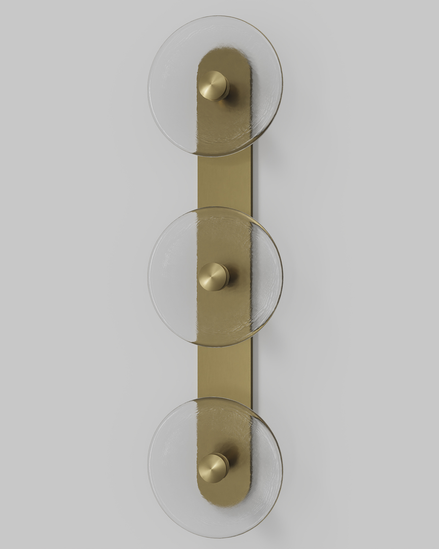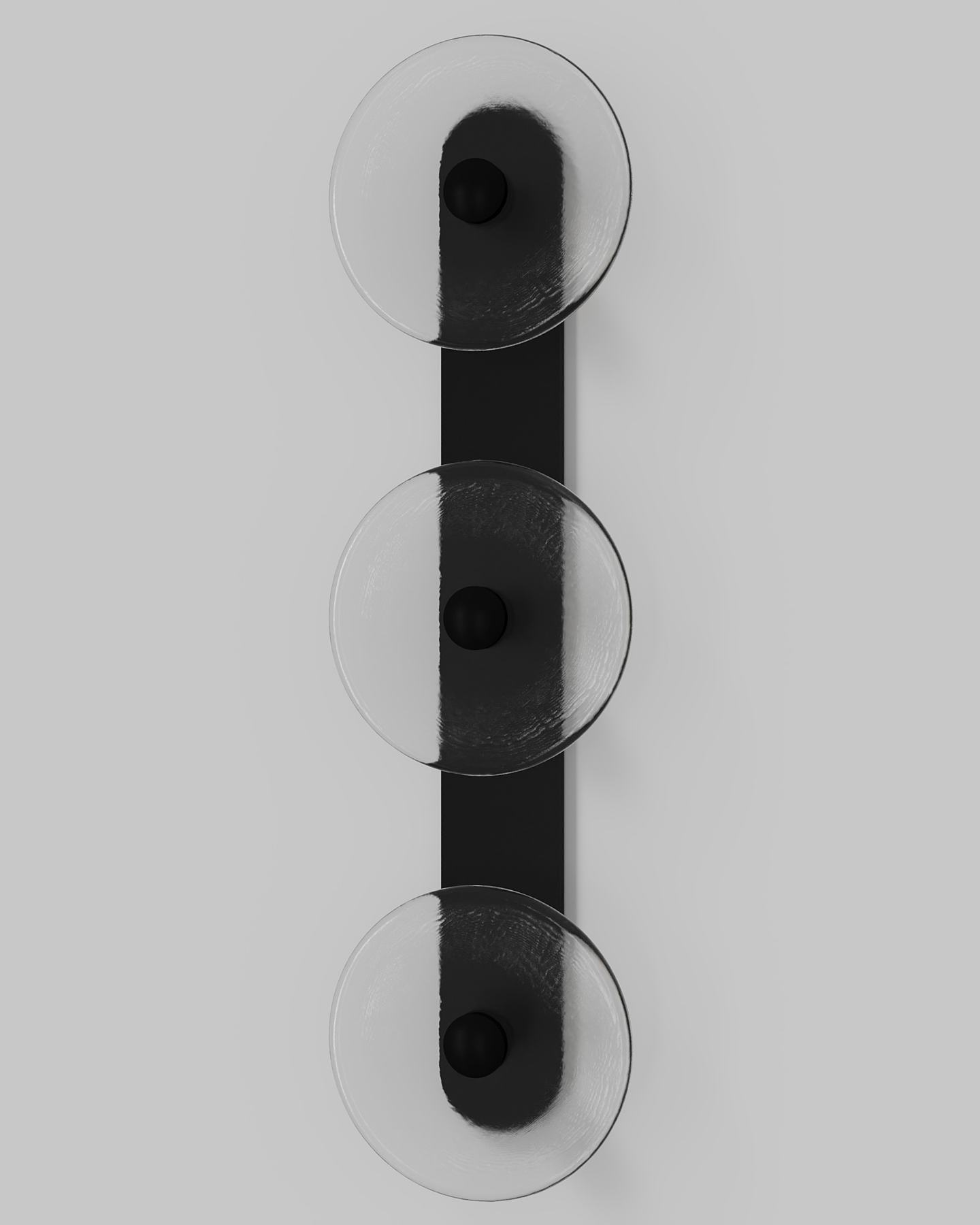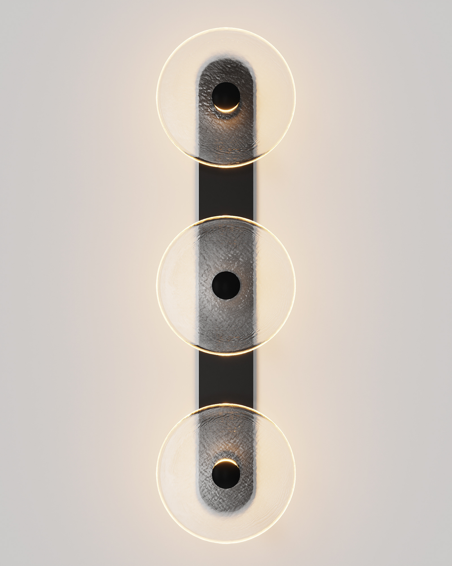 Individually handmade in Currumbin, Australia, this design is crafted from hand-blown frosted or clear Swedish glass. Designed by Oliver Höglund & Ryan Roberts, it features three discs mounted upon a sleek wall mount, making it ideal for both residential and architectural spaces. The glass is hand-blown at one thousand degrees Celsius, resulting in subtle variations that make each piece unique.