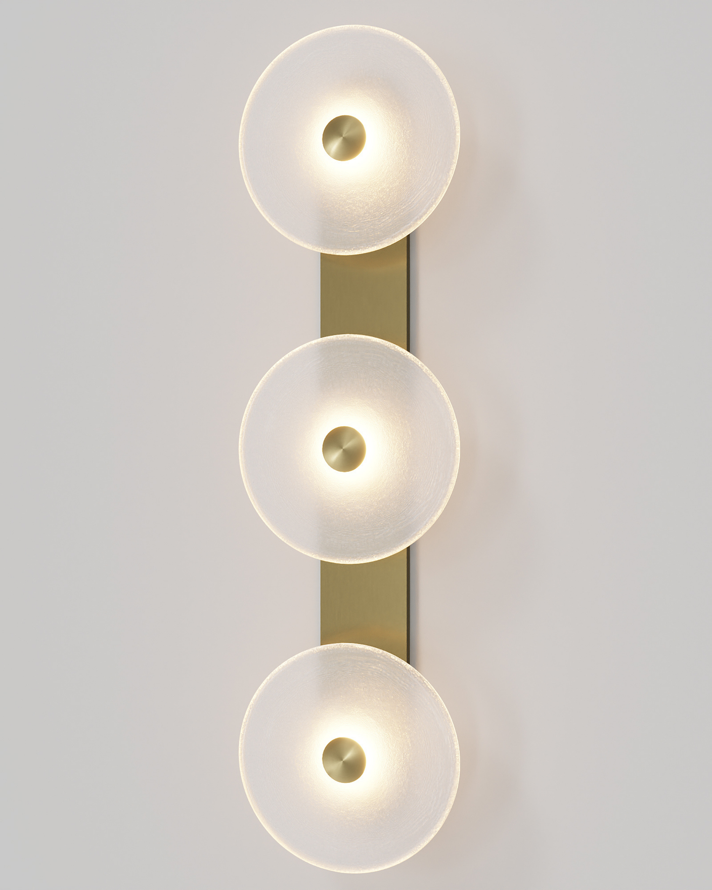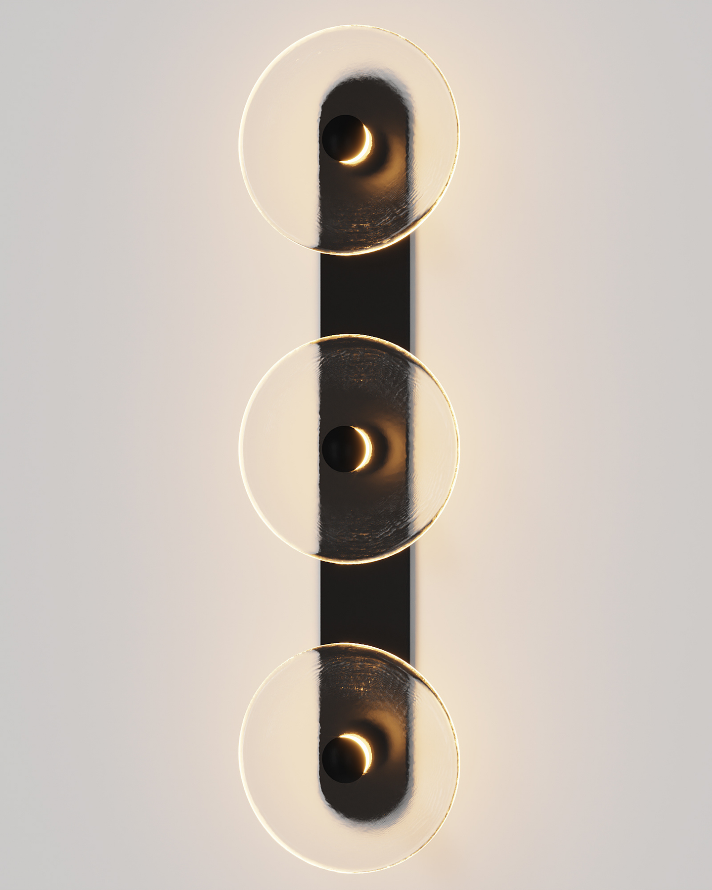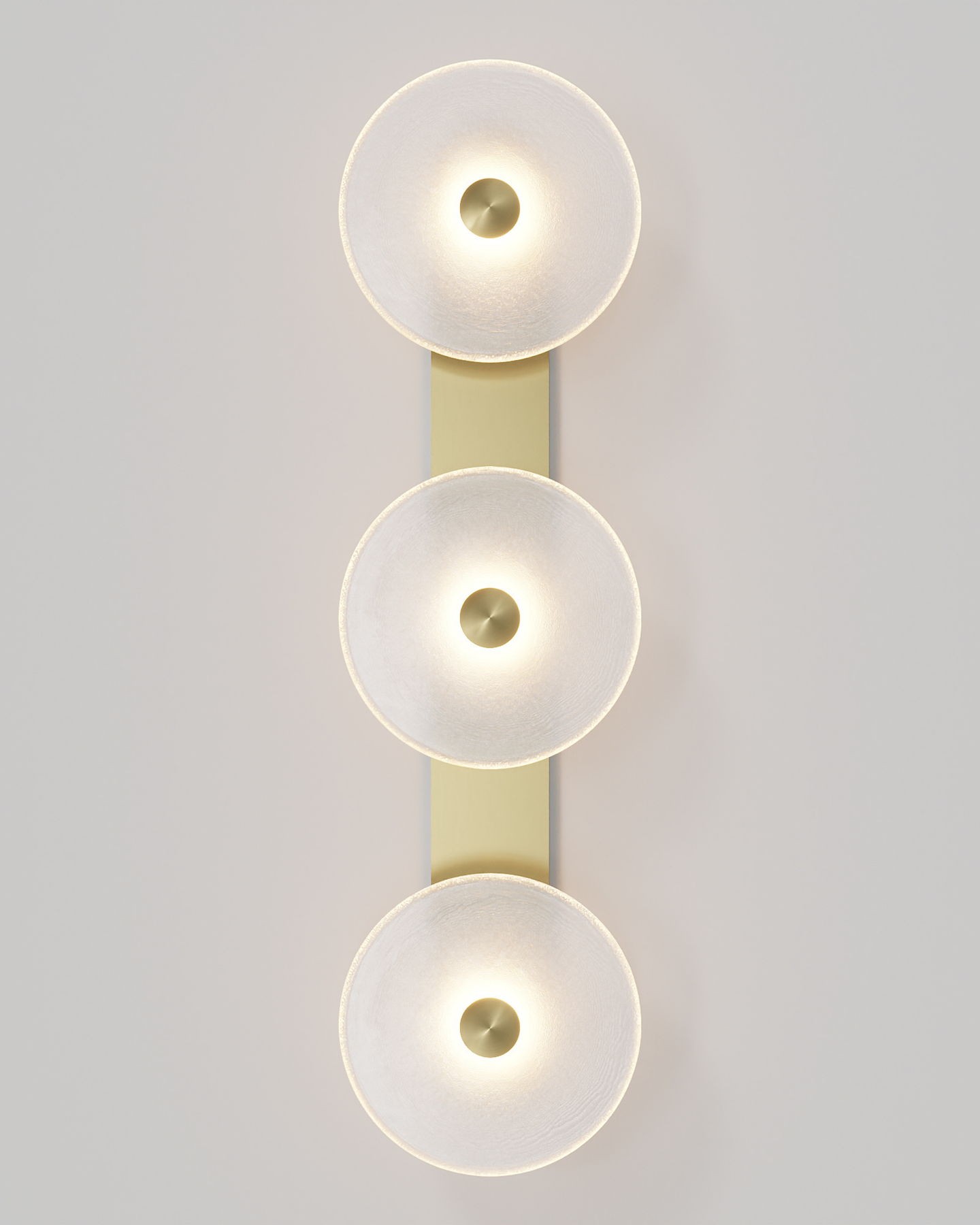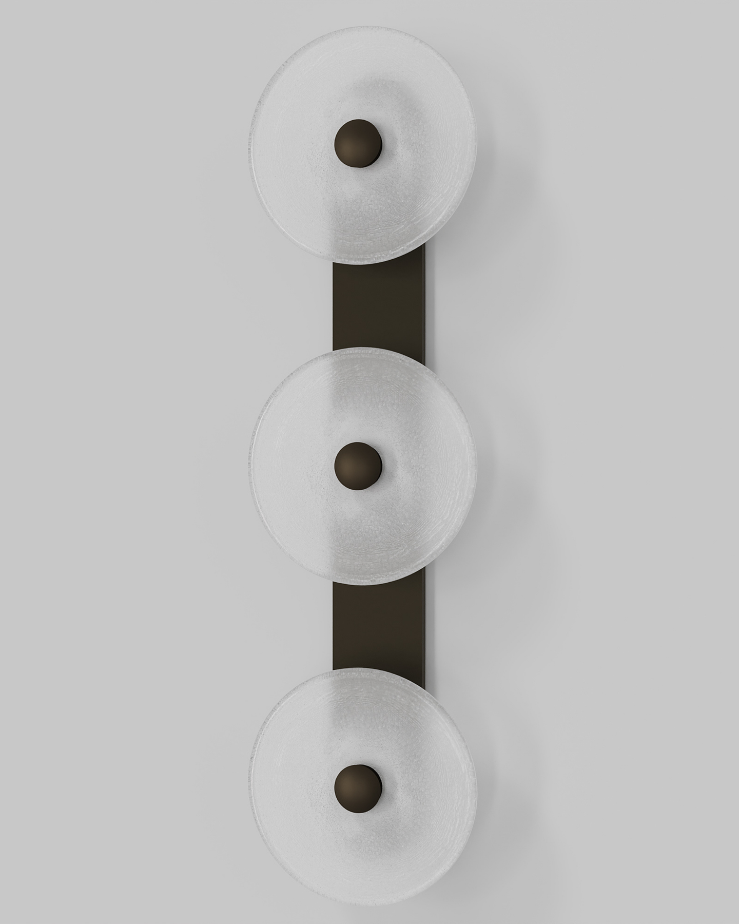 Individually handmade in Currumbin, Australia, this design is crafted from hand-blown frosted or clear Swedish glass. Designed by Oliver Höglund & Ryan Roberts, it features three discs mounted upon a sleek wall mount, making it ideal for both residential and architectural spaces. The glass is hand-blown at one thousand degrees Celsius, resulting in subtle variations that make each piece unique.